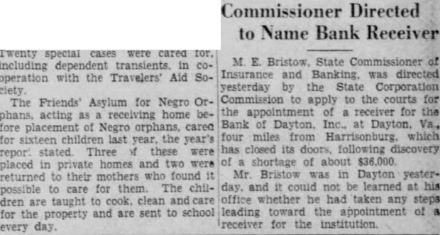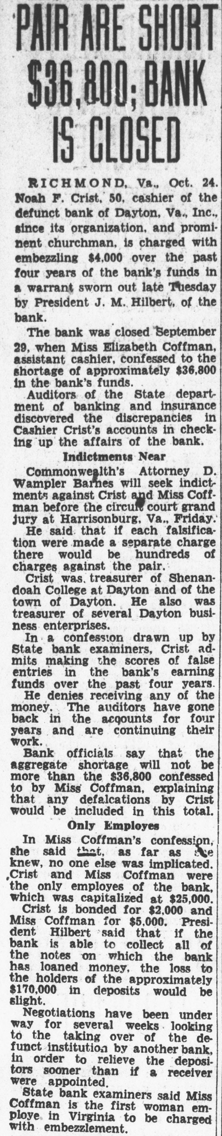 PAIR ARE SHORT $36,800; BANK IS CLOSED RICHMOND, Va., Oct. 24. Noah F. Crist, 50, cashier of the defunct bank of Dayton, Va., Inc., since its organization. and prominent churchman. is charged with embezzling $4,000 over the past four years of the bank's funds in a warrant sworn out late Tuesday by President J. M. Hilbert, of the bank. The bank was closed September 29, when Miss Elizabeth Coffman, assistant cashier, confessed to the shortage of approximately $36,800 in the bank's funds. Auditors of the State department of banking and insurance discovered the discrepancies in Cashier Crist's accounts in checking up the affairs of the bank. Indictments Near Commonwealth's Attorney D. Wampler Barnes will seek indictments against Crist and Miss Coffman before the circuit court grand jury at Harrisonburg, Va., Friday. He said that if each falsification were made a separate charge there would be hundreds of charges against the pair. Crist was. treasurer of Shenandoah College at Dayton and of the town of Dayton. He also was treasurer of several Dayton business enterprises. In a confession drawn up by State bank examiners, Crist admits making the scores of false entries in the bank's earning funds over the past four years. He denies receiving any of the money. The auditors have gone back in the accounts for four years and are continuing their work. Bank officials say that the aggregate shortage will not be more than the $36,800 confessed to by Miss Coffman, explaining that any defalcations by Crist would be included in this total. Only Employes In Miss Coffman's confession, she said that. as far as see knew, no one else was implicated. Crist and Miss Coffman were the only employes of the bank, which was capitalized at $25,000. Crist is bonded for $2,000 and Miss Coffman for $5,000. President Hilbert said that if the bank is able to collect all of the notes on which the bank has loaned money, the loss to the holders of the approximately $170,000 in deposits would be slight. Negotiations have been under way for several weeks looking to the taking over of the defunct institution by another bank, in order to relieve the depositors sooner than if a receiver were appointed. State bank examiners said Miss Coffman is the first woman employe in Virginia to be charged with embezzlement.