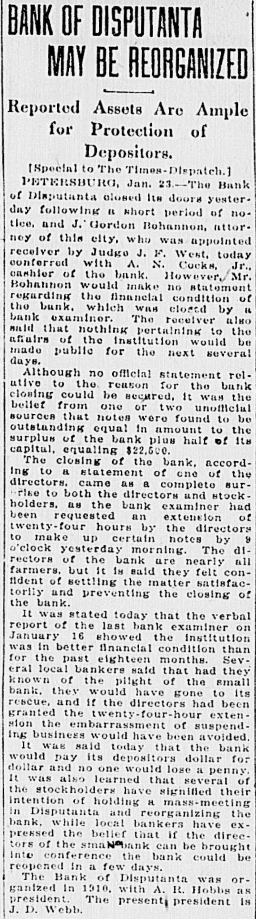 BANK OF DISPUTANTA MAY BE REORGANIZED Reported Assets Are Ample for Protection of Depositors. (Special to The Times-Dispatch.] PETERSBURG, Jan. 23.-The Bank of Disputanta closed Its doors yester. day following 11 short period of notice, and J. Gordon Bohannon, attor. noy of this city, who was appointed receiver by Judgo J. F. West, today conferred with A. N. Cocks, Jr., cashier of the bank. However, Mr. Bohannon would make no statement regarding the financial condition of the bank. which WIH closed by 16 bank examinor. The receiver also maid that nothing pertaining to the affairs of the Institution would be made public for the next several days. Although no official statement relutive to the reason for the bank closing could be secured, it was the belief from one or two unofficial sources that notes were found to be outstanding equal in amount to the surplus of the bank plus half of its capital, equaling $22,500. The closing of the bank, according to a statement of one of the directors. came as a complete surrise to both the directors and stockholders. as the bank examiner had been requested an extension of twenty-four hours by the directors to make up certain notes by 9 o'clock yesterday morning. The directors of the bank are nearly all farmers. but it 18 said they felt confident of settling the matter satisfactorily and preventing the closing of the bank. It was stated today that the verbal report of the last bank examiner on January 16 showed the institution was in better financial condition than for the past eighteen months. Several local bankers said that had they known of the plight of the small bank. they would have gone to its rescue, and if the directors had been granted the twenty-four-hour extension the embarrassment of suspending business would have been avoided. It was said today that the bank would pay its depositors dollar for dollar and no one would lose a penny. It was also learned that several of the stockholders have signified their a and the intention in Disputanta of holding reorganizing mass-meeting bank. while local bankers have expressed the belief that if the directors of the smaNDank can be brought into conference the bank could be reopened in a few days. The Bank of Disputanta was organized in 1910, with A. R. Hobbs as president. The presents president Is D. Webb.