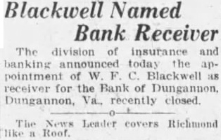 The insurance and banking today appointment Blackwell receiver for the Bank Dungannon, Dungannon, Va., recently closed. The Richmond Roof.