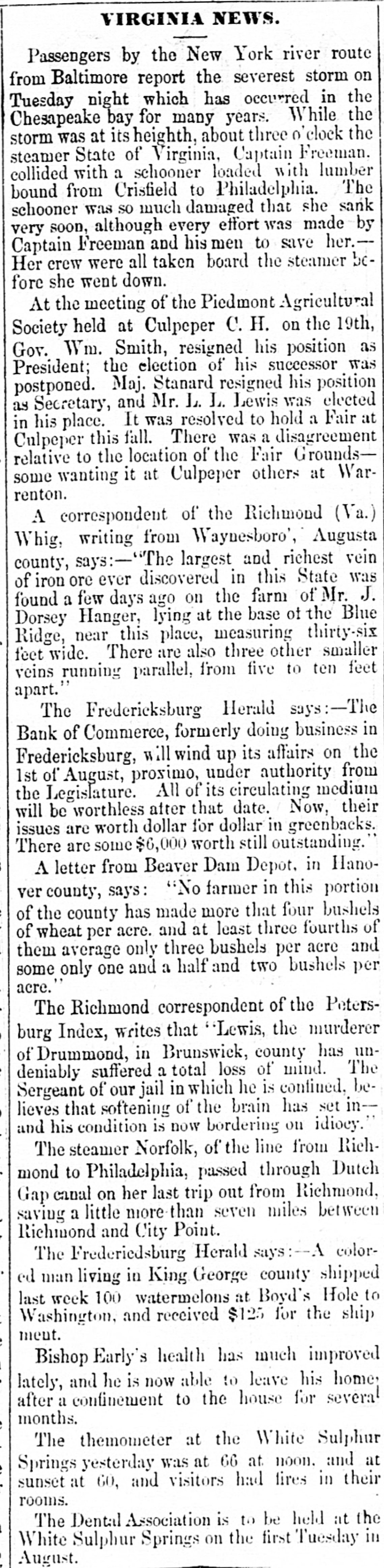 VIRGINIA NEWS. Passengers by the New York river route from Baltimore report the severest storm on Tuesday night which has occurred in the Chesapeake bay for many years. While the storm was at its heighth, about three o'clock the steamer State of Virginia, Captain Freeman. collided with a schooner loaded with lumber bound from Crisfield to Philadelphia. The schooner was SO much damaged that she sank very soon, although every effort was made by Captain Freeman and his men to save her.Her crew were all taken board the steamer before she went down. At the meeting of the Piedmont Agricultural Society held at Culpeper C. H. on the 19th, Gov. Wm. Smith, resigned his position as President; the election of his successor was postponed. Maj. Stanard resigned his position as Secretary, and Mr. L. L. Lewis was elected in his place. It was resolved to hold a Fair at Culpeper this fall. There was a disagreement relative to the location of the Fair Groundssome wanting it at Culpeper others at Warrenton. A correspondent of the Richmond (Va.) Whig, writing from Waynesboro', Augusta county, says: - "The largest and richest vein of iron ore ever discovered in this State was found a few days ago on the farm of Mr. J. at this Dorsey Ridge, near Hanger, lying place, measuring the base of the thirty-six Blue feet wide. There are also three other smaller veins running parallel, from five to ten feet apart. The Fredericksburg Herald says:-The Bank of Commerce, formerly doing business in Fredericksburg, will wind up its affairs on the 1st of August, proximo, under authority from the Legislature. All of its circulating medium will be worthless after that date. Now, their issues are worth dollar for dollar in greenbacks. There are some $6,000 worth still outstanding. A letter from Beaver Dam Depot. in Hanover county, says: "No farmer in this portion of the county has made more that four bushels of wheat per acre. and at least three fourths of them average only three bushels per acre and some only one and a half and two bushels per acre. The Richmond correspondent of the Petersburg Index, writes that "Lewis, the murderer of Drummond, in Brunswick, county has undeniably suffered a total loss of mind. The Sergeant of our jail in which he is confined, believes that softening of the brain has set inand his condition is now bordering on idiocy. The steamer Norfolk, of the line from Richmond to Philadelphia, passed through Dutch Gap canal on her last trip out from Richmond, saving a little more than seven miles between Richmond and City Point. The Frederiedsburg Herald says:-A colored man living in King George county shipped last week 100 watermelons at Boyd's Hole to Washington, and received $125 for the ship ment. Bishop Early's health has much improved lately, and he is now able to leave his home after a confinement to the house for several months. The themometer at the White Sulphur Springs yesterday was at 66 at noon. and at sunset at 60, and visitors had fires in their rooms. The Dental Association is to be held at the White Sulphur Springs on the first Tuesday in August.
