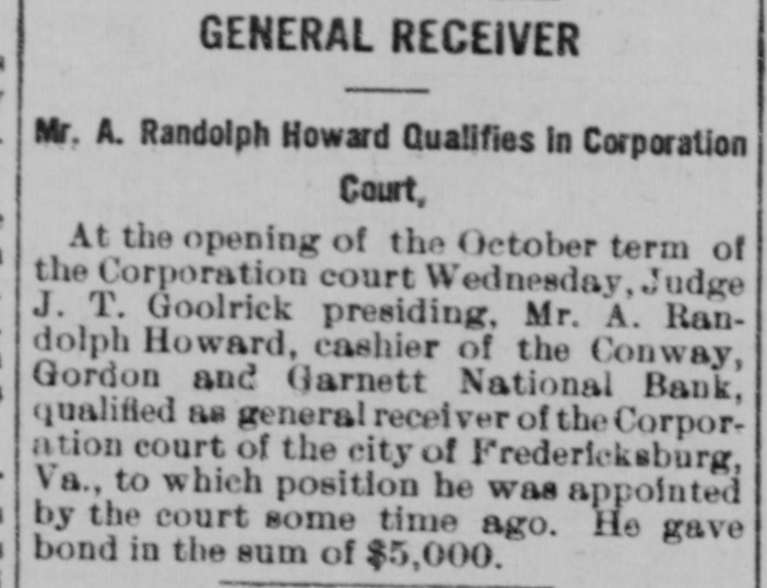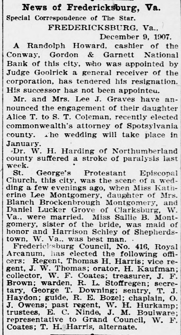 News of Fredericksburg, Va. Special Correspondence of The Star. FREDERICKSBURG, Va., December 9, 1907. A Randolph Howard, cashier of the Conway, Gordon & Garnett National Bank of this city, who was appointed by Judge Goolrick a general receiver of the corporation, has tendered his resignation. His successor has not been appointeu. Mr. and Mrs. Lee J. Graves have announced the engagement of their daughter Alice T. to S. T. Coleman, recently elected commonwealth's attorney of Spotsylvania county. The wedding will take place in January. Dr. W. H. Harding of Northumberland county suffered a stroke of paralysis last week. St. George's Protestant Episcopal Church, this city, was the scene of a wedding a few evenings ago, when Miss Katherine Lee Montgomery, daughter of Mrs. Blanch Brockenbrough Montgomery, and Daniel Lucker Grove of Clarksburg, W. Va., were married. Miss Sallie B. Montgomery, sister of the bride, was maid of honor and Harrison Schley of Shepherdstown, W. Va., was best man. Fredericksburg Council, No. 416, Royal Arcanum, has elected the following officers: Regent, Thomas H. Harris; vice regent, J. W. Thomas; orator, H. Kaufman; collector, W. F. Coates; treasurer, J. F. Brown; warden, R. L. Stoffregen; secretary, George T. Downing: sentry, T. J. Haydon; guide, R. E. Bozel; chaplain, O. J. Owens; past regent, W. H. Hurkamp; trustees, E. C. Ninde, J. M. Boulware; representative to Grand Council, W. F. Coates; T. H. Harris, alternate.