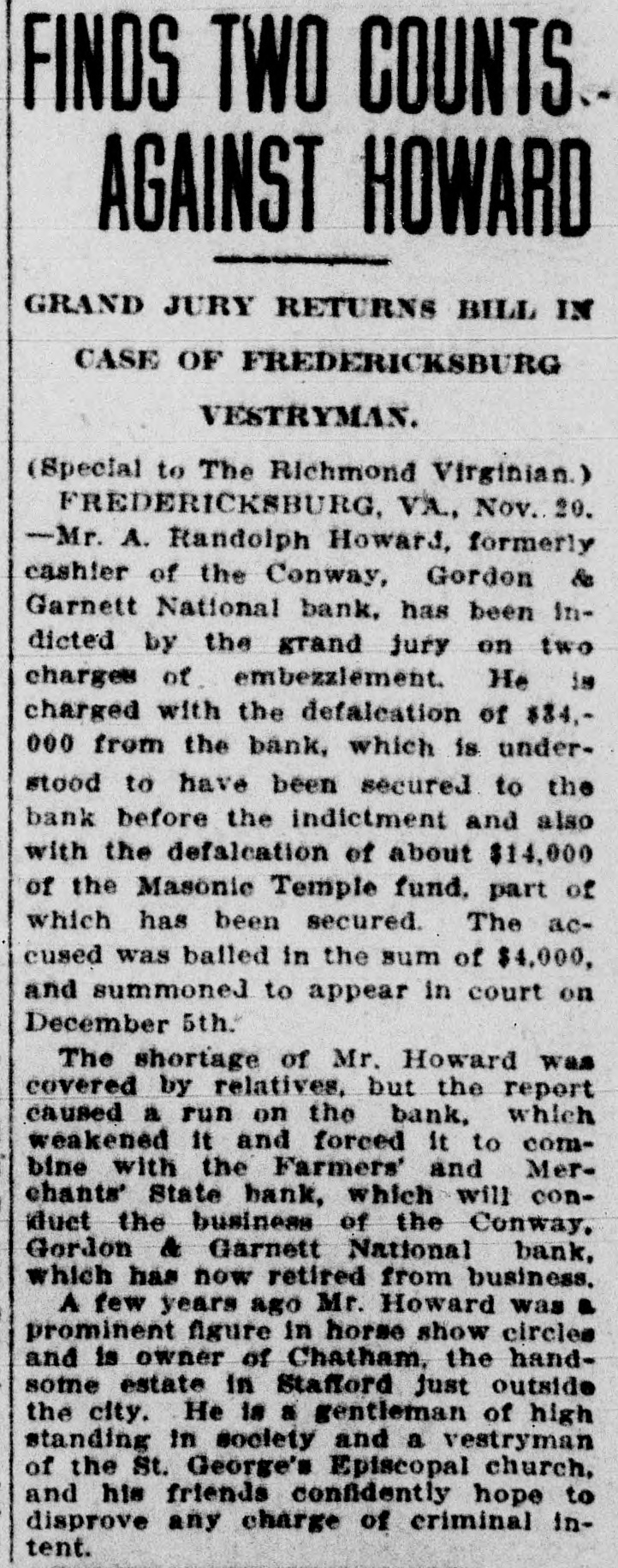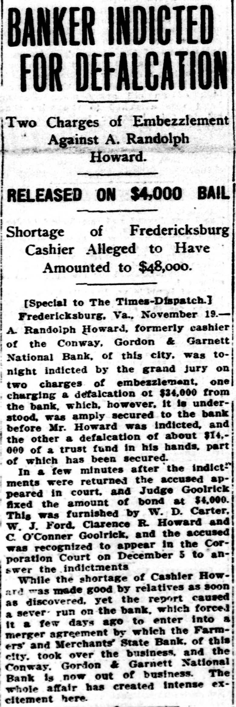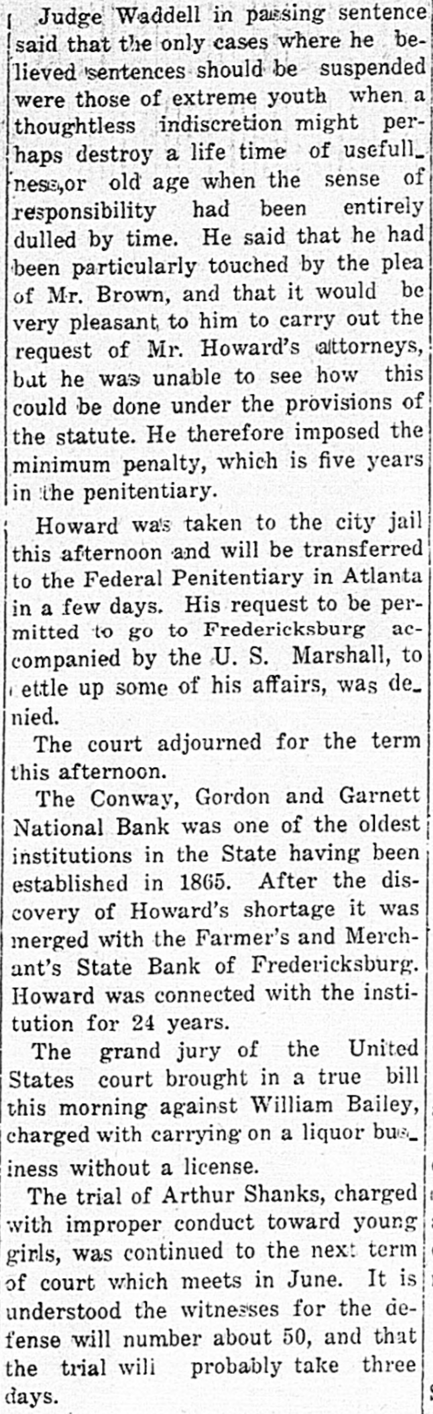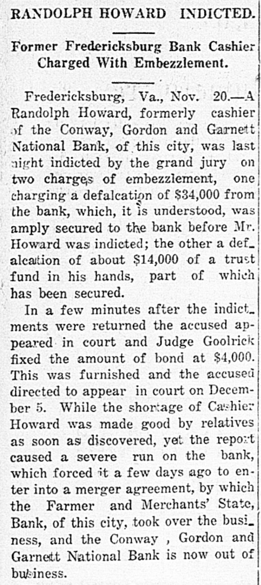 In November of 1912, the Conway, Gordon & Garnett National Bank got into trouble when depositors started run with wholesale withdrawals. Mr. Gouldman was called in, the run was checked and the affairs of the bank were taken over by the Farmers & Merchants State Bank so that every penny of deposits was made good.
