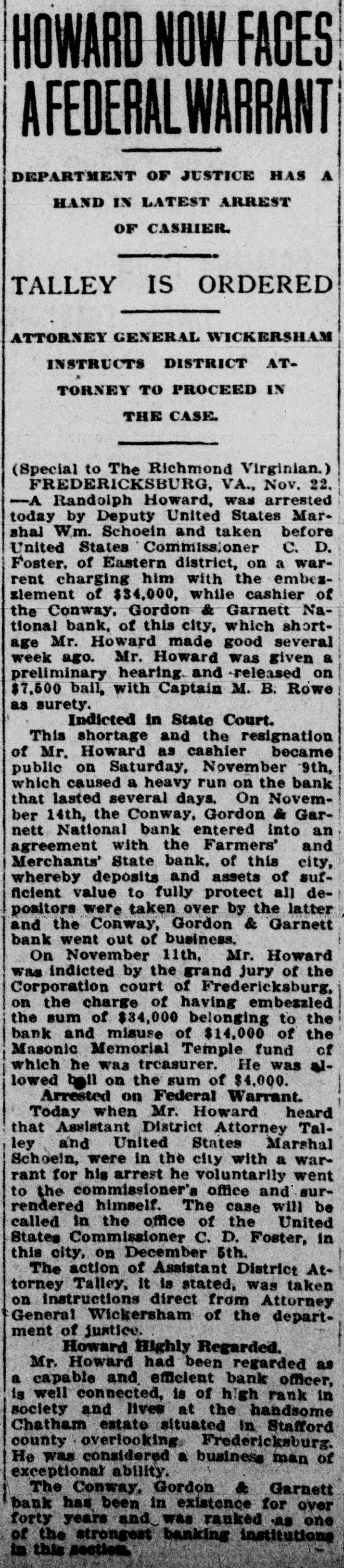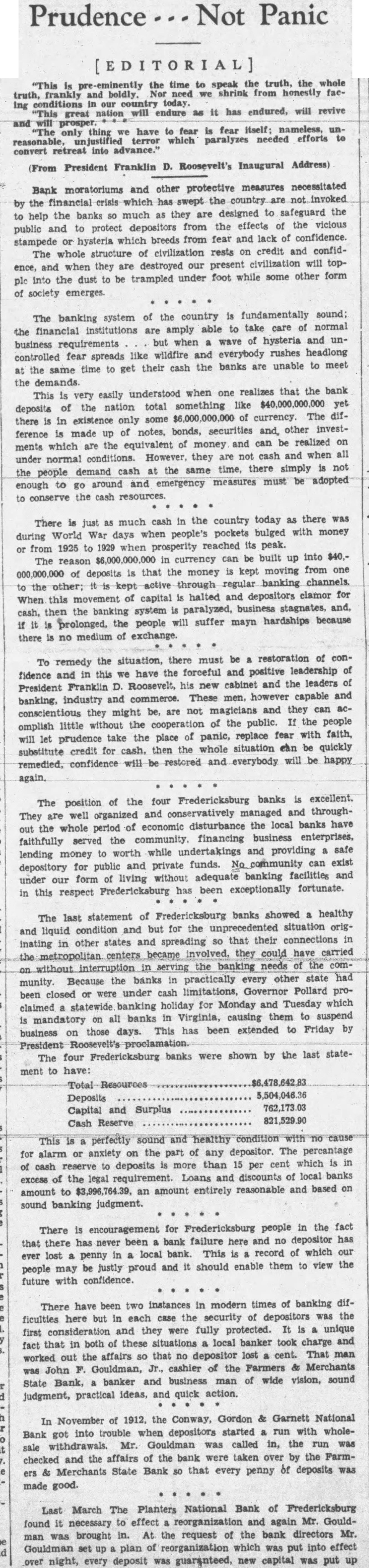 The last statement of Fredericksburg banks showed healthy and liquid condition and but for the unprecedented situation originating in other states and spreading so that their connections in the metropolitan centers became involved, they could have carried without interruption in serving the banking needs of the community. Because the banks in practically every other state had been closed or were under cash limitations, Governor Pollard proclaimed a statewide banking holiday for Monday and Tuesday which is mandatory on all banks in Virginia, causing them to suspend business on those days. This has been extended to Friday by President Roosevelt's proclamation. The four Fredericksburg banks were shown by the last statement to have:
