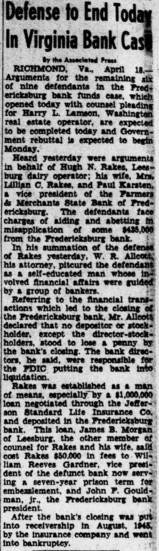 Defense to End Today In Virginia Bank Cas By the Associated Press RICHMOND, Va., April 18.Arguments for the remaining six of nine defendants in the Fredericksburg bank funds case, which opened today with counsel pleading for Harry L. Lamson, Washington real estate operator, are expected to be completed today and Government rebuttal is expected to begin Monday. Heard yesterday were arguments in behalf of Hugh N. Rakes, Leesburg dairy operator; his wife, Mrs. Lillian C. Rakes, and Paul Karsten, a vice president of the Farmers & Merchants State Bank of Fredericksburg. The defendants face charges of aiding and abetting in misapplication of some $435,000 from the Fredericksburg bank. In his summation of the defense of Rakes yesterday, W. R. Allcott, his attorney, pitcured the defendant as a self-educated man whose involved financial affairs were guided by a group of bankers. Referring to the financial transactions which led to the closing of the Fredericksburg bank, Mr. Allcott declared that no depositor or stockholder, except the director-stockholders, stood to lose a penny by the bank's closing. The bank directors, he said, were responsible for the FDIC putting the bank into liquidation. Rakes was established as a man of means, especially by a $1,000,000 loan negotiated through the Jefferson Standard Life Insurance Co. and deposited in the Fredericksburg bank. This loan, James B. Morgan of Leesburg. the other member of counsel for Rakes and his wife, said cost Rakes $50,000 in fees to William Reeves Gardner, vice president of the defunct bank now serving a seven-year prison term for embezzlement, and John F. Gouldman, jr., the Fredericksburg bank president. After the bank's closing was put into receivership in August, 1945, by the insurance company and went into bankruptcy.
