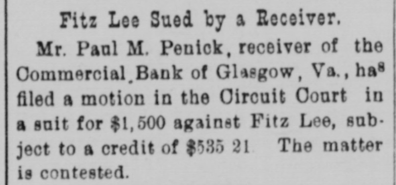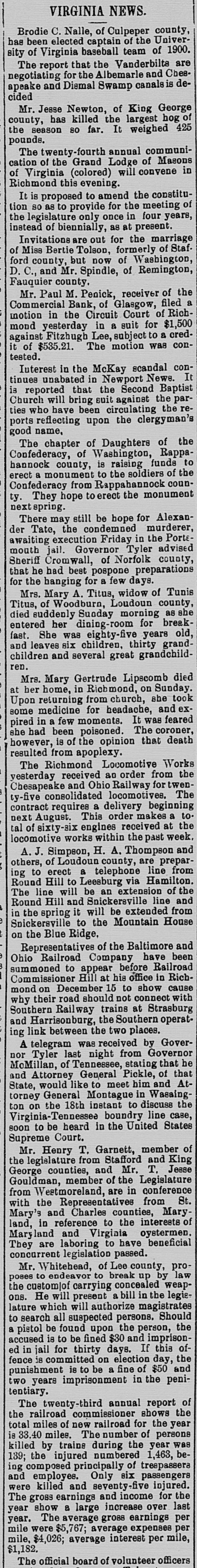 VIRGINIA NEWS. Brodie C. Nalle, of Culpeper county, has been elected captain of the University of Virginia baseball team of 1900. The report that the Vanderbilts are negotiating for the Albemarle and Chesapeake and Dismal Swamp canalsis decided Mr. Jesse Newton, of King George county, has killed the largest hog of the season 80 far. It weighed 425 pounds. The twenty-fourth annual communication of the Grand Lodge of Masons of Virginia (colored) will convene in Richmond this evening. It is proposed to amend the constitution S0 as to provide for the meeting of the legislature only once in four years, instead of biennially, as at present. Invitations are out for the marriage of Miss Bertie Tolson, formerly of Stafford county, but now of Washington, D. C., and Mr. Spindle, of Remington, Fauquier county. Mr. Paul M. Penick, receiver of the Commercial Bank, of Glasgow, filed a motion in the Circuit Court of Richmond yesterday in a suit for $1,500 against Fitzhugh Lee, subject to a credit of $535.21. The motion was contested. Interest in the McKay scandal continues unabated in Newport News. It is reported that the Second Baptist Church will bring suit against the parties who have been circulating the reports reflecting upon the clergyman's good name, The chapter of Daughters of the Confederacy, of Washington, Rappahannock county, is raising funds to erect a monument to the soldiers of the Confederacy from Rappahannock county. They hope to erect the monument nextspring. There may still be hope for Alexander Tate, the condemned murderer, awaiting execution Friday in the Portemouth jail. Governor Tyler advised Sheriff Cromwall, of Norfolk county, that he had best pospone preparations for the hanging for B few days. Mrs. Mary A. Titus, widow of Tunis Titus, of Woodburn, Loudoun county, died suddenly Sunday morning as she entered her dining-room for breakfast. She was eighty-five years old, and leaves six children, thirty grandchildren and several great grandchildren. Mrs. Mary Gertrude Lipscomb died at her home, in Richmond, on Sunday. Upon returning from church, she took some medicine for headache, and expired in a few moments. It was feared she had been poisoned. The coroner, however, is of the opinion that death resulted from apoplexy. The Richmond Locomotive Works yesterday received ao order from the Chesapeake and Ohio Railway for twenty-five consolidated locomotives. The contract requires a delivery beginning next August. This order makes a to. tal of sixty-six engines received at the locomotive works within the past week. A. J. Simpson, H. A. Thompson and others, of Loudoun county, are preparing to erect a telephone line from Round Hill to Leesburg via Hamilton. The line will be an extension of the Round Hill and Snickersville line and in the spring it will be extended from Snickersville to the Mountain House on the Blue Ridge, Representatives of the Baltimore and Ohio Railroad Company have been summoned to appear before Railroad Commissioner Hill at his office in Richmond on December 15 to show cause why their road should not connect with Southern Railway trains at Strasburg and Harrisonburg, the Southern operating link between the two places. A telegram was received by Governor Tyler last night from Governor MoMillan, of Tennessee, stating that he and Attorney General Pickle, of that State, would like to meet him and Attorney General Montague in Wasaington on the 18th instant to discuss the Virginia-Tennessee boundry line case, soon to be heard in the United States Supreme Court. Mr. Henry T. Garnett, member of the legislature from Stafford and King George counties, and Mr. T. Jesse Gouldman, member of the Legislature from Westmoreland, are in conference with the Representatives from St. Mary's and Charles counties, Maryland, in reference to the interests of Maryland and Virginia oystermen. They are laboring to have beneficial concurrent legislation passed. Mr. Whitehead, of Lee county, proposes to endeavor to break up by law the custom[of carrying concealed weapons. He will present a bill in the legislature which will authorize magistrates to search all suspected persons. Should a pistol be found upon the person, the accused is to be fined $30 and imprisoned in jail for thirty days. If this offence is committed on election day, the punishment is to be a fine of $50 and two years imprisonment in the penitentiary. The twenty-third annual report of the railroad commissioner shows the total miles of new railroad for the year 22 Th of persons