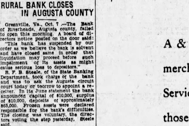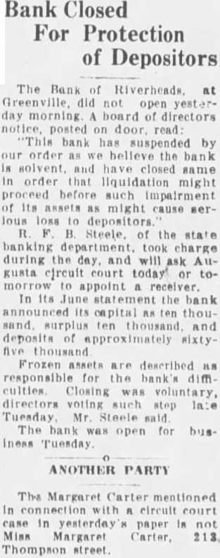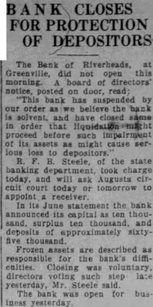 CLOSES FOR PROTECTION OF DEPOSITORS The Bank of Riverheads, Greenville, did not open this morning. board directors' notice, on door, read; "This bank suspended order the bank solvent, and have closed same order that proceed before such impairment its assets might cause serloss depositors. Steele, the state banking department, took charge today, will ask Augusta cuit court today tomorrow to appoint receiver. In its June statement the bank announced its capital ten thousand, surplus ten thousand, and deposits of approximately sixtyfive thousand. Frozen assets are described responsible the bank's difficulties. Closing was voluntary, directors such yesterday, Mr. Steele The bank open yesterday.