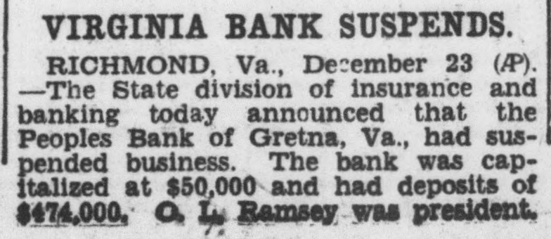 Multiple AP articles (dated Dec 23, 1930) report the Peoples Bank of Gretna, Va. 'had suspended business' and that a state examiner was sent to take charge. No articles mention a reopening; classification = suspension leading to closure/receivership (state took charge).