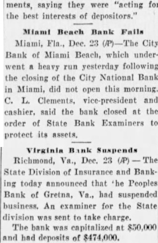 ments, saying they were "acting for the best interests of depositors." Miami Beach Bank Fails Miami, Fla., Dec. 23 (AP)-The City Bank of Miami Beach, which underwent a heavy run yesterday following the closing of the City National Bank in Miami, did not open this morning. C. L. Clements, vice-president and cashier. said the bank closed at the order of State Bank Examiners to protect its assets. Virginia Bank Suspends Richmond, Va., Dec. 23 (AP) The State Division of Insurance and Banking today announced that he Peoples Bank of Gretna, Va., had suspended business. An examiner for the State division was sent to take charge. The bank was capitalized at $50,000 and had deposits of $474,000.