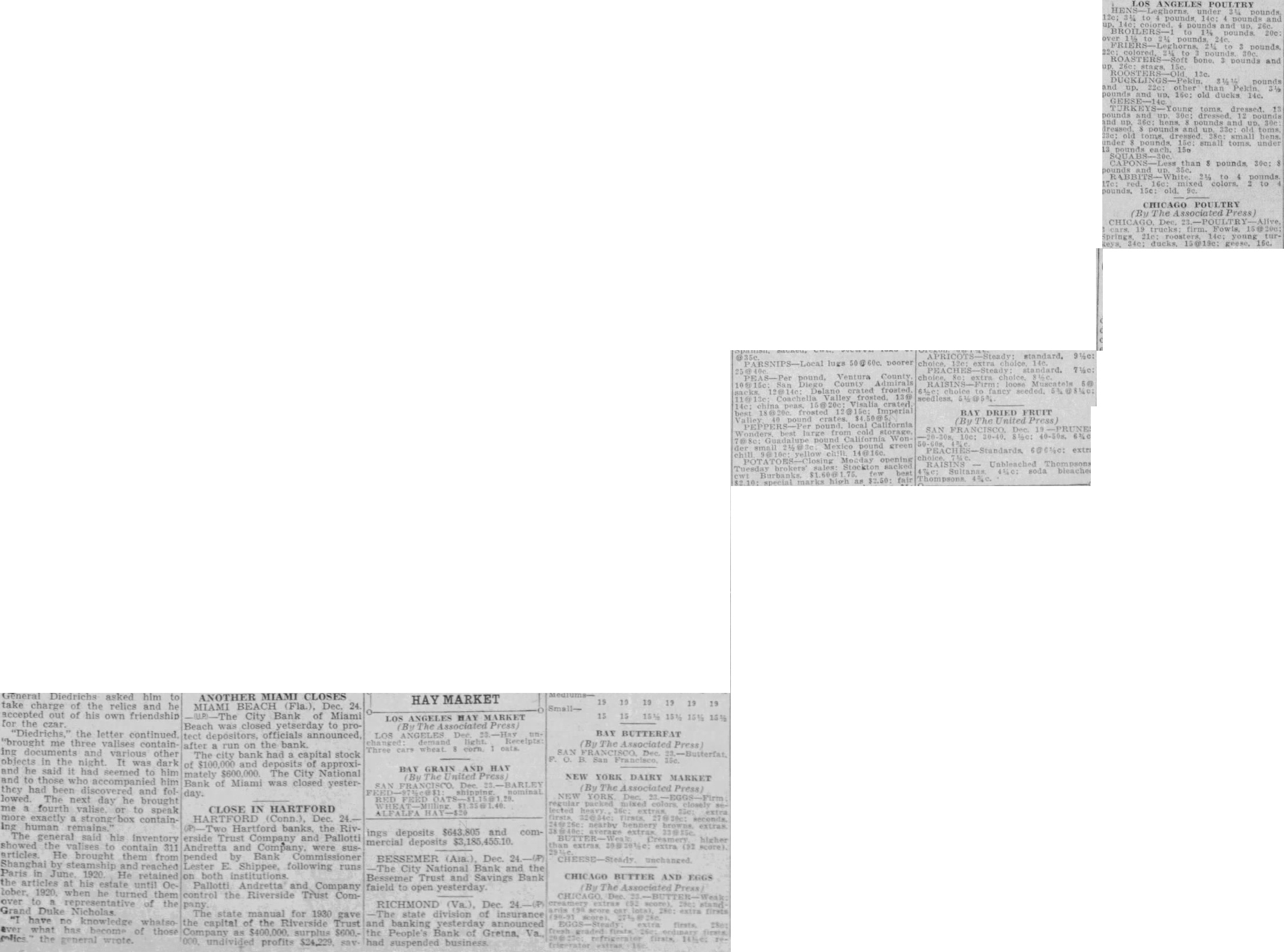 LOS ANGELES demand wheat czar Beach was closed yetserday to pro"Diedrichs, the letter continued officials BAY BUTTERFAT "brought me contain- (By The Associated run on the bank ing and various other The bank had capital stock objects in the It San night was dark of $100,000 and of approxiBAY GRAIN AND HAY and he said it had seemed to him NEW YORK DAIRY MARKET and to accompanied him SAN Dec BARLEY they had and fol- The Press) NEW YORK lowed next day he brought mixed me fourth valise speak more exactly strong box containIng human nearby extras remains ings deposits $643,805 and comshowed The general said his inventory deposits $3,185,455.10. higher the valises 311 extra contain articles He brought them from pended Bank Steady Shanghai reached E. Shippee, following runs The City National Bank the Paris June 1920 He retained on both institutions CHICAGO BUTTER AND EGGS Bessemer Trust and Savings Bank the articles at his estate until OcPallotti Andretta and Company faield to open yesterday By The lober, 1920 when he turned control the Riverside Trust Com- Dec over representative of the RICHMOND (Va.), Dec. 24 Grand Duke Nicholas The state manual for 1930 gave The state division of insurance have knowledge whatsothe capital the Riverside Trust and banking yesterday announced what has become of those as surplus $600.- the People's Bank of Gretna, Va., profits had suspended business BAY DRIED FRUIT small CHICAGO POULTRY 16c.