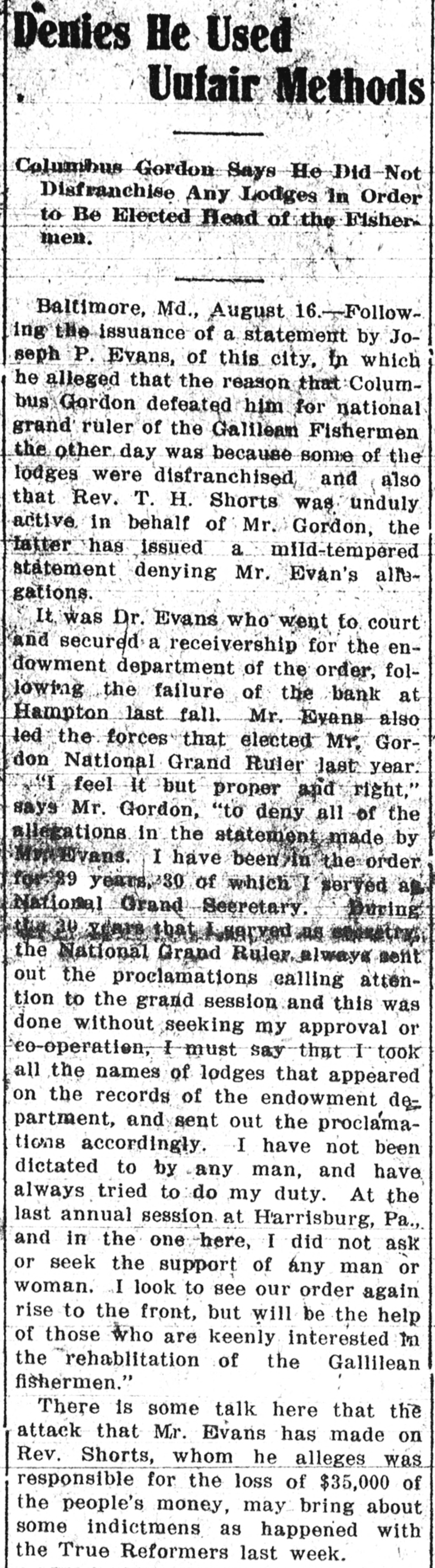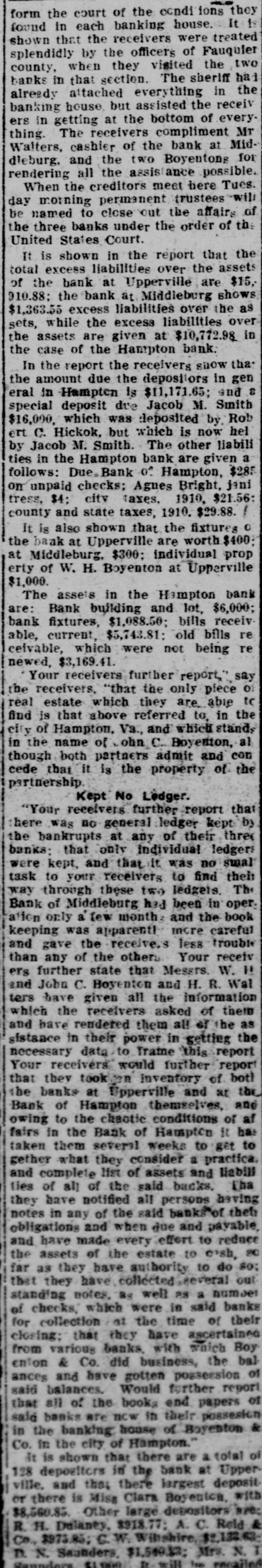 banks in that section. The sheriff has already attached everything in the banking house, but assisted the receiv ers in getting at the bottom of everything. The receivers compliment Mr Walters, cashier of the bank at Middieburg, and the two Boyentons for rendering all the assistance possible. When the creditors meet here Tues. day morning permanent trustees will be named to close out the affairs of the three banks under the order of the United States Court. It is shown in the report that the total excess liabilities over the assets of the bank at Upperville are $15, 910.88; the bank at Middleburg shows $1,363.55 excess liabilities over the as sets, while the excess liabilities over the assets are given at $10,772.98 in the case of the Hampton bank. In the report the receivers show tha the amount due the depositors in gen eral in Hampten is $11,171.65; and a special deposit due Jacob M. Smith $16,000, which was deposited by Rob ert C. Hickok, but which is now hel by Jacob M. Smith. The other liabili ties in the Hampton bank are given a follows: Due. Bank of Hampton, $285 on unpaid checks; Agnes Bright, jani tress, $4; city taxes. 1910, $21.56: county and state taxes, 1910. $29.88. / It is also shown that the fixtures 0 the bank at Upperville are worth $400; at Middleburg, $300; individual prop erty of W. H. Boyenton at Upperville $1,000. The assets in the Hompton bank are: Bank building and lot, $6,000; bank fixtures, $1,088.50; bills receivable, current, $5,743.81: old bills re ceivable, which were not being re newed, $3,169.41. Your receivers further report," say the receivers, "that the only piece 0; real estate which they are able to find is that above referred to, in the city of Hampton, Va., and which stands in the name of John C., Boyenton, al though both partners admit and con cede that it is the property of the partnership. Kept No Ledger. "Your receivers further report that here was no general ledger kept by the bankrupts at any of their three banks: that only individual ledgers were kept, and that it was no smal task to your receivers to find their way through these two ledgets. The Bank of Middleburg had been in oper. atton only a few month. and the book keeping was apparent] more careful and gave the receive.s less trouble than any of the others Your receiv ers further state that Messrs. W. H and John C. Boyenton and H. R. Wal ters have given all the information which the receivers asked of them and have rendered them all of the as sistance in their power in getting the necessary data to Traine this report Your receivers. would further report that they took on inventory of botl the banks at Upperville and at the Bank of Hampton themselves, and owing to the chaotic conditions of at fairs in the Bank of Hampton it has taken them several weeks to get to gether what they consider a practica, and complete list of assets and liabili ties of al] of the said backs. Tha they have notified all persons having notes in any of the said banks of thet obligations and when due and payable, and have made every effort to reduce the assets of the estate to c'sh, so far as they have authority to do so: that they have collected several out standing notes, as well as a number of checks, which were in said banks for collection at the time of their closing: that they have ascertained from various banks. with which Boy enton & Co. did business, the bal ances and have gotten possession of said balances. Would further report that all of the books end papers of said banks are now in their possesion the - house, assention