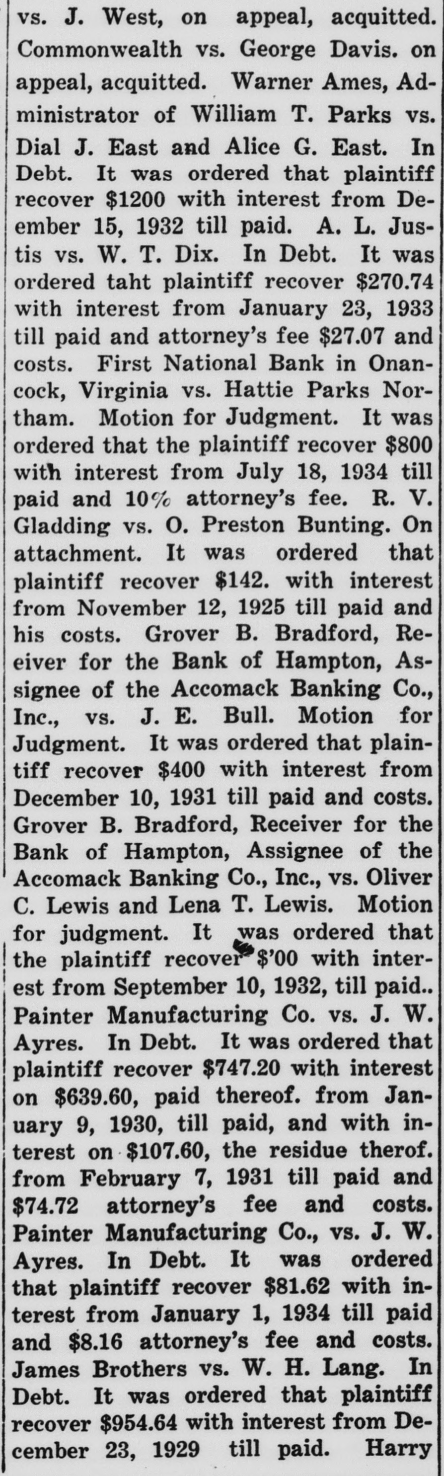 vs. J. West, on appeal, acquitted. Commonwealth vs. George Davis. on appeal, acquitted. Warner Ames, Administrator of William T. Parks vs. Dial J. East and Alice G. East. In Debt. It was ordered that plaintiff recover $1200 with interest from December 15, 1932 till paid. A. L. Justis vs. W. T. Dix. In Debt. It was ordered taht plaintiff recover $270.74 with interest from January 23, 1933 till paid and attorney's fee $27.07 and costs. First National Bank in Onancock, Virginia vs. Hattie Parks Northam. Motion for Judgment. It was ordered that the plaintiff recover $800 with interest from July 18, 1934 till paid and 10% attorney's fee. R. V. Gladding vs. O. Preston Bunting. On attachment. It was ordered that plaintiff recover $142. with interest from November 12, 1925 till paid and his costs. Grover B. Bradford, Receiver for the Bank of Hampton, Assignee of the Accomack Banking Co., Inc., vs. J. E. Bull. Motion for Judgment. It was ordered that plaintiff recover $400 with interest from December 10, 1931 till paid and costs. Grover B. Bradford, Receiver for the Bank of Hampton, Assignee of the Accomack Banking Co., Inc., vs. Oliver C. Lewis and Lena T. Lewis. Motion for judgment. It was ordered that the plaintiff recover $'00 with interest from September 10, 1932, till paid.. Painter Manufacturing Co. vs. J. W. Ayres. In Debt. It was ordered that plaintiff recover $747.20 with interest on $639.60, paid thereof. from January 9, 1930, till paid, and with interest on $107.60, the residue therof. from February 7, 1931 till paid and $74.72 attorney's fee and costs. Painter Manufacturing Co., vs. J. W. Ayres. In Debt. It was ordered that plaintiff recover $81.62 with interest from January 1, 1934 till paid and $8.16 attorney's fee and costs. James Brothers vs. W. H. Lang. In Debt. It was ordered that plaintiff recover $954.64 with interest from December 23, 1929 till paid. Harry