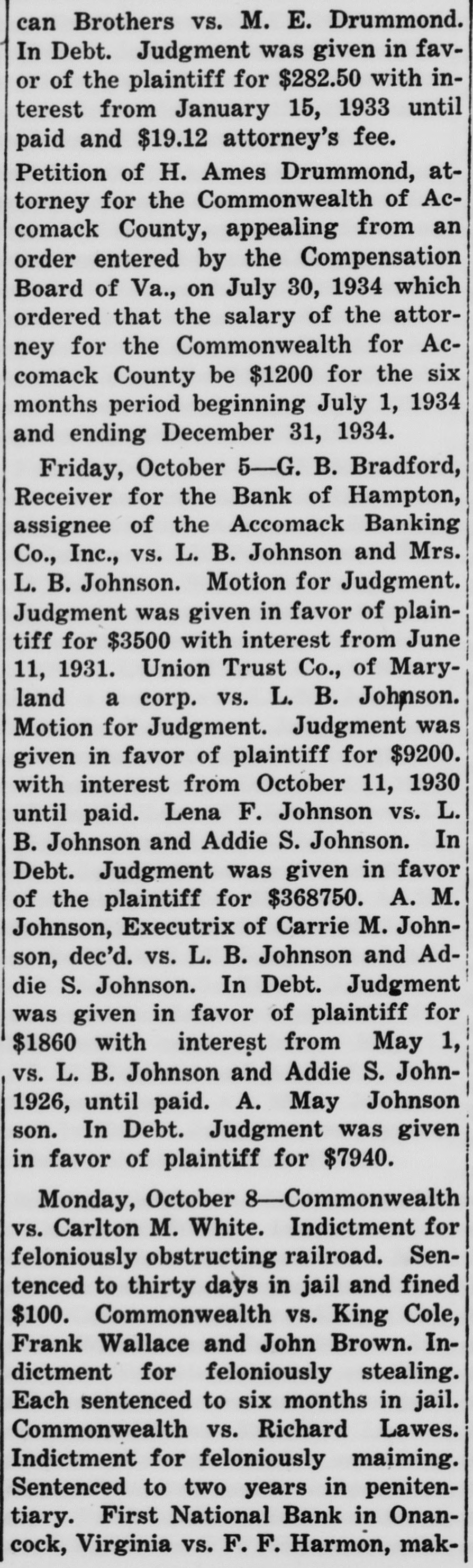 can Brothers vs. M. E. Drummond. In Debt. Judgment was given in favor of the plaintiff for $282.50 with interest from January 15, 1933 until paid and $19.12 attorney's fee. Petition of H. Ames Drummond, attorney for the Commonwealth of Accomack County, appealing from an order entered by the Compensation Board of Va., on July 30, 1934 which ordered that the salary of the attorney for the Commonwealth for Accomack County be $1200 for the six months period beginning July 1, 1934 and ending December 31, 1934. Friday, October 5-G. B. Bradford, Receiver for the Bank of Hampton, assignee of the Accomack Banking Co., Inc., vs. L. B. Johnson and Mrs. L. B. Johnson. Motion for Judgment. Judgment was given in favor of plaintiff for $3500 with interest from June 11, 1931. Union Trust Co., of Maryland a corp. vs. L. B. Johnson. Motion for Judgment. Judgment was given in favor of plaintiff for $9200. with interest from October 11, 1930 until paid. Lena F. Johnson vs. L. B. Johnson and Addie S. Johnson. In Debt. Judgment was given in favor of the plaintiff for $368750. A. M. Johnson, Executrix of Carrie M. Johnson, dec'd. vs. L. B. Johnson and Addie S. Johnson. In Debt. Judgment was given in favor of plaintiff for $1860 with interest from May 1, vs. L. B. Johnson and Addie S. John1926, until paid. A. May Johnson son. In Debt. Judgment was given in favor of plaintiff for $7940. Monday, October 8-Commonwealth vs. Carlton M. White. Indictment for feloniously obstructing railroad. Sentenced to thirty days in jail and fined $100. Commonwealth vs. King Cole, Frank Wallace and John Brown. Indictment for feloniously stealing. Each sentenced to six months in jail. Commonwealth vs. Richard Lawes. Indictment for feloniously maiming. Sentenced to two years in penitentiary. First National Bank in Onancock, Virginia vs. F. F. Harmon, mak-