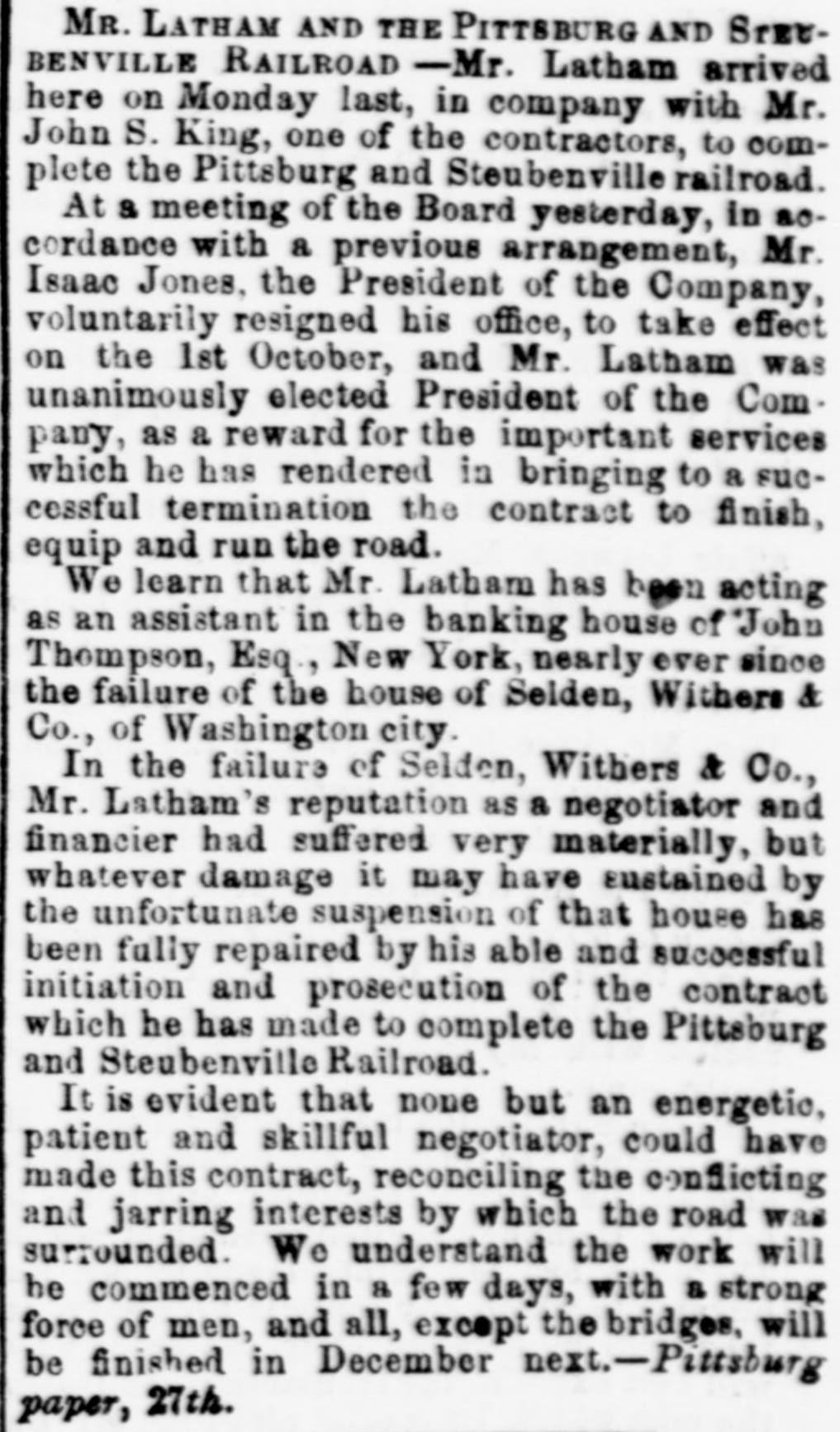 MR. LATHAM AND THE PITTSBURG AND SreeBENVILLE RAILROAD -Mr. Latham arrived here on Monday last, in company with Mr. John S. King, one of the contractors, to complete the Pittsburg and Steubenville railroad. At a meeting of the Board yesterday, in socordance with a previous arrangement, Mr. Isaac Jones. the President of the Company, voluntarily resigned his office, to take effect on the 1st October, and Mr. Latham was unanimously elected President of the Company, as a reward for the important services which he has rendered in bringing to a successful termination the contract to finish, equip and run the road. We learn that Mr. Latham has been acting as an assistant in the banking house of John Thompson, Esq., New York, nearly ever since the failure of the house of Selden, Withers & Co., of Washington city. In the failure of Selden, Withers & Co., Mr. Latham's reputation as a negotiator and financier had suffered very materially, but whatever damage it may have sustained by the unfortunate suspension of that house has been fully repaired by his able and successful initiation and prosecution of the contract which he has made to complete the Pittsburg and Steubenville Railroad. It is evident that none but an energetic, patient and skillful negotiator, could have made this contract, reconciling the conflicting and jarring interests by which the road was surrounded. We understand the work will he commenced in a few days, with a strong force of men, and all, except the bridges, will be finished in December Pittsburg paper, 27th.