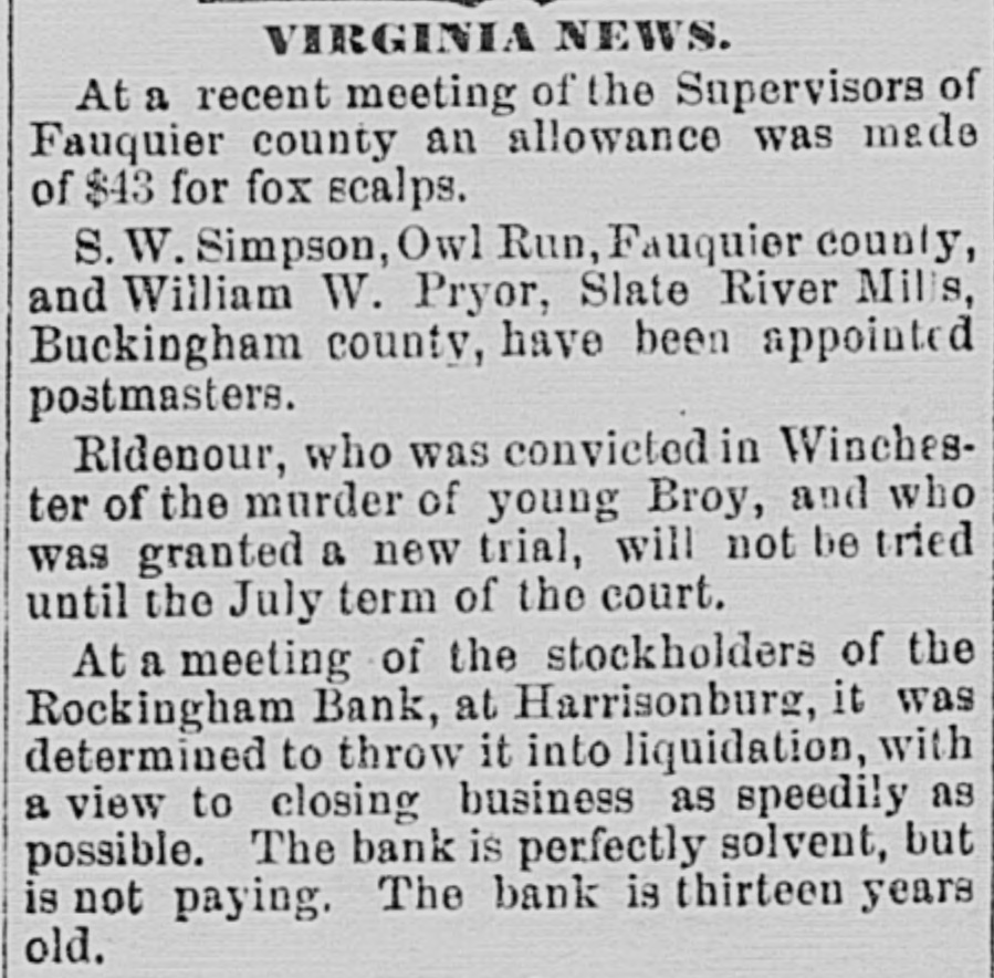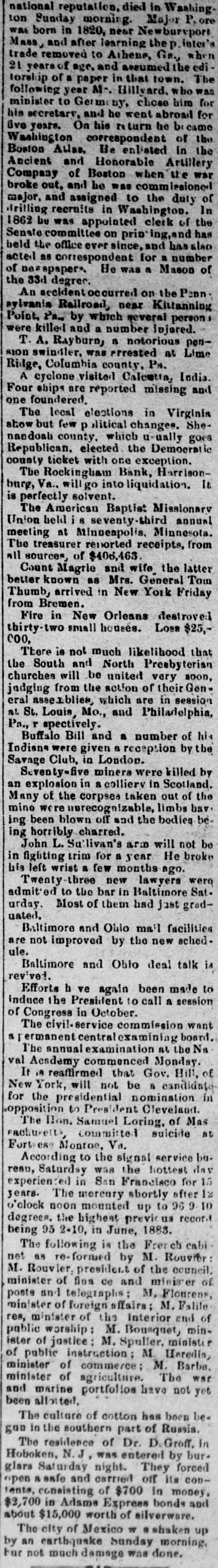 eunday morning. Major P. ore was born in 1820, near Newburvport Mass, and after learning the inter's trade removed to Athene, Ga, when 21 years of age, and assumed the editorship of a paper in that town. The following year M-. Hillyard. who was minister to Germ: chose him for his secretary, and he went abroad for live years. On his It turn he be came Washington correspondent of the Boston Atlas. He enlisted in the Ancient and Honorable Artillery Company of Boston when the war broke out, and he was commissioned major, and assigned to the duty of drilling recruits in Washington. In 1862 be was appointed clerk of the Senate committee on prin' ing,and has held the office ever since, and has also acted as correspondent for a number of newspapers. He was a Mason of the 33d degree. An accidentoccurred on the Penn. sylvania Railroad, near Kittanning Point, Pa.. by which several person were killed and a number injored. T. A. Rayburn, a notorious pension swindler, was prrested at Lime Ridge, Columbia county, Ps. A cyclone visited Calcutta, India. Four ships are reported missing and one foundered. The local elections in Virginia show but few p ,litical changes. Shenandoah county, which usually goes Republican, elected the Democratic county ticket with one exception. The Rockingham Bank, Harrisonburg, Va., will go into liquidation. It is perfectly solvent. The American Baptist Missionary Union held i 8 seventy-third annual meeting at Minneapolis, Minnesota. The treasurer reported receipts, from all sources, of $406,463. Count Magrie and wife the latter better known as Mrs. General Tom Thumb, arrived in New York Friday from Bremen. Fire in New Orleans destroved thirty-two small houses. Loss $25,COO, There is not much likelihood that the South and North Presbyterian churches will be united very soon, judging from the action of their Gen, eral asse blies, which are in session at St. Louis, Mo., and Philadelphia, Pa., r spectively. Buffalo Bill and a number of his Indians were given a reception by the Savage Club, in London. Seventy-five miners were killed by an explosion in a collierv in Scotland. Many of the corpses taken out of the mine were unrecognizable, limbs hav. ing been blown off and the bodies being horribly charred. John L. Sullivan's arm will not be in fighting trim for a year He broke his left wrist a few months ago. Twenty-three new lawyers were admited to the bar in Baltimore Sat. urday. Most of them had just graduated. Baltimore and Ohio mail facilities are not improved by the new schedule. Baltimore and Obio deal talk is revived. Efforts h ve again been made to induce the President to call a session of Congress in October. The civil-service commission want a ermanent central examining board. The annual examination at, the Na val Academy commenced Monday. It 18 reaffirmed that Gov. Hill, of New York, will not be & candidate for the presidential nomination in opposition to President Cleveland. The Hon. Samuel Loring, of Mas Fachuretts, committed suicide at Fortwess Montoe, Va. According to the signal service bureau, Saturday was the hottest day experienced in San Francisco for 15 years. The mercury shortly after 12 o'clock noon mounted up to 96 9 10 degrees. the highest previo us record being 95 2.10, in June, 1883. The following is the French cabi net as re-formed by M. Rouvier M. Rouvier, president of the council: minister of fina ce and minister of posts and telegraphs; M, Flourens, minister of foreign affairs; M. Falile res, minister of the Interior end of public worship ; M. Bousquet, minleter of justice ; M. Spuller, ministe of public instruction; M. Heredia, minister of commerce: M. Barbe. minister of agriculture. The war and marine portfolios have not yet been alloited, The culture of cotton has been be gun in the southern part of Russia. The residence of Dr. Groff. in Hoboken, N.J, was entered by bur. glars Saturday night. They forced open a safe and carried off its contents, consisting of $700 in money, $2,700 in Adams Express bonds and about $15,000 worth of silverware,