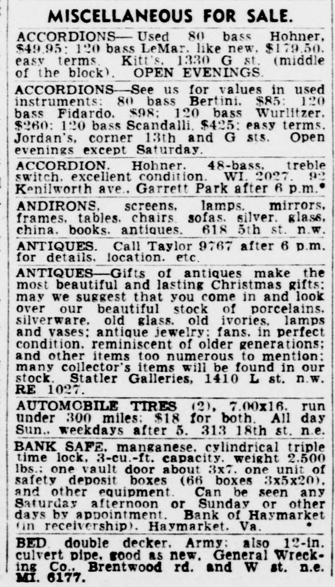 MISCELLANEOUS FOR SALE. ACCORDIONS Used 80 bass Hohner, $49.95; 120 bass LeMar. like new. $179.50. easy terms Kitt's 1330 G st. (middle of the block) OPEN EVENINGS. ACCORDIONS See us for values in used instruments: 80 bass Bertini. $85: 120 bass Fidardo. $98; 120 bass Wurlitzer. $260: 120 bass Scandalli, $425: easy terms. Jordan's, corner 13th and G sts. Open evenings except Saturday. ACCORDION. Hohner. 48-bass. treble switch. excellent condition. WI. 2027 92 Kenilworth ave., Garrett Park after 6 p.m. ANDIRONS. screens. lamps. mirrors. frames. tables. chairs sofas. silver. glass, china. books. antiques. 618 5th st. n.w. ANTIQUES. Call Taylor 9767 after 6 p.m. for details. location. etc. ANTIQUESGifts of antiques make the most beautiful and lasting Christmas gifts: may we suggest that you come in and look over our beautiful stock of porcelains. silverware. old glass. old ivories. lamps and vases: antique jewelry: fans. in perfect condition. reminiscent of older generations; and other items too numerous to mention: many collector's items will be found in our stock. Statler Galleries, 1410 L st. n.w. RE 1027. AUTOMOBILE TIRES (2), 7.00x16. run under 300 miles: $18 for both. All day Sun.. weekdays after 5. 313 18th st. n.e. BANK SAFE. manganese. cylindrical triple time lock, 3-cu.-ft. capacity. weight 2.500 lbs.: one vault door about 3x7. one unit of safety deposit boxes (66 boxes 3x5x20), and other equipment Can be seen any Saturday afternoon or Sunday or other days by appointment. Bank of Haymarket (in receivership). Haymarket. Va. BED double decker. Army: also 12-in. culvert pipe, good as new. General Wrecking Co., Brentwood rd. and W st. n.e. MI. 6177.