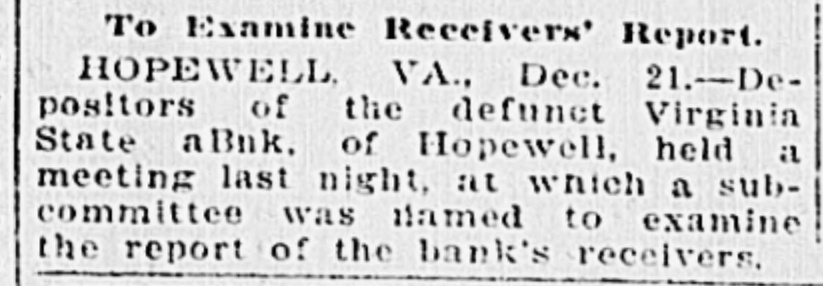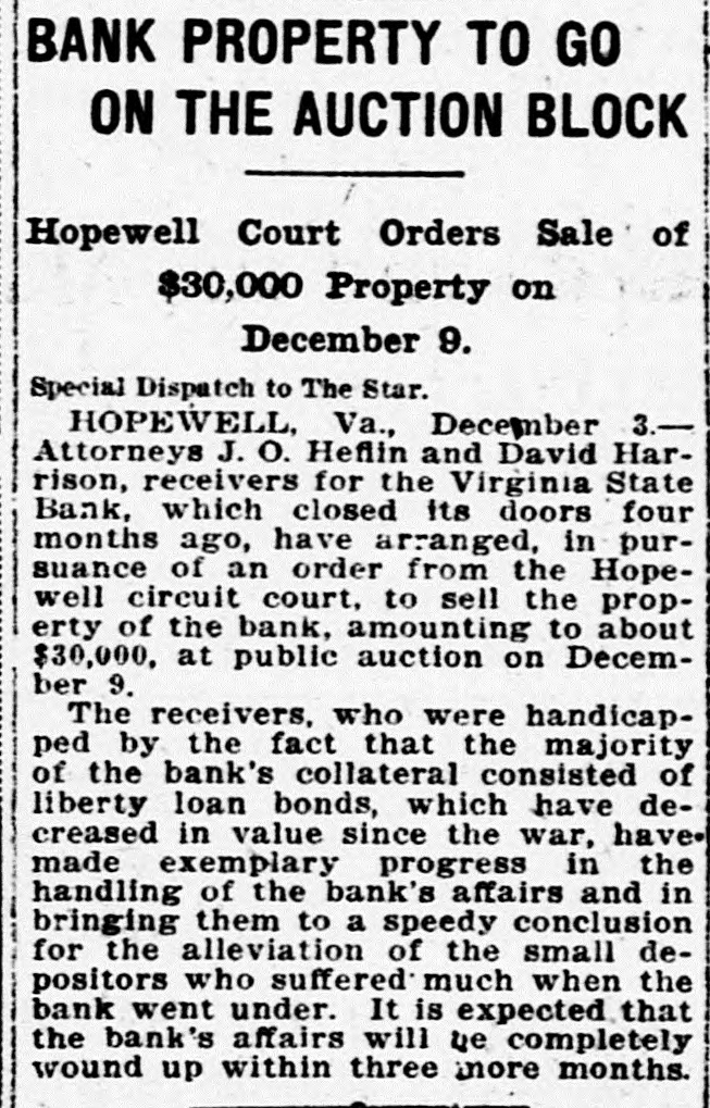BANK PROPERTY TO GO ON THE AUCTION BLOCK Hopewell Court Orders Sale of $30,000 Property on December 9. Special Dispatch to The Star. HOPEWELL, Va., December 3.Attorneys J.O. Heflin and David Harrison, receivers for the Virginia State Bank, which closed its doors four months ago, have arranged, in pursuance of an order from the Hopewell circuit court, to sell the property of the bank, amounting to about $30,000. at public auction on December 9. The receivers, who were handicapped by the fact that the majority of the bank's collateral consisted of liberty loan bonds, which have decreased in value since the war, have. made exemplary progress in the handling of the bank's affairs and in bringing them to a speedy conclusion for the alleviation of the small depositors who suffered much when the bank went under. It is expected that the bank's affairs will be completely wound up within three more months.