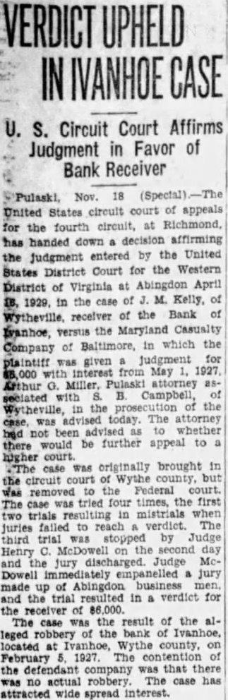 VERDICT UPHELD IN IVANHOE CASE S. Circuit Court Affirms Judgment in Favor of Bank Receiver Nov. 18 United States court of appeals for the fourth circuit, handed entered the United judgment Court for the Western States District Abingdon April District of Virginia of in the receiver of the Bank the Maryland Casualty Baltimore, the of judgment for was given from May Afthur Pulaski attorney advised today. The attorney was been to whether not would be further appeal to there court. was originally brought in case circuit court county, Federal court. case tried times, the first in mistrials reach verdict. The third trial stopped by Judge Henry McDowell on the second day and jury discharged. Judge McDowell empanelled jury Abingdon business and the trial resulted in verdict for the receiver case was the result of the alleged of the bank of Ivanhoe, located at Wythe county, February 1927. The contention the defendant company was that there no actual robbery. The case has attracted wide spread interest.