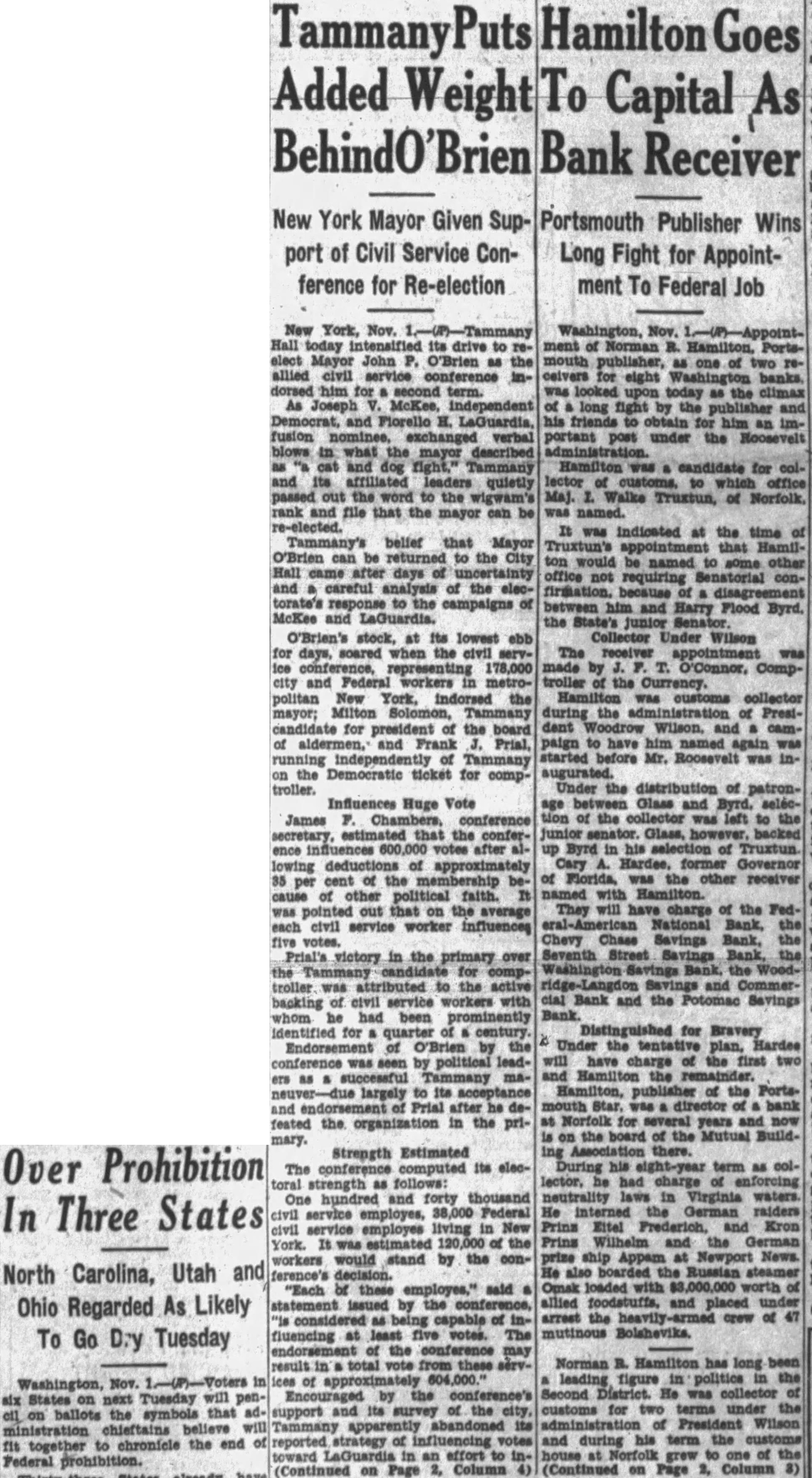 RECEIVERS GET ASSETS OF 8 SHUT BANKS Comptroller Shifts Task of Setting Up Affairs From Local Conservators Cary A. Hardee, Florida exgovernor and banker, and Norman R. Hamilton, Portsmouth (Va.) published and former Customs Collector, were designated by the Comptroller of the Currency today as receivers of the assets of the eight closed District banks now operated by conservators. The banks involved are Chevy Chase Savings, Federal American National, District National, Northeast Savings, Seventh Street Savings, Washington Savings, Woodridge-Langdon Savings, and Commercial and Potomac Savings. Under present plans of the Comptroller, Receiver Hardee will be in charge of liquidation of the assets of the Federal American and Chevy Chase Savings banks, while Receiver Hamilton will take over the remainder. Hardee Takes Charge Mr. Hardee entered upon his duties today, visiting the office of John Poole, conservator of the Federal American National Bank. Hamilton is not expected to arrive in the city until November 8. The receivers are expected to take over the assets of one bank at a time. According to this plan, the dual receivership will not be in full swing for several weeks as it will take a week or more for the checking-in process in the case of each bank. Approximately 65 per cent of the assets of the Chevy Chase Savings Bank were taken over by the Riggs National Bank in a "Spokane" purchase several months ago while 50 per cent of the assets of the other seven banks were taken over by the Hamilton National Bank. Move for Economy Replacement of the eight conservators by two receivers, Comptroller J. F. T. O'Connor explained, was in the interest of economy. Six salaries and high bond premiums will be eliminated in the new system. Assets of the Mt. Vernon Bank While it has been the uniform policy of the Treasury to make a survey of the condition of a bank as soon as it is placed in receivership and prepare a schedule of stock assessments commensurate with the uncollectible amount of assets, there was no indication of the Treas ury's policy in the case of the eight banks involved in the present receiverships. Four conservators replaced under the new system have been acting without pay since the Hamilton Bank opening as they had accepted positions with the new bank. They are Joshua Evans, jr., District National; George F. Hoover, Northeast Savings Bank; R. A. Sisson, Washington Savings Bank, and E. L. Norris, Woodridge-Langdon. The others are John Poole, Federal-American; George W. Offutt, Potomac Savings, and John D. Howard, Seventh Street Savings.