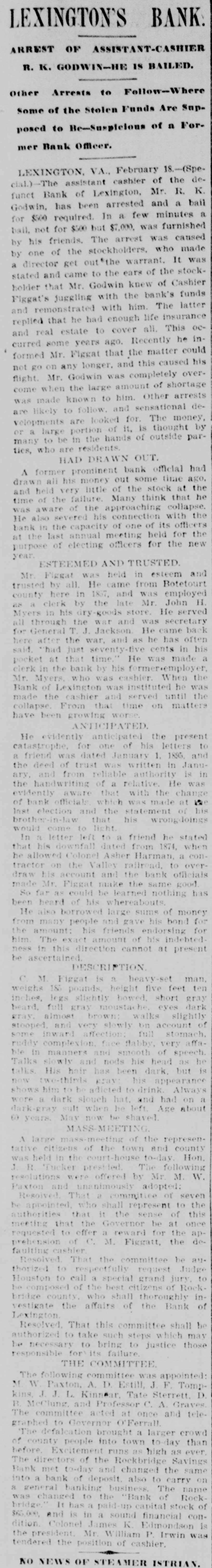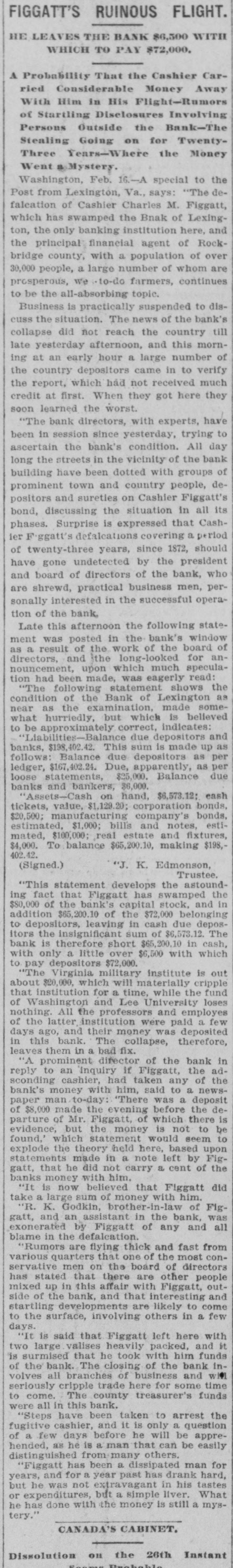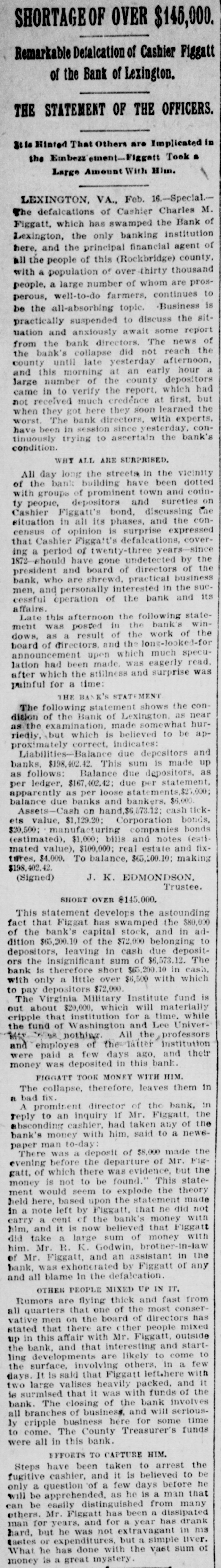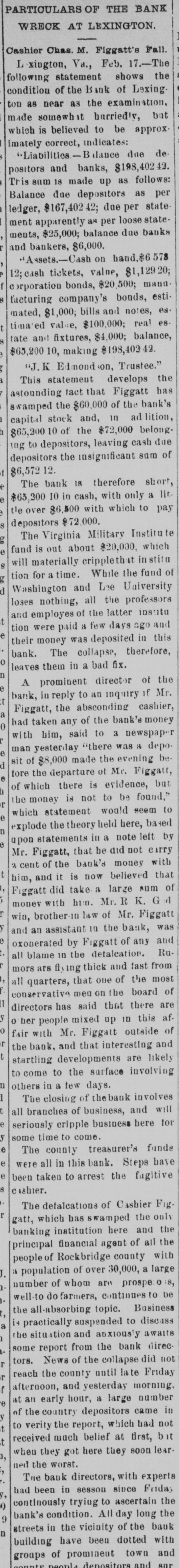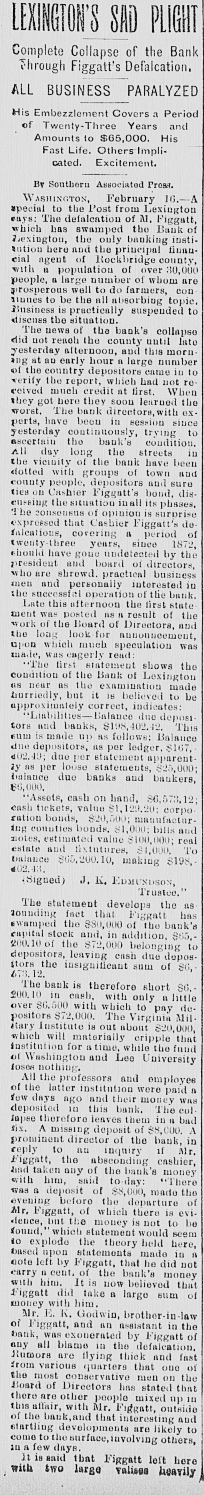 Complete Conapse OT e e Through Figgatt's Defalcation. ALL BUSINESS PARALYZED His Embezzlement Covers a Period of Twenty-Three Years and Amounts to $65,000. His Fast Life. Others Implicated. Excitement. By Southern Associated Press. WASHINGTON, February 16.-A special to the Post from Lexington rays: The defalcation of M. Figgatt, which has swamped the Bank of Lexington, the only banking instiantion here and the principal financial agent of Rockbridge county, with a population of over 30,000 people, a large number of whom are prosperous well to do farmers, con innues to be the all absorbing topic. Business is practically suspended to discuss the situation. The news of the bank's collapse did not reach the county until late yesterday afternoon, and this morn ang at an early hour a large number of the country depositors came in to verify the report, which had not rereived much credit at first. When they got here they soon learned the worst. The bank directors,with perts, have been in session since yesterday continuously, trying to ascertain the bank's condition. 111 All day long the streets the viciuity of the bank have been dotted with groups of town and county people, depositors and sure ties on Cashier Figgatt's bond, discuseing the situation in all its phases. The consensus of opinion is surprise expressed that Cashier Figgatt's de falcations, covering a period of twenty-three years, since 1872, should have gone undetected by the president and board of directors, who are shrewd. practical business men and personally interested in the successful operation of the bank. Late this afternoon the first state ment was posted as 8 result of the work of the Board of Directors, and the long look-for announcement, upon which much speculation was made, was engerly read 'The first statement shows the condition of the Bank of Lexington as near as the examination made hurriedly, but it is believed to be approximately correct, indicates: Liabilities- Balance due deposit tors and banks, $198,402.42 This sum is made UD as follows: Balance due depositors, as per ledger, $167, 402.49; due per statement apparent ay as per loose statements, $25,000; balance due banks and bankers, 86,000, "Assets, cash on hand, $6,573.12; cash tickets, value $1,129.20; corpo ration bonds, $20,500; manufacturing counties bonds. $1,000; bills and notes, estimated value $100,000; real estate and tixtutures, $1,000. To balance $65,200.10, making $198, 102.43. (Signed) J. K. EDMUNDSON, Trustee. The statement develops the as rounding fact that Figgatt has ewamped the $80,000 of the bank's capital stock and, in addition, $65. 200.10 of the $72,000 belonging to depositors, leaving cash due deposstors the insignificant sum of $6, 673.12. The bank is therefore short $6. 200.10 in cash, with only a little over $6,500 with which to pay depositors $72,000. The Virginia Mil Stary Institute is out about $20,000, which will materially cripple that institution for a time, while the fund of Washington and Lee University foses nothing. All the professors and employee of the latter institution were paid a few days ago and their money was deposited 111 this bank. The col lapse therefore leaves them in a bad A six. A missing deposit of $8,000. prominent director of the bank in reply to an inquiry if Mr. Figgatt, the absconding cashier, and taken any of the bank's money with him, said to-day: "There was a deposit of $8,000, made the evening before the departure of Mr. Figgatt, of which there is evidence, but the money is not to be found," which statement would seem to explode the theory held here, based upon statements made in a note left by Figgatt, that he did not carry 11 cent. of the bank's money with him. It is now believed that Figgatt did take a large sum of money with him. Mr. E. K. Godwin, brother-in-law of Figgatt, and an assistant in the bank, was exonerated by Figgatt of any all blame in the defalcation. Rumors are flying thick and fast from various quarters that one of the most conservative men on the Board of Directors has stated that there at other people mixed up in this affair, with Mr. Figgatt, outside of the bank,and that interesting and startling developments are likely to come to the surface, involving others, an a few days. It is said that Figgatt left here with two large Falises heavily