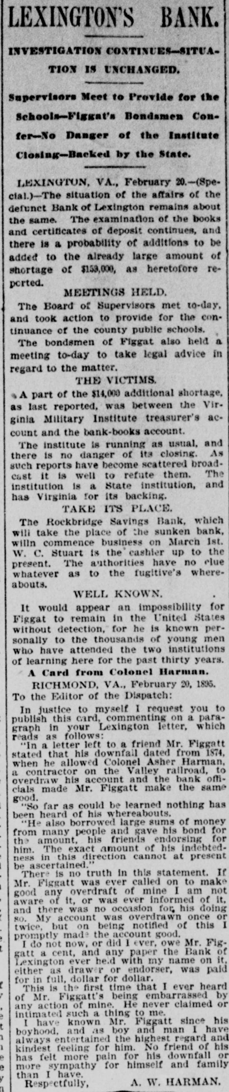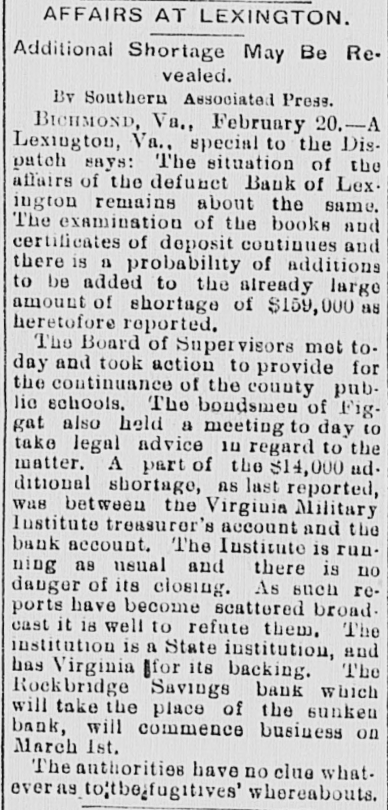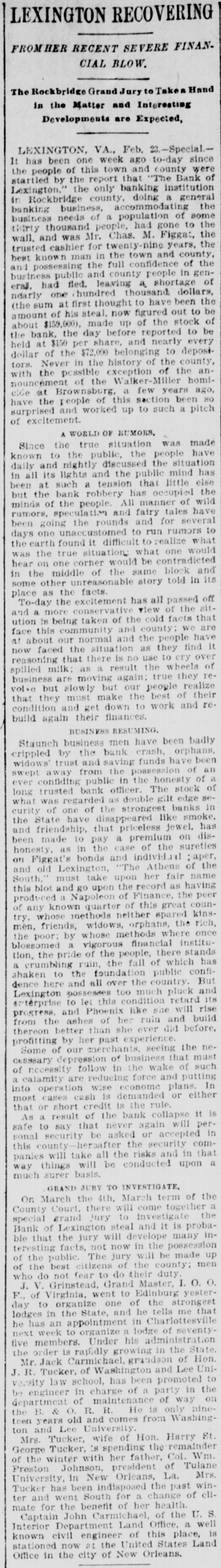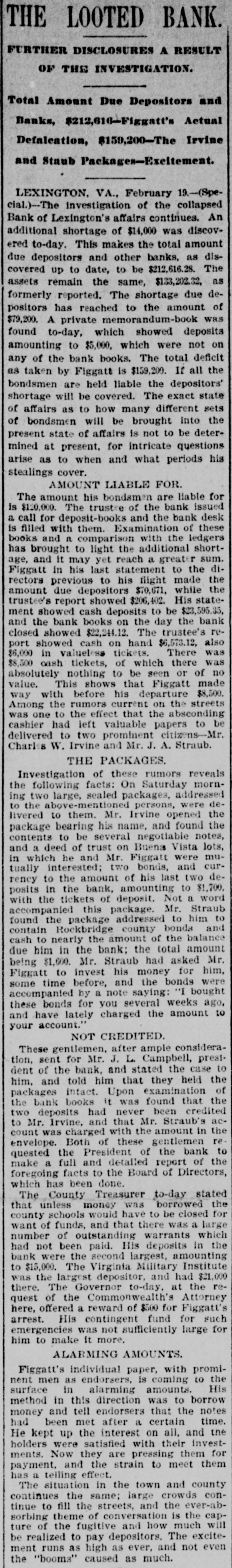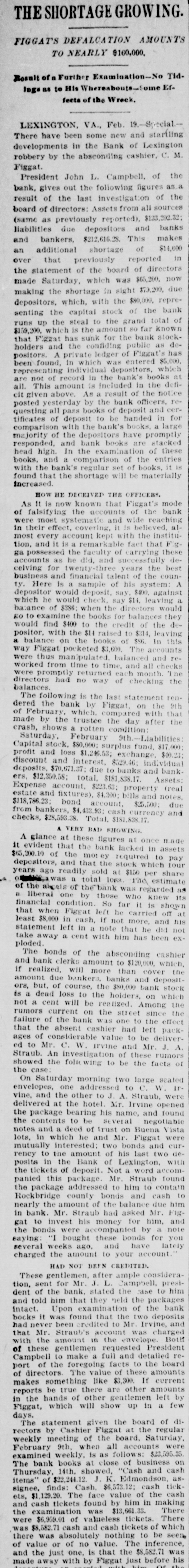 Complete Conapse OT e e Through Figgatt's Defalcation. ALL BUSINESS PARALYZED His Embezzlement Covers a Period of Twenty-Three Years and Amounts to $65,000. His Fast Life. Others Implicated. Excitement. By Southern Associated Press. WASHINGTON, February 16.-A special to the Post from Lexington rays: The defalcation of M. Figgatt, which has swamped the Bank of Lexington, the only banking instiantion here and the principal financial agent of Rockbridge county, with a population of over 30,000 people, a large number of whom are prosperous well to do farmers, con innues to be the all absorbing topic. Business is practically suspended to discuss the situation. The news of the bank's collapse did not reach the county until late yesterday afternoon, and this morn ang at an early hour a large number of the country depositors came in to verify the report, which had not rereived much credit at first. When they got here they soon learned the worst. The bank directors,with perts, have been in session since yesterday continuously, trying to ascertain the bank's condition. 111 All day long the streets the viciuity of the bank have been dotted with groups of town and county people, depositors and sure ties on Cashier Figgatt's bond, discuseing the situation in all its phases. The consensus of opinion is surprise expressed that Cashier Figgatt's de falcations, covering a period of twenty-three years, since 1872, should have gone undetected by the president and board of directors, who are shrewd. practical business men and personally interested in the successful operation of the bank. Late this afternoon the first state ment was posted as 8 result of the work of the Board of Directors, and the long look-for announcement, upon which much speculation was made, was engerly read 'The first statement shows the condition of the Bank of Lexington as near as the examination made hurriedly, but it is believed to be approximately correct, indicates: Liabilities- Balance due deposit tors and banks, $198,402.42 This sum is made UD as follows: Balance due depositors, as per ledger, $167, 402.49; due per statement apparent ay as per loose statements, $25,000; balance due banks and bankers, 86,000, "Assets, cash on hand, $6,573.12; cash tickets, value $1,129.20; corpo ration bonds, $20,500; manufacturing counties bonds. $1,000; bills and notes, estimated value $100,000; real estate and tixtutures, $1,000. To balance $65,200.10, making $198, 102.43. (Signed) J. K. EDMUNDSON, Trustee. The statement develops the as rounding fact that Figgatt has ewamped the $80,000 of the bank's capital stock and, in addition, $65. 200.10 of the $72,000 belonging to depositors, leaving cash due deposstors the insignificant sum of $6, 673.12. The bank is therefore short $6. 200.10 in cash, with only a little over $6,500 with which to pay depositors $72,000. The Virginia Mil Stary Institute is out about $20,000, which will materially cripple that institution for a time, while the fund of Washington and Lee University foses nothing. All the professors and employee of the latter institution were paid a few days ago and their money was deposited 111 this bank. The col lapse therefore leaves them in a bad A six. A missing deposit of $8,000. prominent director of the bank in reply to an inquiry if Mr. Figgatt, the absconding cashier, and taken any of the bank's money with him, said to-day: "There was a deposit of $8,000, made the evening before the departure of Mr. Figgatt, of which there is evidence, but the money is not to be found," which statement would seem to explode the theory held here, based upon statements made in a note left by Figgatt, that he did not carry 11 cent. of the bank's money with him. It is now believed that Figgatt did take a large sum of money with him. Mr. E. K. Godwin, brother-in-law of Figgatt, and an assistant in the bank, was exonerated by Figgatt of any all blame in the defalcation. Rumors are flying thick and fast from various quarters that one of the most conservative men on the Board of Directors has stated that there at other people mixed up in this affair, with Mr. Figgatt, outside of the bank,and that interesting and startling developments are likely to come to the surface, involving others, an a few days. It is said that Figgatt left here with two large Falises heavily