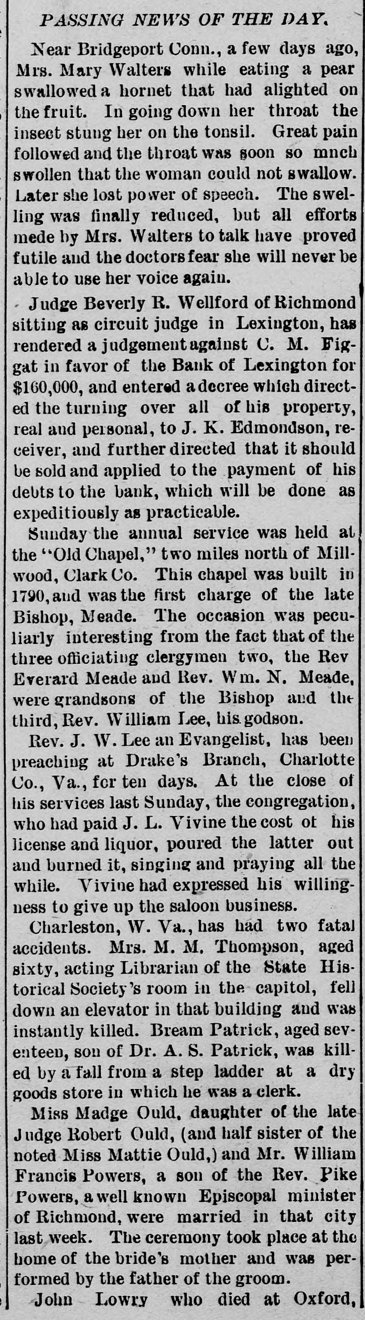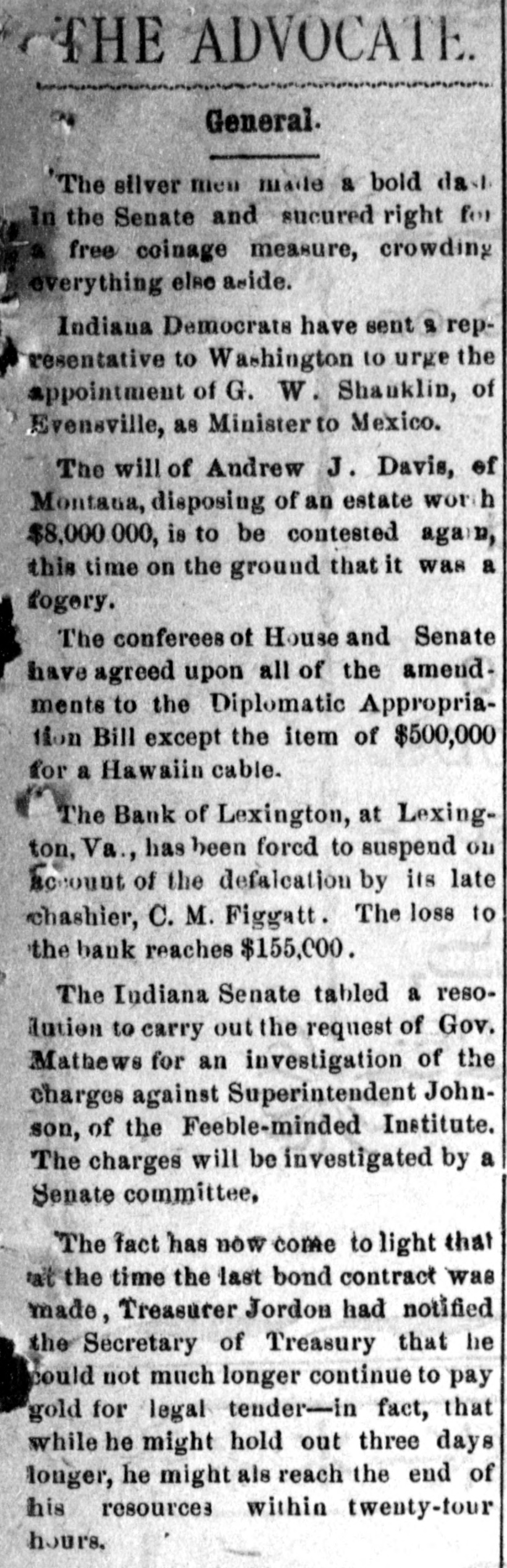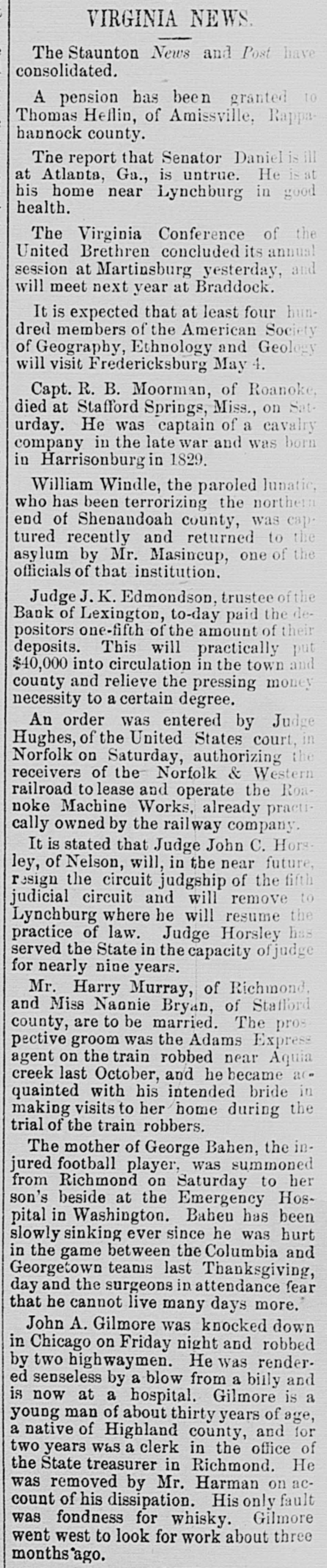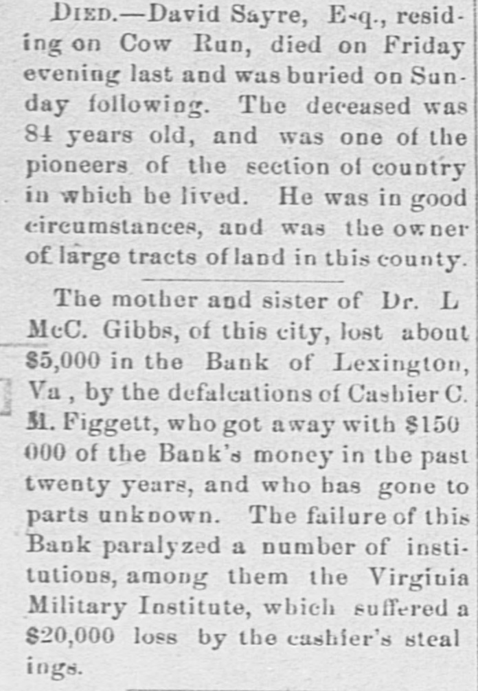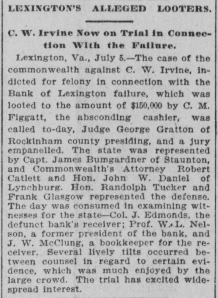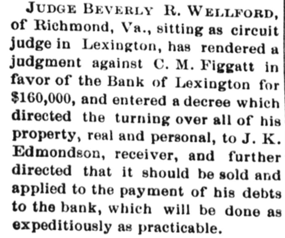 Complete Conapse OT e e Through Figgatt's Defalcation. ALL BUSINESS PARALYZED His Embezzlement Covers a Period of Twenty-Three Years and Amounts to $65,000. His Fast Life. Others Implicated. Excitement. By Southern Associated Press. WASHINGTON, February 16.-A special to the Post from Lexington rays: The defalcation of M. Figgatt, which has swamped the Bank of Lexington, the only banking instiantion here and the principal financial agent of Rockbridge county, with a population of over 30,000 people, a large number of whom are prosperous well to do farmers, con innues to be the all absorbing topic. Business is practically suspended to discuss the situation. The news of the bank's collapse did not reach the county until late yesterday afternoon, and this morn ang at an early hour a large number of the country depositors came in to verify the report, which had not rereived much credit at first. When they got here they soon learned the worst. The bank directors,with perts, have been in session since yesterday continuously, trying to ascertain the bank's condition. 111 All day long the streets the viciuity of the bank have been dotted with groups of town and county people, depositors and sure ties on Cashier Figgatt's bond, discuseing the situation in all its phases. The consensus of opinion is surprise expressed that Cashier Figgatt's de falcations, covering a period of twenty-three years, since 1872, should have gone undetected by the president and board of directors, who are shrewd. practical business men and personally interested in the successful operation of the bank. Late this afternoon the first state ment was posted as 8 result of the work of the Board of Directors, and the long look-for announcement, upon which much speculation was made, was engerly read 'The first statement shows the condition of the Bank of Lexington as near as the examination made hurriedly, but it is believed to be approximately correct, indicates: Liabilities- Balance due deposit tors and banks, $198,402.42 This sum is made UD as follows: Balance due depositors, as per ledger, $167, 402.49; due per statement apparent ay as per loose statements, $25,000; balance due banks and bankers, 86,000, "Assets, cash on hand, $6,573.12; cash tickets, value $1,129.20; corpo ration bonds, $20,500; manufacturing counties bonds. $1,000; bills and notes, estimated value $100,000; real estate and tixtutures, $1,000. To balance $65,200.10, making $198, 102.43. (Signed) J. K. EDMUNDSON, Trustee. The statement develops the as rounding fact that Figgatt has ewamped the $80,000 of the bank's capital stock and, in addition, $65. 200.10 of the $72,000 belonging to depositors, leaving cash due deposstors the insignificant sum of $6, 673.12. The bank is therefore short $6. 200.10 in cash, with only a little over $6,500 with which to pay depositors $72,000. The Virginia Mil Stary Institute is out about $20,000, which will materially cripple that institution for a time, while the fund of Washington and Lee University foses nothing. All the professors and employee of the latter institution were paid a few days ago and their money was deposited 111 this bank. The col lapse therefore leaves them in a bad A six. A missing deposit of $8,000. prominent director of the bank in reply to an inquiry if Mr. Figgatt, the absconding cashier, and taken any of the bank's money with him, said to-day: "There was a deposit of $8,000, made the evening before the departure of Mr. Figgatt, of which there is evidence, but the money is not to be found," which statement would seem to explode the theory held here, based upon statements made in a note left by Figgatt, that he did not carry 11 cent. of the bank's money with him. It is now believed that Figgatt did take a large sum of money with him. Mr. E. K. Godwin, brother-in-law of Figgatt, and an assistant in the bank, was exonerated by Figgatt of any all blame in the defalcation. Rumors are flying thick and fast from various quarters that one of the most conservative men on the Board of Directors has stated that there at other people mixed up in this affair, with Mr. Figgatt, outside of the bank,and that interesting and startling developments are likely to come to the surface, involving others, an a few days. It is said that Figgatt left here with two large Falises heavily