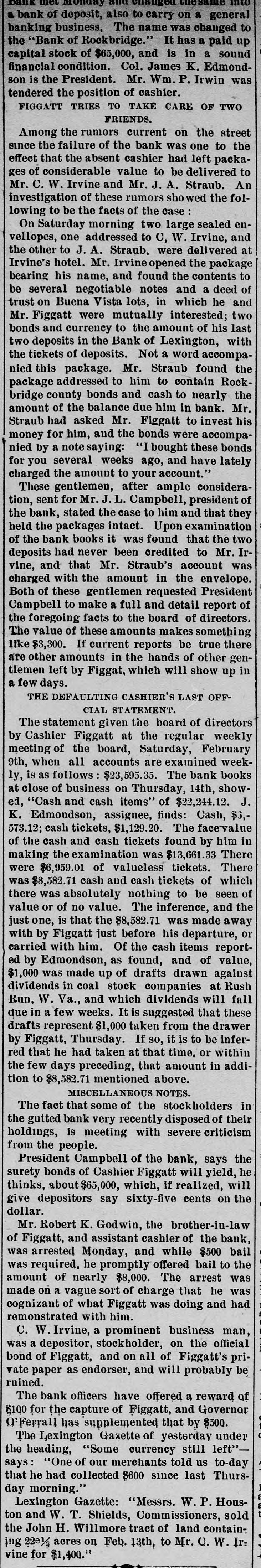 a bank of deposit, also to carry on a general banking business, The name was changed to the "Bank of Rockbridge." It has a paid up capital stock of $65,000, and is in a sound financial condition. Col. James K. Edmondson is the President. Mr. Wm. P. Irwin was tendered the position of cashier. FIGGATT TRIES TO TAKE CARE OF TWO FRIENDS. Among the rumors current on the street since the failure of the bank was one to the effect that the absent cashier had left packages of considerable value to be delivered to Mr. C. W. Irvine and Mr. J. A. Straub. An investigation of these rumors sho wed the following to be the facts of the case On Saturday morning two large sealed envellopes, one addressed to C, W. Irvine, and the other to J. A. Straub, were delivered at Irvine's hotel. Mr. Irvine opened the package bearing his name, and found the contents to be several negotiable notes and a deed of trust on Buena Vista lots, in which he and Mr. Figgatt were mutually interested; two bonds and currency to the amount of his last two deposits in the Bank of Lexington, with the tickets of deposits. Not a word accompanied this package. Mr. Straub found the package addressed to him to contain Rockbridge county bonds and cash to nearly the amount of the balance due him in bank. Mr. Straub had asked Mr. Figgatt to invest his money for him, and the bonds were accompanied by a note saying: "I bought these bonds for you several weeks ago, and have lately charged the amount to your account." These gentlemen, after ample consideration, sent for Mr. J. L. Campbell, president of the bank, stated the case to him and that they held the packages intact. Upon examination of the bank books it was found that the two deposits had never been credited to Mr. Irvine, and that Mr. Straub's account was charged with the amount in the envelope. Both of these gentlemen requested President Campbell to make a full and detail report of the foregoing facts to the board of directors. The value of these amounts makes something like $3,300. If current reports be true there are other amounts in the hands of other gentlemen left by Figgat, which will show up in a few days. THE DEFAULTING CASHIER'S LAST OFFCIAL STATEMENT. The statement given the board of directors by Cashier Figgatt at the regular weekly meeting of the board, Saturday, February 9th, when all accounts are examined weekly, is as follows $23,595.35. The bank books at close of business on Thursday, 14th, showed, "Cash and cash items" of $22,244.12. J. K. Edmondson, assignee, finds: Cash, $0,573.12; cash tickets, $1,129.20. The facevalue of the cash and cash tickets found by him in making the examination was $13,661.33 There were $6,959.01 of valueless tickets. There was $8,582.71 cash and cash tickets of which there was absolutely nothing to be seen of value or of no value. The inference, and the just one, is that the $8,582.71 was made away with by Figgatt just before his departure, or carried with him. Of the cash items reported by Edmondson, as found, and of value, $1,000 was made up of drafts drawn against dividends in coal stock companies at Rush Run, W. Va., and which dividends will fall due in a few weeks. It is suggested that these drafts represent $1,000 taken from the drawer by Figgatt, Thursday. If so, it is to be inferred that he had taken at that time, or within the few days preceding, that amount in addition to $8,582.71 mentioned above. MISCELLANEOUS NOTES. The fact that some of the stockholders in the gutted bank very recently disposed of their holdings, is meeting with severe criticism from the people. President Campbell of the bank, says the surety bonds of Cashier Figgatt will yield, he thinks, about $65,000, which, if realized, will give depositors say sixty-five cents on the dollar. Mr. Robert K. Godwin, the brother-in-law of Figgatt, and assistant cashier of the bank, was arrested Monday, and while $500 bail was required, he promptly offered bail to the