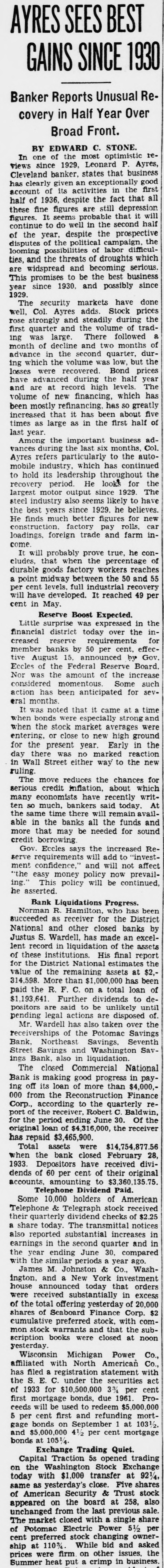 DISTRICT BANK'S ASSETS GROWING Hopes for Dividend This Year Seen in Receiver's Report. Hope for a dividend some time this year for depositors of the District National Bank, closed since 1933, was seen in the quarterly report of Receiver Norman R. Hamilton, made public yesterday. Although a suit still is pending by certain stockholders, seeking to prevent collection of assessment against stockholders, the receivership is making good progress in liquidating the institution, the report shows, with remaining assets now estimated at $2,201,958.72. Collections from stockholders, listed as "cash collected by receiver and held as trustee for owners," total $469,802.02. The bank owed the Reconstruction Finance Corp. a total of $1,193,487, but has paid back $901,287, and thus owes less than $300,000 on assets valued at a much higher figure. $567,186 Cash on Hand. Cash in the hands of the receiver has reached $567,186.71. When another dividend may be payable to depositors is a question which cannot be answered at this time by the receiver, but the figures speak for themselves. Distribution may not be made, it is understood, however, until the stockholders' suit is settled. Under a dividend of 50 per cent, paid in September, 1933, depositors had received up to the end of 1935 a total of $1,920,331.22. Reports of several other receivers of insolvent banks were filed also yesterday, disclosing the condition of these institutions at the close of 1935. Delayed by Litigation. The Federal . American National Bank & Trust Co., of which Cary A Hardee is receiver, has remaining assets estimated at $3,029,389.66, but pending litigation apparently has delayed indefinitely possibility of a dividend to depositors. Stockholders have paid in a total of $1,005,186.73 on a stock assessment of $2,000,000. Cash in hand was listed at $1,090,923.89, and a liquidating account included $114,815.88. Out of a total loan from the R. F. C. amounting to $2,348,425.97 there has been paid back $1,090,923.80. Depositors of this bank have received one dividend of 50 per cent, which up to the end of the year had been paid out in the total of $4,162,486.21. Reports of Other Banks. Reports on five other banks were made public. Among those, four were in the hands of Receiver Hamilton, and had remaining assets as follows: Potomac Savings, $781,162.09; Seventh Street Savings, $377,782.25; Northeast Savings, $221,260.98; Washington Savings, $132,402.33. The Chevy Chase Savings Bank, which has paid out 80 per cent and probably will pay 100 per cent to its depositors eventually, was reported by Receiver Hardee to have total remaining assets amounting to $30,557.68.