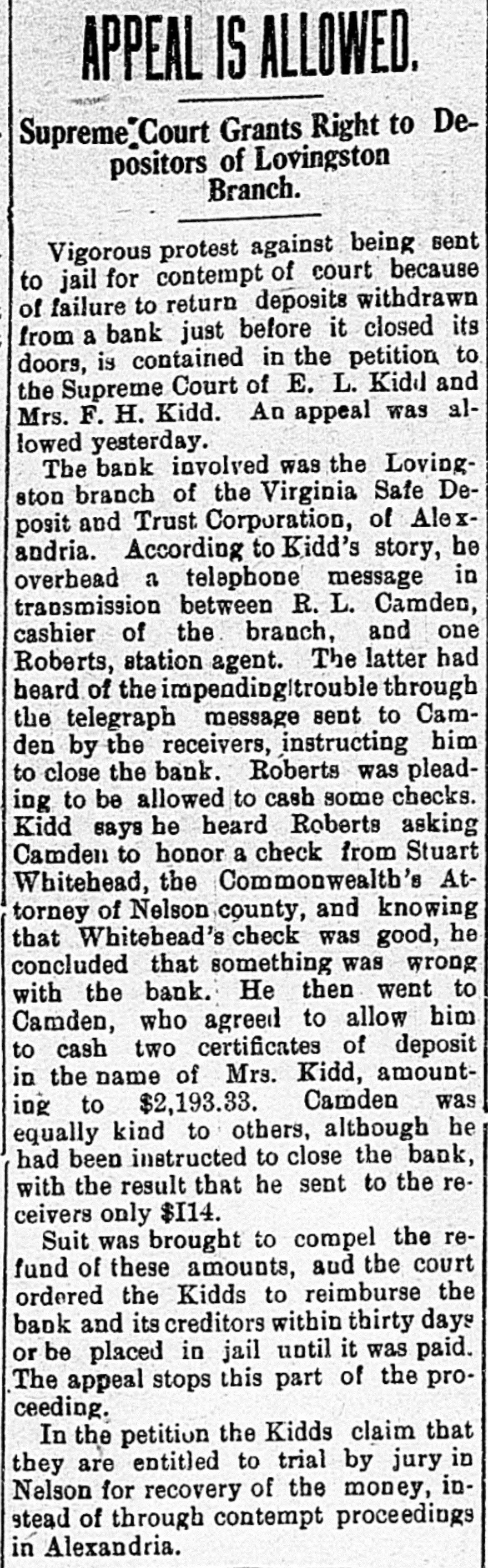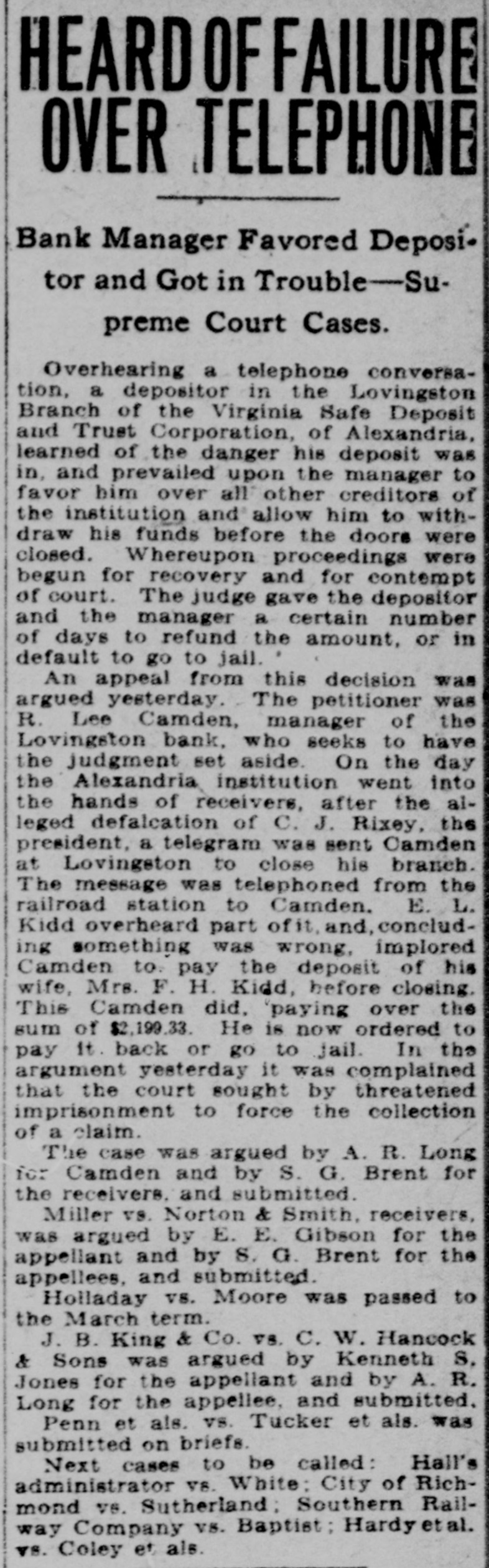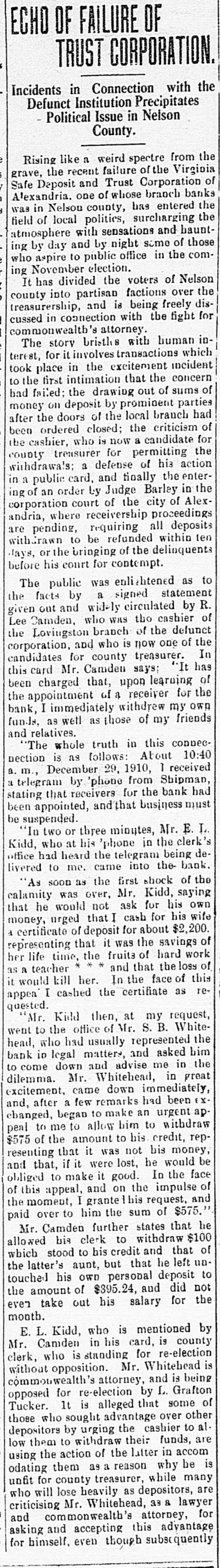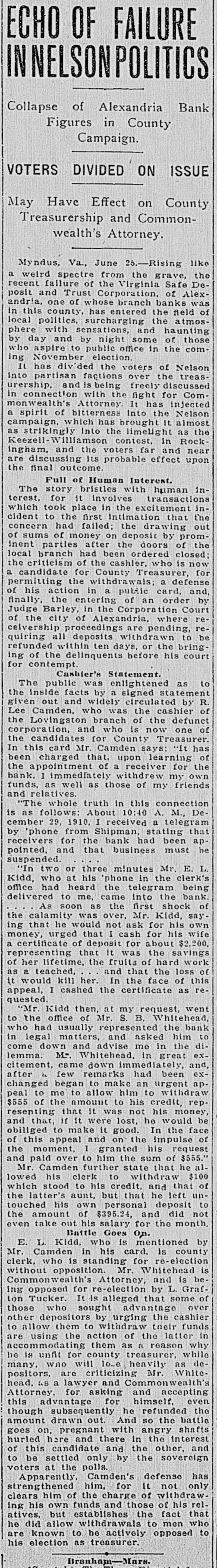 ECHO OF FAILURE INNELSONPOLITICS Collapse of Alexandria Bank Figures in County Campaign. VOTERS DIVIDED ON ISSUE May Have Effect on County Treasurership and Commonwealth's Attorney. Myndus, Va., June 25.-Rising like a weird spectre from the grave, the recent failure of the Virginia Safe Deposit and Trust Corporation, of Alexandria, one of whose branch banks was in this county, has entered the field of local politics, surcharging the atmosphere with sensations, and haunting by day and by night some of those who aspire to public office in the coming November election. It has divided the voters of Nelson into partisan factions over the treasurership, and is being freely discussed in connection with the fight for Commonwealth's Attorney. It has injected a spirit of bitterness into the Nelson campaign, which has brought it almost as strikingly into the limelight as the Keezell-Williamson contest, in Rockingham, and the voters far and near are discussing its probable effect upon the final outcome. Full of Human Interest. The story bristles with human interest, for it involves transactions which took place in the excitement incident to the first Intimation that the concern had failed; the drawing out of sums of money on deposit by prominent parties after the doors of the local branch had been ordered closed; the criticism of the cashier, who is now a candidate for County Treasurer, for permitting the withdrawals; a defense of his action in a public card, and, finally, the entering of an order by Judge Barley, in the Corporation Court of the city of Alexandria, where receivership proceedings are pending, requiring all deposits withdrawn to be refunded within ten days, or the bringing of the delinquents before his court for contempt. Cashier's Statement. The public was enlightened as to the inside facts by a signed statement given out and widely circulated by R. Lee Camden, who was the cashier of the Lovingston branch of the defunct corporation, and who is now one of the candidates for County Treasurer. In this card Mr. Camden says: "It has been charged that, upon learning of the appointment of a receiver for the bank, I immediately withdrew my own funds, as well as those of my friends and relatives. "The whole truth in this connection is as follows: About 10:40 A. M., December 29, 1910, I received a telegram by 'phone from Shipman, stating that receivers for the bank had been appointed, and that business must he suspended. "In two or three minutes Mr. E. L. Kidd, who at his 'phone in the clerk's office had heard the telegram being delivered to me, came into the bank. As soon as the first shock of the calamity was over, Mr. Kidd, saying that he would not ask for his own monev urged that cash for his wife