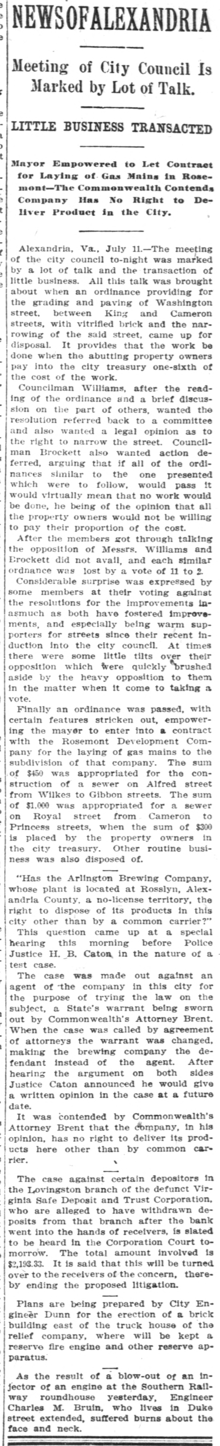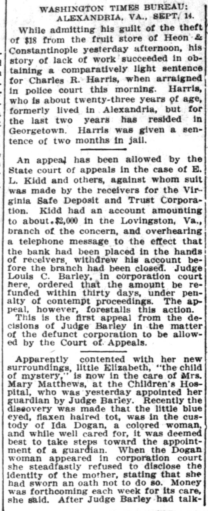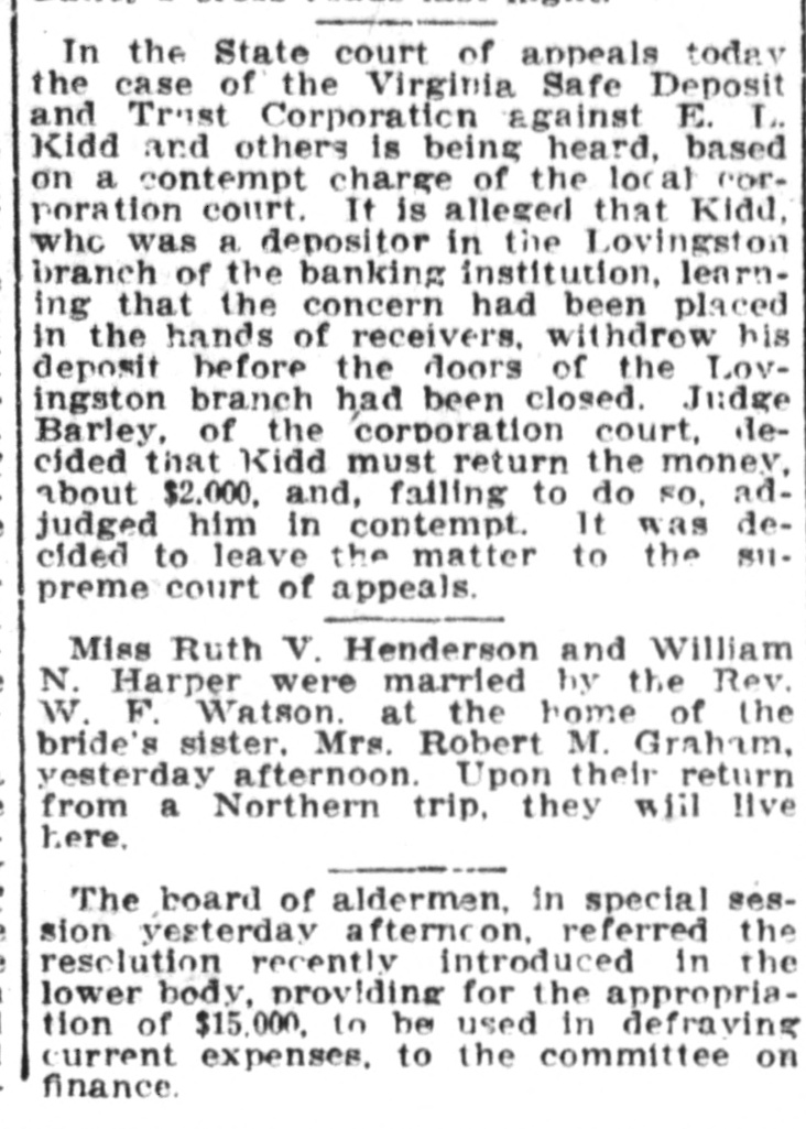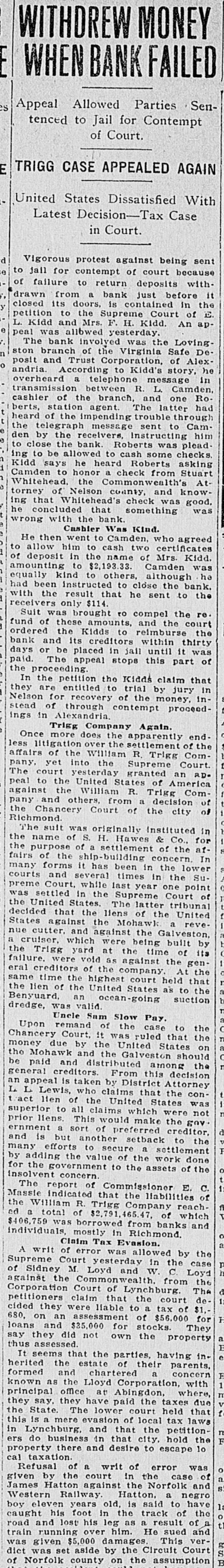 ECHO OF FAILURE INNELSONPOLITICS Collapse of Alexandria Bank Figures in County Campaign. VOTERS DIVIDED ON ISSUE May Have Effect on County Treasurership and Commonwealth's Attorney. Myndus, Va., June 25.-Rising like a weird spectre from the grave, the recent failure of the Virginia Safe Deposit and Trust Corporation, of Alexandria, one of whose branch banks was in this county, has entered the field of local politics, surcharging the atmosphere with sensations, and haunting by day and by night some of those who aspire to public office in the coming November election. It has divided the voters of Nelson into partisan factions over the treasurership, and is being freely discussed in connection with the fight for Commonwealth's Attorney. It has injected a spirit of bitterness into the Nelson campaign, which has brought it almost as strikingly into the limelight as the Keezell-Williamson contest, in Rockingham, and the voters far and near are discussing its probable effect upon the final outcome. Full of Human Interest. The story bristles with human interest, for it involves transactions which took place in the excitement incident to the first Intimation that the concern had failed; the drawing out of sums of money on deposit by prominent parties after the doors of the local branch had been ordered closed; the criticism of the cashier, who is now a candidate for County Treasurer, for permitting the withdrawals; a defense of his action in a public card, and, finally, the entering of an order by Judge Barley, in the Corporation Court of the city of Alexandria, where receivership proceedings are pending, requiring all deposits withdrawn to be refunded within ten days, or the bringing of the delinquents before his court for contempt. Cashier's Statement. The public was enlightened as to the inside facts by a signed statement given out and widely circulated by R. Lee Camden, who was the cashier of the Lovingston branch of the defunct corporation, and who is now one of the candidates for County Treasurer. In this card Mr. Camden says: "It has been charged that, upon learning of the appointment of a receiver for the bank, I immediately withdrew my own funds, as well as those of my friends and relatives. "The whole truth in this connection is as follows: About 10:40 A. M., December 29, 1910, I received a telegram by 'phone from Shipman, stating that receivers for the bank had been appointed, and that business must he suspended. "In two or three minutes Mr. E. L. Kidd, who at his 'phone in the clerk's office had heard the telegram being delivered to me, came into the bank. As soon as the first shock of the calamity was over, Mr. Kidd, saying that he would not ask for his own monev urged that cash for his wife