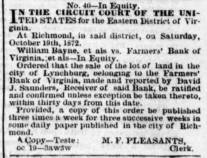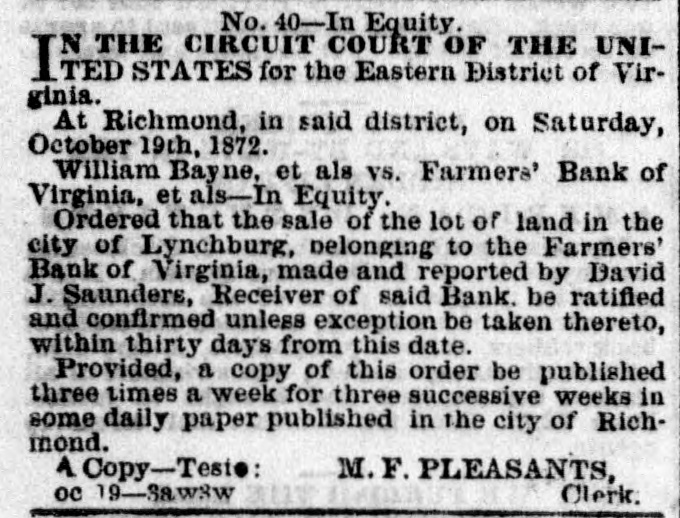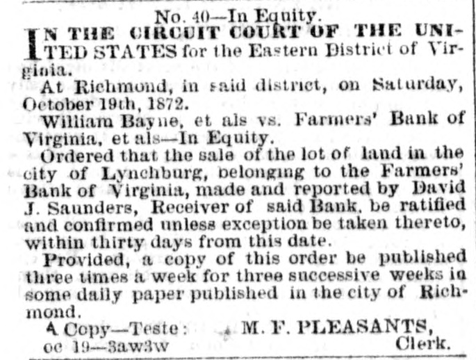 No. 40-In Equity. COURT OF THE UNIINDIA the Eastern District of Virginia. At Richmond, in said district, on Saturday, October 19th, 1872. William Bayne, et als vs. Farmers' Bank of Virginia, et als-In Equity. Ordered that the sale of the lot of land in the city of Lynchburg, belonging to the Farmers' Bank of Virginia, made and reported by David J. Saunders, Receiver of said Bank, be ratified and confirmed unless exception be taken thereto, within thirty days from this date. Provided, a copy of this order be published three times a week for three successive weeks in some daily paper published in the city of Richmond. A Copy-Teste: M. F. PLEASANTS, oc 19-3aw3w Clerk.