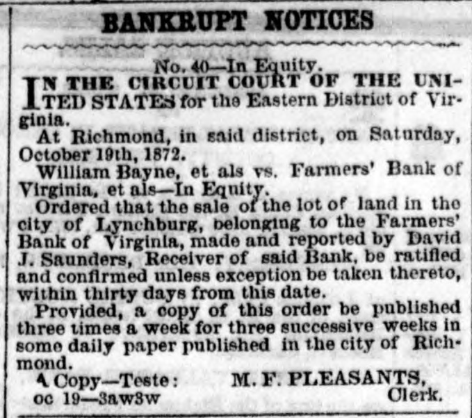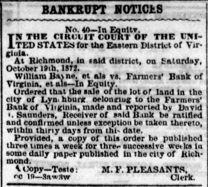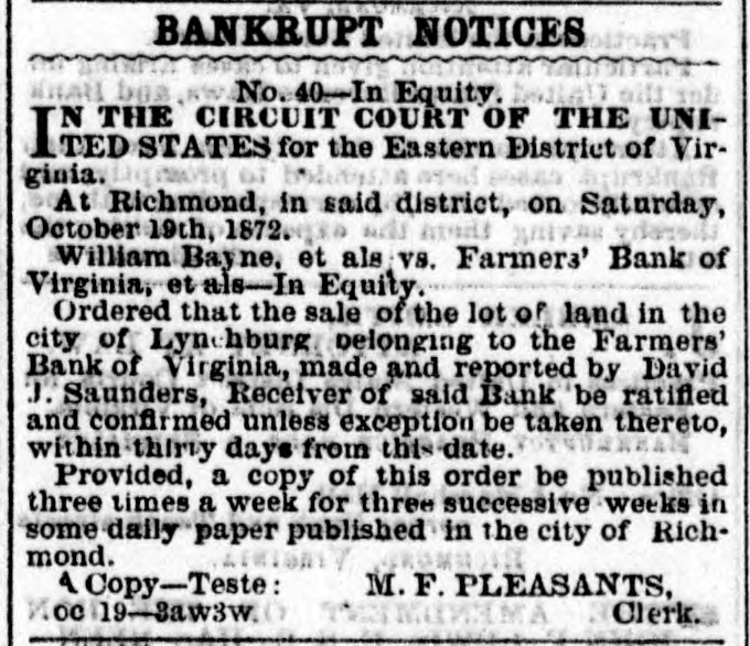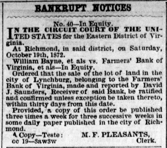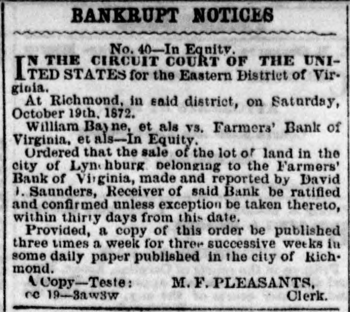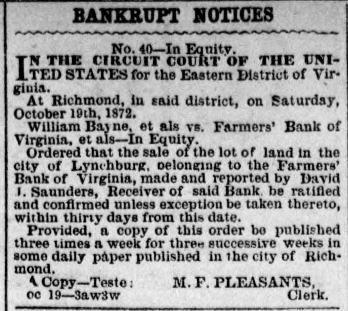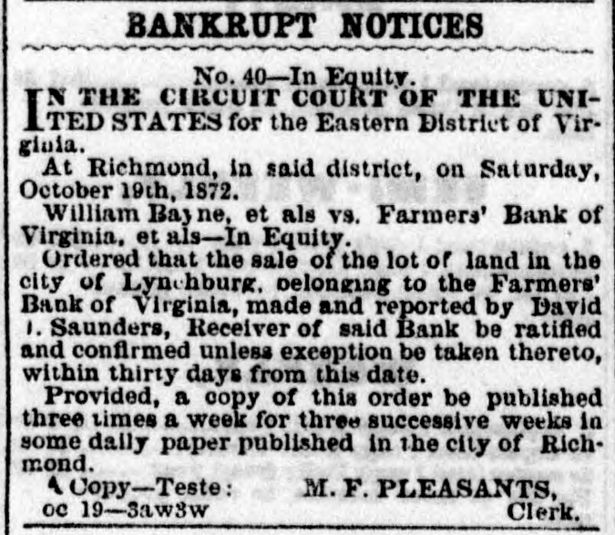 BANKRUPT NOTICES No. 40-In Equity. THE CIRCUIT COURT OF THE UNIITED STATES for the Eastern District of Virgioia. At Richmond, in said district, on Saturday, October 19th, 1872. William Bayne, et als V8. Farmers' Bank of Virginia, et als-In Equity. Ordered that the sale of the lot of land in the city of Lyn hburg belonging to the Farmers' Bank of Virginia, made and reported by David 1. Saunders, Receiver of said Bank be ratified and confirmed unless exception be taken thereto, within thirty days from thi- date. Provided, a copy of this order be published three times a week for three successive weeks in some daily paper published in the city of Richmond. 1 Copy-Teste: M. F. PLEASANTS, ne 19-Sawkw Clerk.