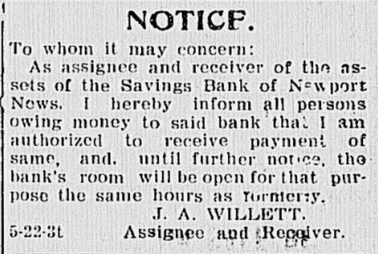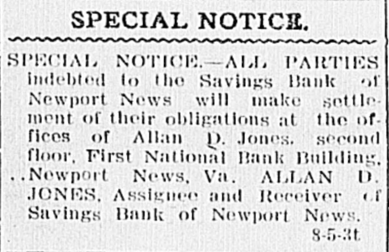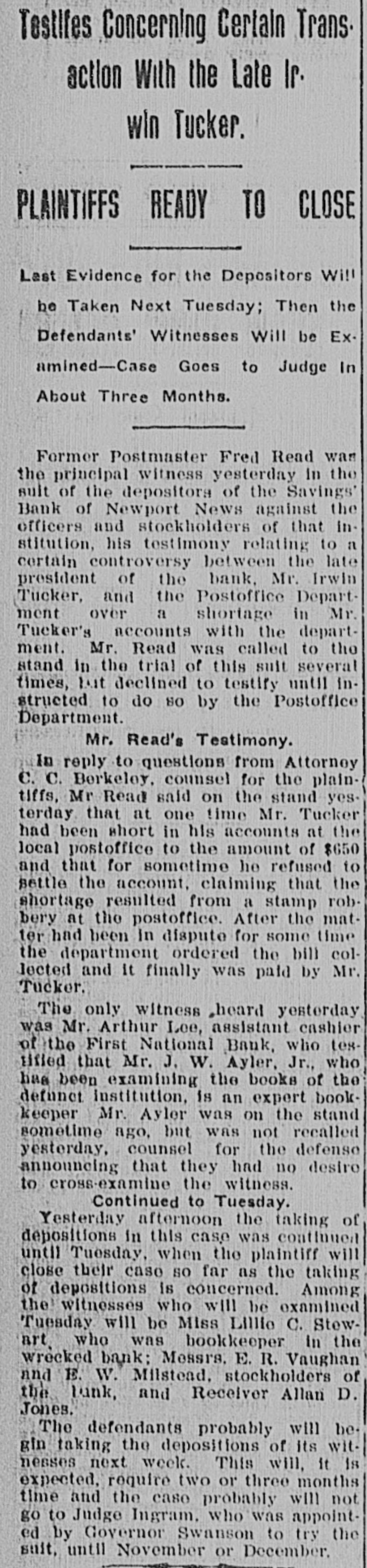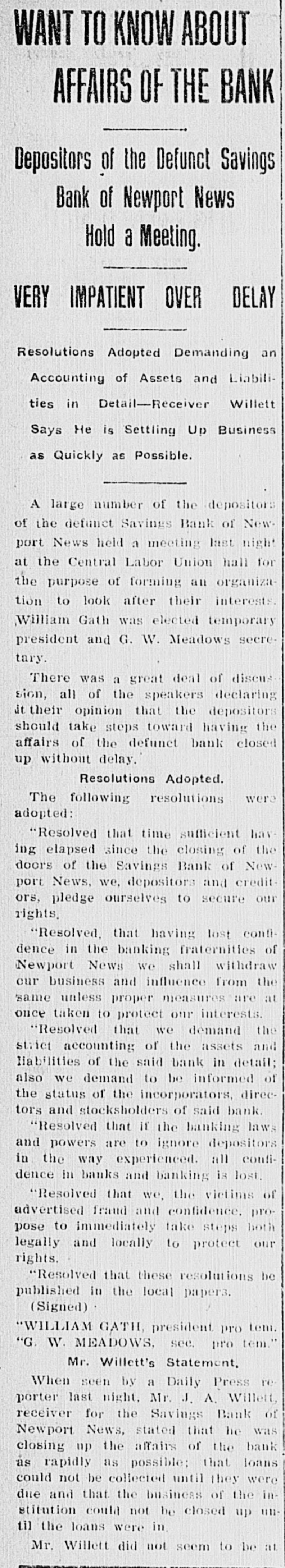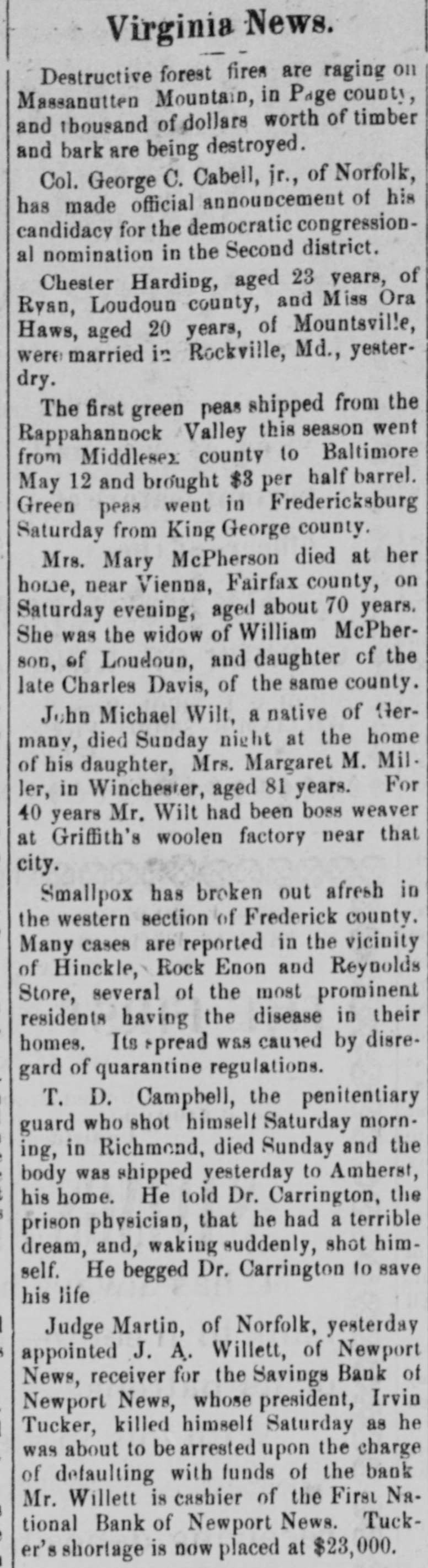 Virginia News. Destructive forest fires are raging on Massanutten Mountain, in Page county, and thousand of dollars worth of timber and bark are being destroyed. Col. George C. Cabell, jr., of Norfolk, has made official announcement of his candidacy for the democratic congressional nomination in the Second district. Chester Harding, aged 23 years, of Ryan, Loudoun county, and Miss Ora Haws, aged 20 years, of Mountsville, were married in Rockville, Md., yesterdry. The first green peas shipped from the Rappahannock Valley this season went from Middlesez county to Baltimore May 12 and brought $3 per half barrel. Green peas went in Fredericksburg Saturday from King George county. Mrs. Mary McPherson died at her home, near Vienna, Fairfax county, on Saturday evening, aged about 70 years. She was the widow of William McPherson, of Loudoun, and daughter cf the late Charles Davis, of the same county. John Michael Wilt, a native of Germany, died Sunday night at the home of his daughter, Mrs. Margaret M. Mil. ler, in Winchester, aged 81 years. For 40 years Mr. Wilt had been boss weaver at Griffith's woolen factory near that city. Smallpox has broken out afresh in the western section of Frederick county. Many cases are reported in the vicinity of Hinckle, Rock Enon and Reynolds Store, several of the most prominent residents having the disease in their homes. Its +pread was caused by disregard of quarantine regulations. T. D. Campbell, the penitentiary guard who shot himself Saturday morning, in Richmond, died Sunday and the body was shipped yesterday to Amherst, his home. He told Dr. Carrington, the prison physician, that he had a terrible dream, and, waking suddenly, shot himself. He begged Dr. Carrington to save his life Judge Martin, of Norfolk, yesterday appointed J. A. Willett, of Newport News, receiver for the Savings Bank of Newport News, whose president, Irvin Tucker, killed himself Saturday as he was about to be arrested upon the charge of defaulting with funds of the bank Mr. Willett is cashier of the First National Bank of Newport News. Tucker's shortage is now placed at $23,000.