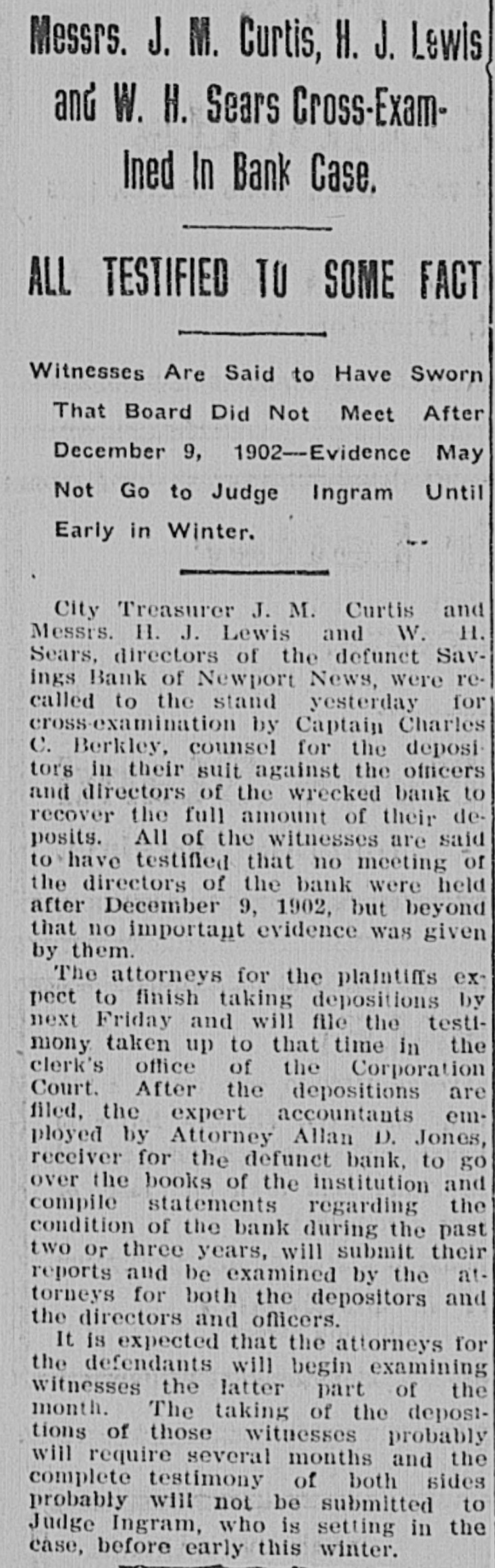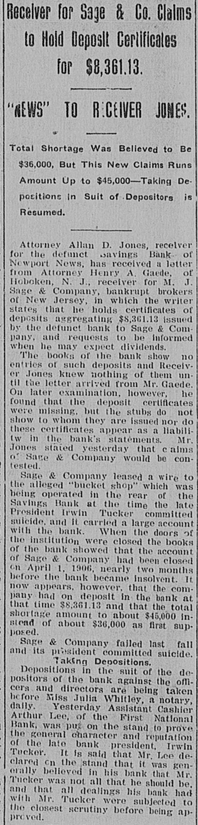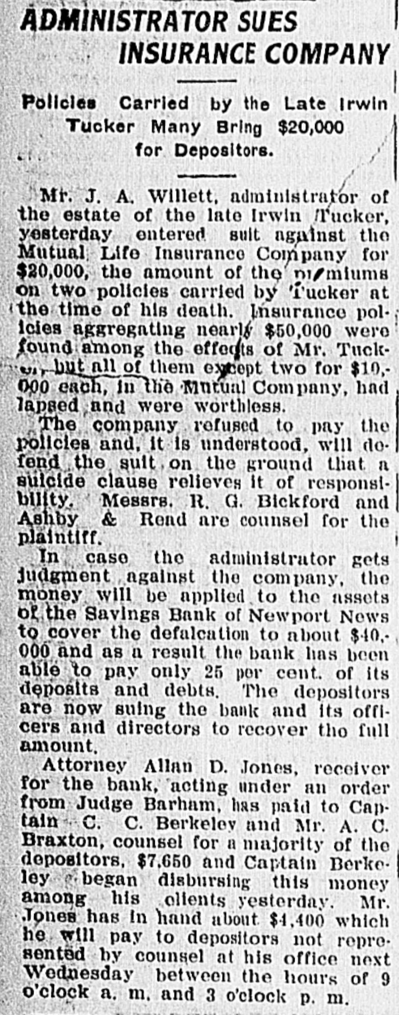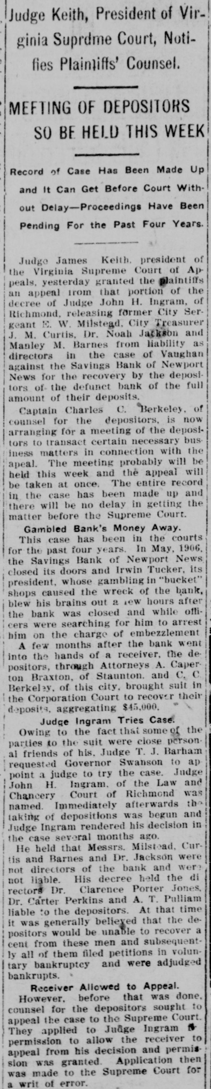Virginia News. Destructive forest fires are raging on Massanutten Mountain, in Page county, and thousand of dollars worth of timber and bark are being destroyed. Col. George C. Cabell, jr., of Norfolk, has made official announcement of his candidacy for the democratic congressional nomination in the Second district. Chester Harding, aged 23 years, of Ryan, Loudoun county, and Miss Ora Haws, aged 20 years, of Mountsville, were married in Rockville, Md., yesterdry. The first green peas shipped from the Rappahannock Valley this season went from Middlesez county to Baltimore May 12 and brought $3 per half barrel. Green peas went in Fredericksburg Saturday from King George county. Mrs. Mary McPherson died at her home, near Vienna, Fairfax county, on Saturday evening, aged about 70 years. She was the widow of William McPherson, of Loudoun, and daughter cf the late Charles Davis, of the same county. John Michael Wilt, a native of Germany, died Sunday night at the home of his daughter, Mrs. Margaret M. Mil. ler, in Winchester, aged 81 years. For 40 years Mr. Wilt had been boss weaver at Griffith's woolen factory near that city. Smallpox has broken out afresh in the western section of Frederick county. Many cases are reported in the vicinity of Hinckle, Rock Enon and Reynolds Store, several of the most prominent residents having the disease in their homes. Its +pread was caused by disregard of quarantine regulations. T. D. Campbell, the penitentiary guard who shot himself Saturday morning, in Richmond, died Sunday and the body was shipped yesterday to Amherst, his home. He told Dr. Carrington, the prison physician, that he had a terrible dream, and, waking suddenly, shot himself. He begged Dr. Carrington to save his life Judge Martin, of Norfolk, yesterday appointed J. A. Willett, of Newport News, receiver for the Savings Bank of Newport News, whose president, Irvin Tucker, killed himself Saturday as he was about to be arrested upon the charge of defaulting with funds of the bank Mr. Willett is cashier of the First National Bank of Newport News. Tucker's shortage is now placed at $23,000.