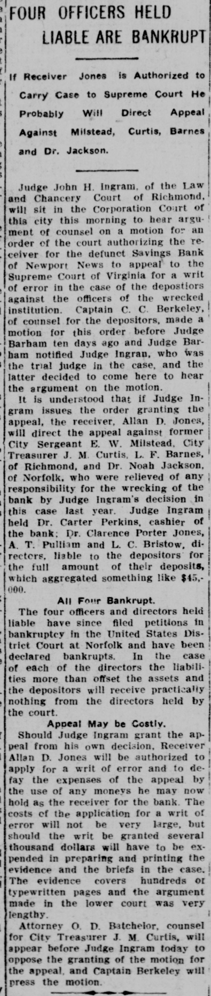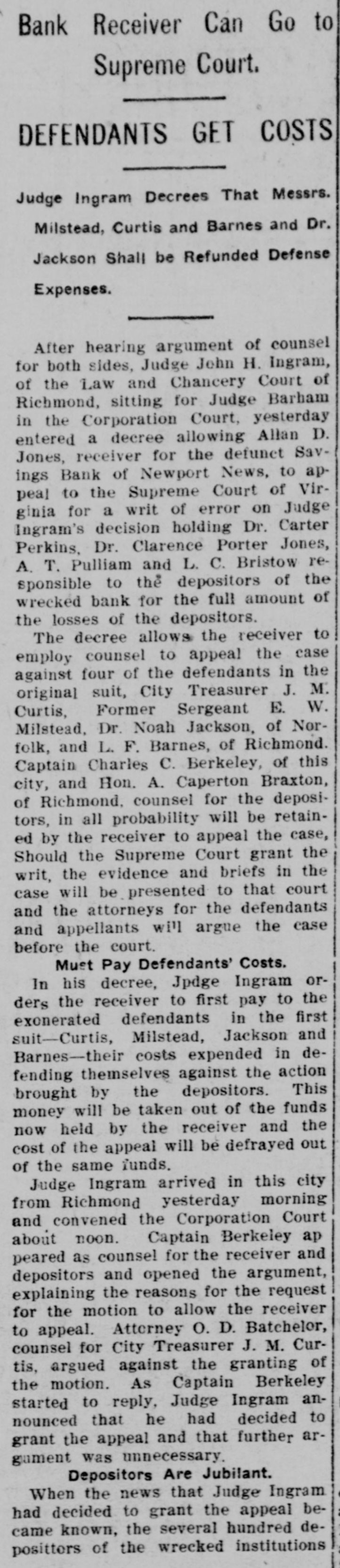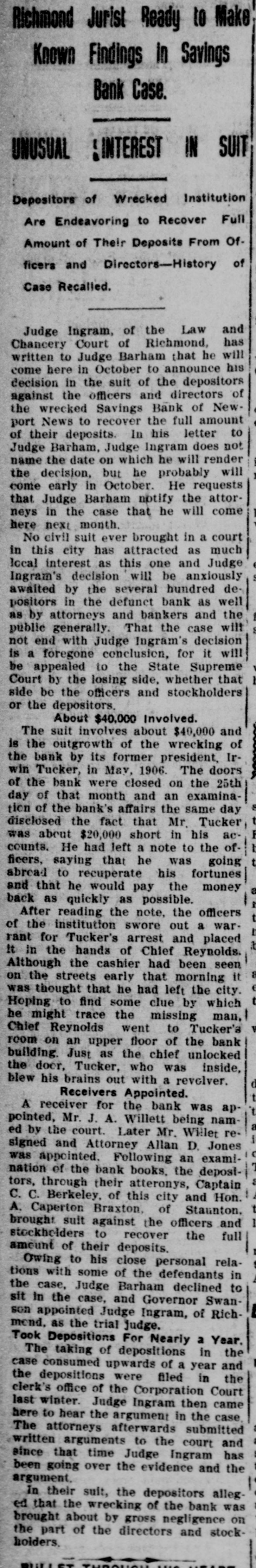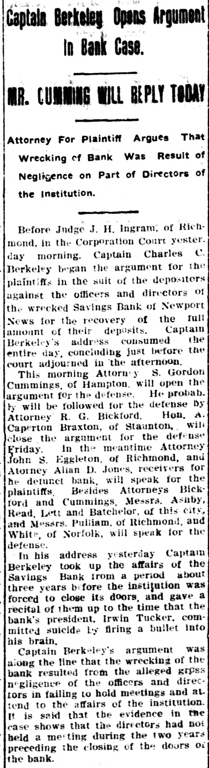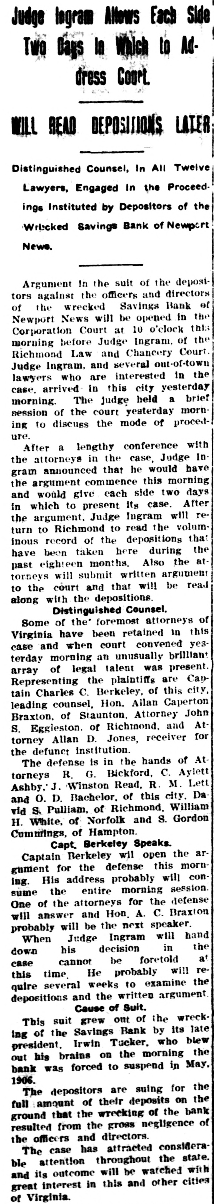 Judge Ingram Allows Each Side Two Days In Which to Address Court. READ DEPOSITIONS LATER Distinguished Counsel, In All Twelve Lawyers, Engaged In the Proceedings Instituted by Depositors of the Wrecked Savings Bank of Newport News. Argument in the suit of the depositors against the officers and directors of the wrecked Savings Bank of Newport News will be opened in the Corporation Court at 10 o'clock this morning before Judge Ingram. of the Richmond Law and Chancery Court. Judge Ingram. and several out-of-town lawyers who are interested in the case, arrived in this city yesterday morning. The judge held a brief session of the court yesterday morning to discuss the mode of procedure. After a lengthy conference with the attorneys in the case, Judge Ingram announced that he would have the argument commence this morning and would give each side two days in which to present its case. After the argument, Judge Ingram will return to Richmond to read the voluminous record of the depositions that have been taken here during the past eighteen months. Also the attorneys will submit written argument to the court and that will be read along with the depositions. Distinguished Counsel. Some of the' foremost attorneys of Virginia have been retained in this case and when court convened yesterday morning an unusually brilliant array of legal talent was present. Representing the plaintiffs are Captain Charles C. Berkeley, of this city, leading counsel, Hon. Allan Caperton Braxton. of Staunton. Attorney John S. Eggleston. of Richmond. and Attorney Allan D. Jones, receiver for the defunct institution. The defense is in the hands of Attorneys R. G. Bickford, C. Aylett Ashby, J. Winston Read, R. M. Lett and O. D. Bachelor. of this city. David S. Pulliam. of Richmond, William H. White, of Norfolk and S. Gordon Commings, of Hampton. Capt. Berkeley Speaks. Captain Berkeley will open the argument for the defense this morning. His address probably will consume the entire morning session. One of the attorneys for the defense will answer and Hon. A. C. Braxton probably will be the next speaker. When Judge Ingram will hand down his decision in the case cannot be foretold at this time. He probably will require several weeks to examine the depositions and the written argument. Cause of Suit. This suit grew out of the wrecking of the Savings Bank by its late president. Irwin Tucker, who blew out his brains on the morning the bank was forced to suspend in May. 1906. The depositors are suing for the full amount of their deposits on the ground that the wrecking of the bank resulted from the gross negligence of the officers and directors. The case has attracted considerable attention throughout the state. and its outcome will be watched with great interest in this and other cities of Virginia.