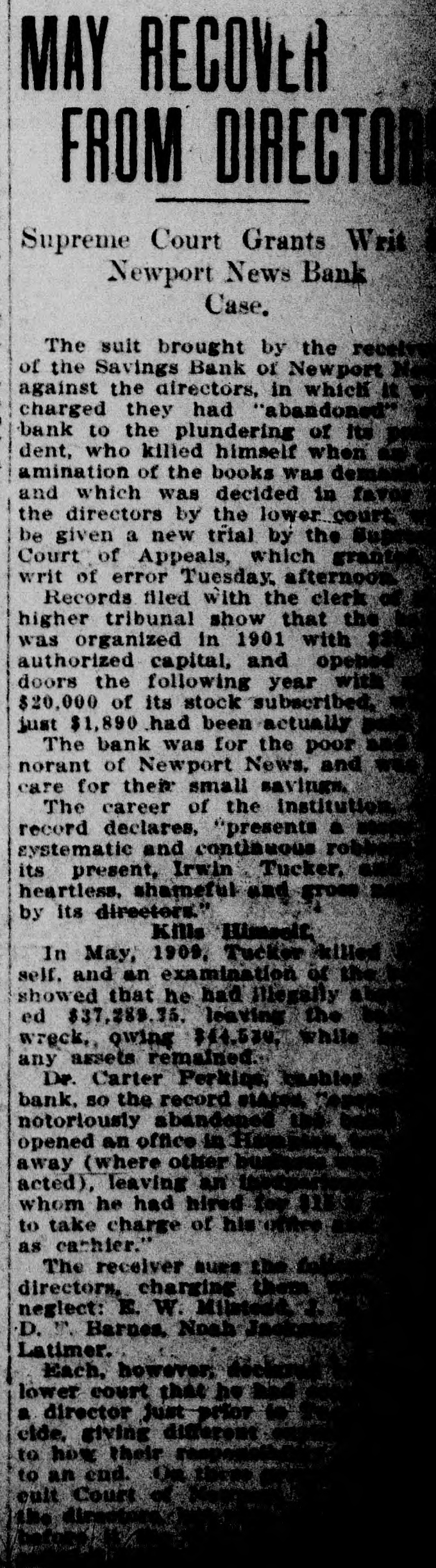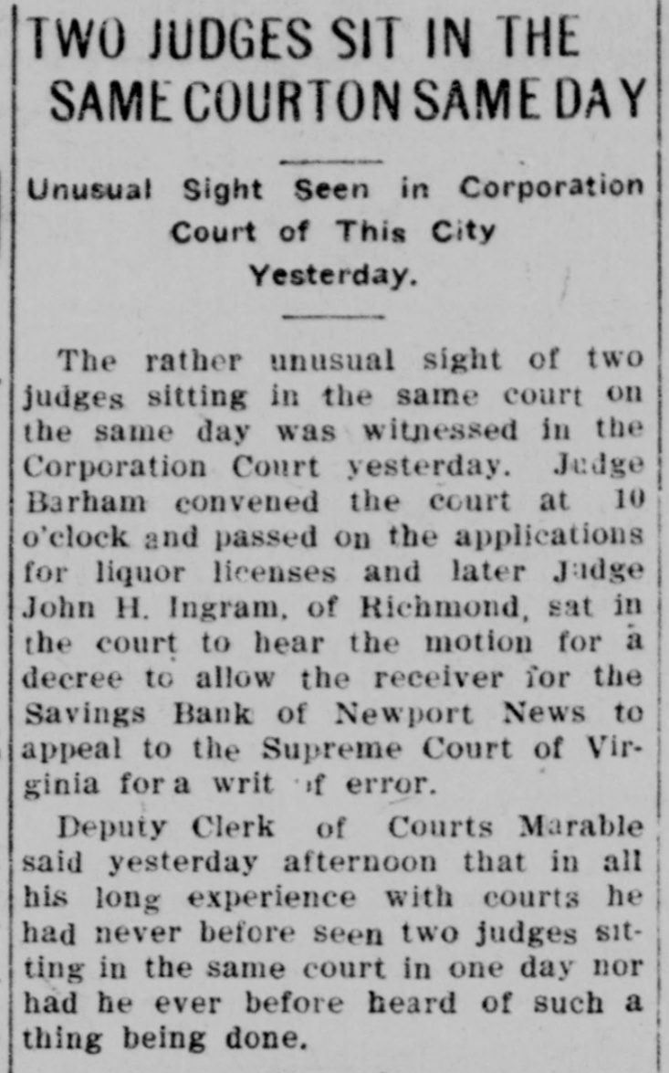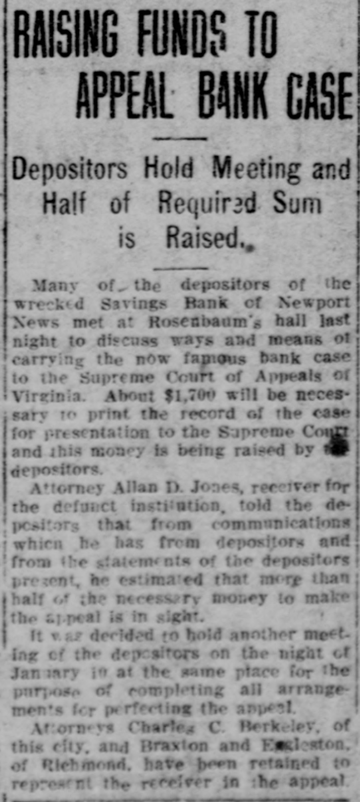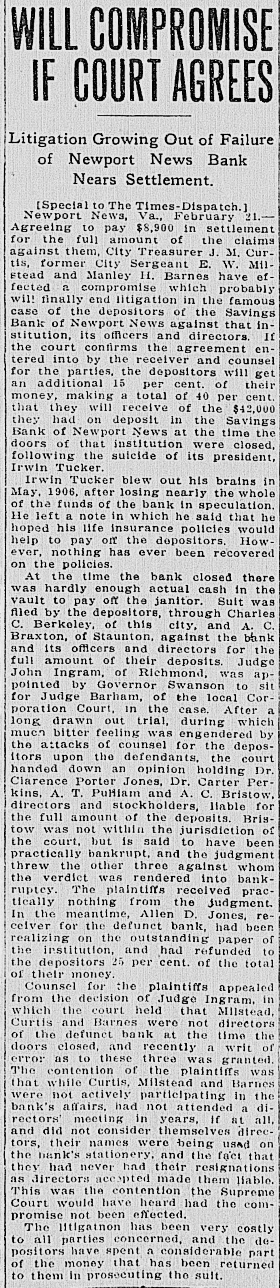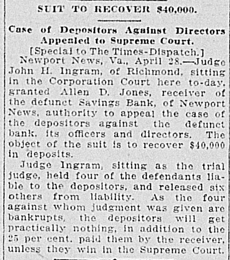 Judge Ingram Allows Each Side Two Days In Which to Address Court. READ DEPOSITIONS LATER Distinguished Counsel, In All Twelve Lawyers, Engaged In the Proceedings Instituted by Depositors of the Wrecked Savings Bank of Newport News. Argument in the suit of the depositors against the officers and directors of the wrecked Savings Bank of Newport News will be opened in the Corporation Court at 10 o'clock this morning before Judge Ingram. of the Richmond Law and Chancery Court. Judge Ingram. and several out-of-town lawyers who are interested in the case, arrived in this city yesterday morning. The judge held a brief session of the court yesterday morning to discuss the mode of procedure. After a lengthy conference with the attorneys in the case, Judge Ingram announced that he would have the argument commence this morning and would give each side two days in which to present its case. After the argument, Judge Ingram will return to Richmond to read the voluminous record of the depositions that have been taken here during the past eighteen months. Also the attorneys will submit written argument to the court and that will be read along with the depositions. Distinguished Counsel. Some of the' foremost attorneys of Virginia have been retained in this case and when court convened yesterday morning an unusually brilliant array of legal talent was present. Representing the plaintiffs are Captain Charles C. Berkeley, of this city, leading counsel, Hon. Allan Caperton Braxton. of Staunton. Attorney John S. Eggleston. of Richmond. and Attorney Allan D. Jones, receiver for the defunct institution. The defense is in the hands of Attorneys R. G. Bickford, C. Aylett Ashby, J. Winston Read, R. M. Lett and O. D. Bachelor. of this city. David S. Pulliam. of Richmond, William H. White, of Norfolk and S. Gordon Commings, of Hampton. Capt. Berkeley Speaks. Captain Berkeley will open the argument for the defense this morning. His address probably will consume the entire morning session. One of the attorneys for the defense will answer and Hon. A. C. Braxton probably will be the next speaker. When Judge Ingram will hand down his decision in the case cannot be foretold at this time. He probably will require several weeks to examine the depositions and the written argument. Cause of Suit. This suit grew out of the wrecking of the Savings Bank by its late president. Irwin Tucker, who blew out his brains on the morning the bank was forced to suspend in May. 1906. The depositors are suing for the full amount of their deposits on the ground that the wrecking of the bank resulted from the gross negligence of the officers and directors. The case has attracted considerable attention throughout the state. and its outcome will be watched with great interest in this and other cities of Virginia.