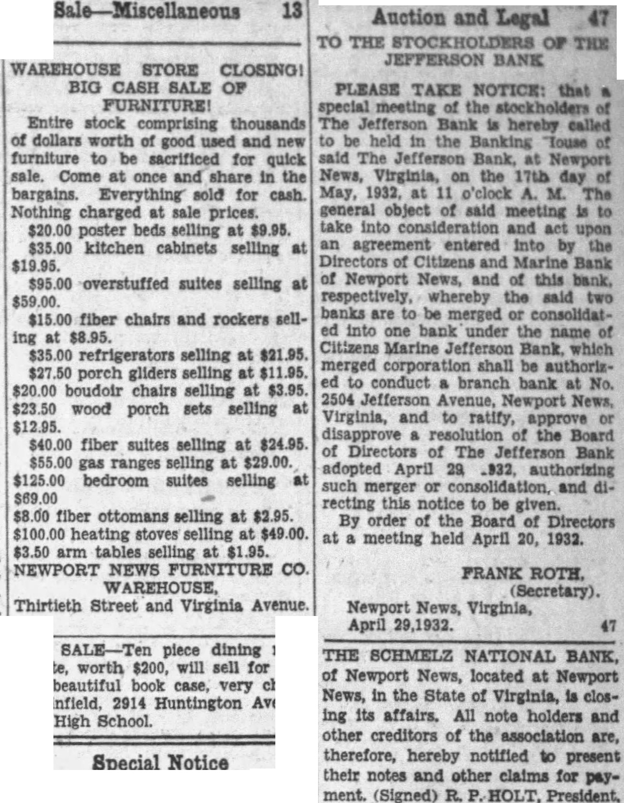13 Auction and Legal 47 TO THE STOCKHOLDERS OF THE JEFFERSON BANK WAREHOUSE STORE CLOSING! BIG CASH SALE OF FURNITURE! Entire stock comprising thousands of dollars worth good used and furniture to be sacrificed for quick sale. Come at once and share in the bargains. Everything sold for cash. Nothing charged sale prices. poster selling at $9.95. kitchen cabinets selling at $19.95. overstuffed suites selling at $59.00. fiber chairs and rockers selling at $8.95. refrigerators selling at porch gliders selling at boudoir chairs selling at $3.95. $23.50 wood porch sets selling at $12.95. fiber suites selling at $24.95. $55.00 selling at $29.00. $125.00 bedroom selling at fiber ottomans selling at $2.95. heating $49.00. $3.50 arm tables selling at $1.95. NEWPORT NEWS FURNITURE CO. WAREHOUSE, Thirtieth Street and Virginia Avenue PLEASE TAKE NOTICE: that the The Jefferson Bank is hereby be held in the Touse said The Jefferson Bank, Newport News, Virginia, on the 17th day May, 1932, 11 o'clock The general object of said meeting take into consideration and act upon an agreement entered into by the Citizens and Marine Bank of Newport News, and of this bank, respectively, whereby the said two are be merged ed into one bank under the name of Citizens Marine Jefferson which merged corporation shall be authorized to conduct branch bank No. 2504 Jefferson Avenue, Newport Virginia, and to ratify, approve disapprove of the Board of Directors of The Jefferson Bank adopted April 29, .932, authorizing merger or consolidation, and directing this notice to be given. By order of Directors at meeting held April 20, 1932. FRANK ROTH. (Secretary). Newport News, Virginia, April 29,1932. 47 THE SCHMELZ NATIONAL BANK, of Newport News, located at Newport News, in the State of Virginia, is closing its affairs. All note holders and other of the are, therefore, hereby notified to present their notes other claims for payment. (Signed) R. HOLT, President.