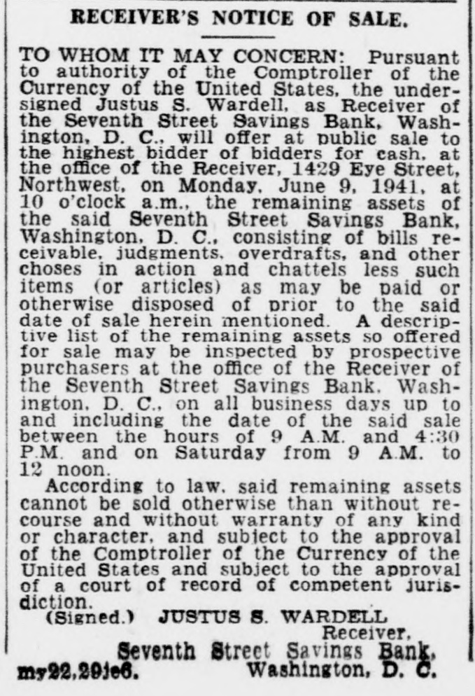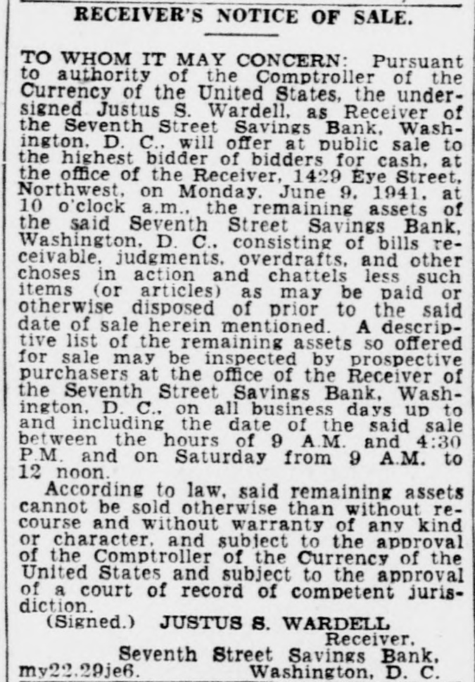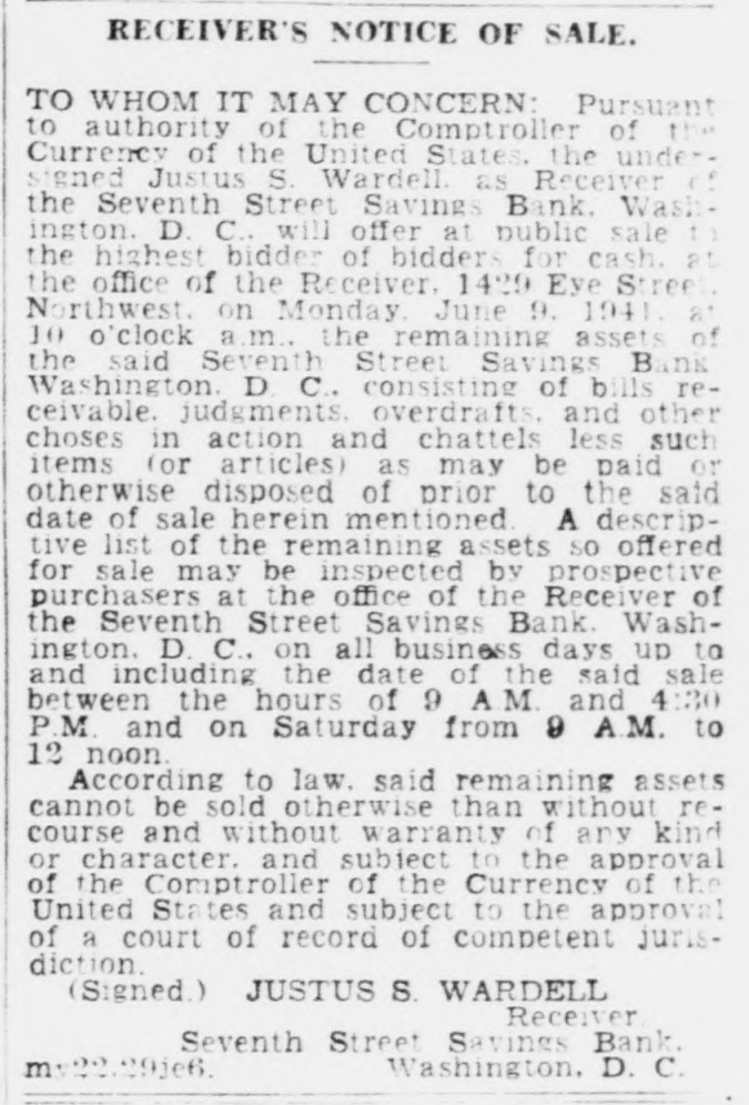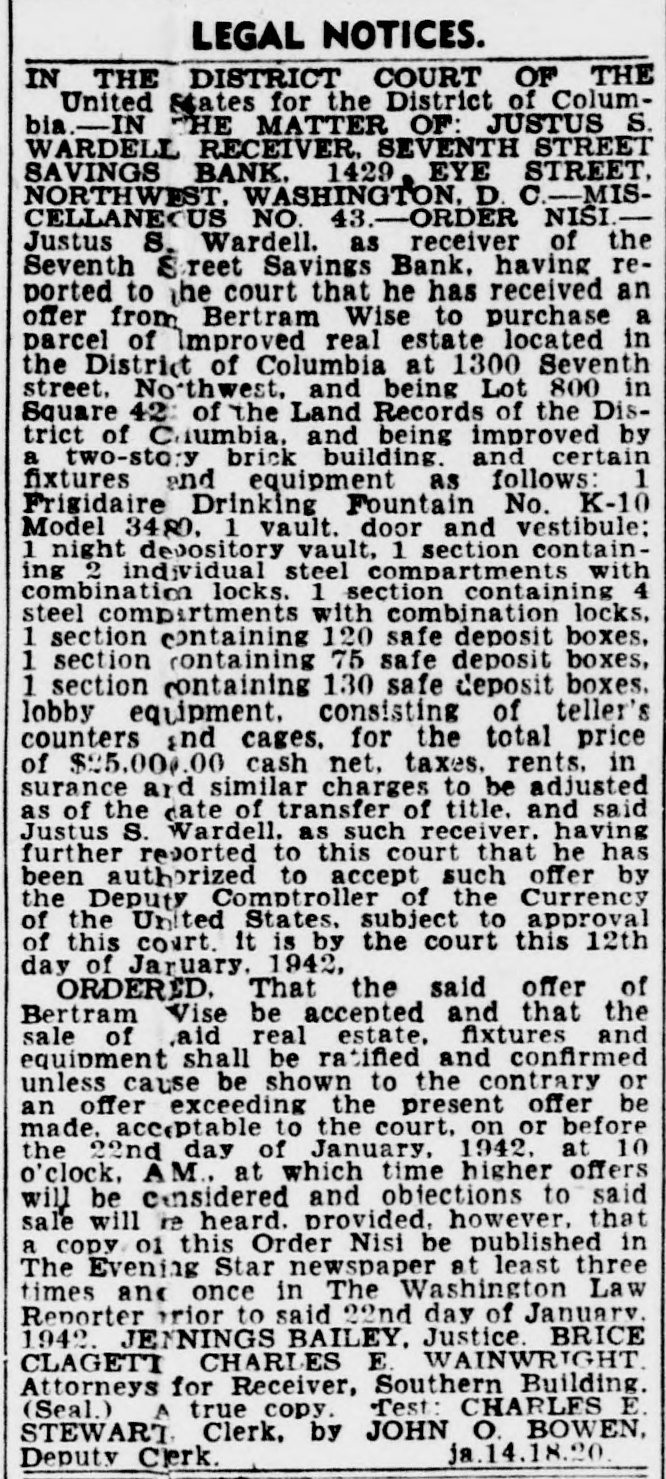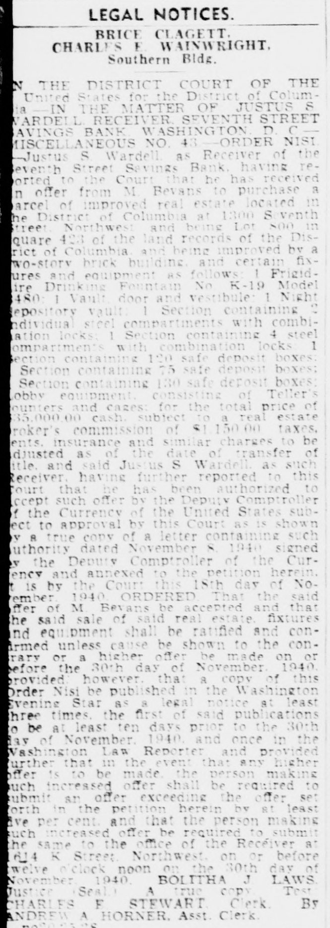 LEGAL NOTICES. BRICE CLAGETT CHARLES F WAINWRIGHT. Southern Bldg. N THE DISTRICT COURT OF THE United States for the District of Colum- S -IN THE MATTER OF JUSTUS VARDEIL RECEIVER SEVENTH STREET AVINGS BANK WASHINGTON D NISI C MISCELLANEOUS NO. 43 -ORDER Justus S Wardell as Receiver of the eventh Street Savings Bank having reorted to the Court that be has received a offer from M Bevans to purchase arcel n of improved real estate located venth in District of Columbia at 1300 S soo in he Northwest and being Lot street 423 of the land records of the by Dis- a quare of Columbia and being improved fixwo-story rict brick building and certain and equipment as follows 1 Frigidures Drinking Fountain No K-19 Model ire 480 1 Vault door and vestibule 1 Night depository vault 1 Section containing individual steel compartments with combiation locks 1 Section containing 4 steel 1 compartment with combination locks Section containing 120 safe deposit boxes: Section containing 75 safe deposit boxes: Section containing 130 safe deposit boxes: obby equipment consisting of Teller's ounters and cages: for the total price of 35,000.00 cash subject to a real estate broker's commission of $1.150.00 taxes, be ents. insurance and similar charges to of duusted as of the date of transfer title. and said Jus us S Wardell as such this having further reported to Receiver that he has been authorized to Court accept such offer by the Deputy Comptroller the Currency of the United States subect f to approval by this Court as is shown v A true copy of a letter containing such authority dated November S 1940 signed the Deputy Comptroller of the Cury ency and annexed to the petition herein. is by the Court this 18th day of NoIt rember 1940 ORDFRED That the said of M Bevans be accepted and that the ffer said sale of said real estate fixtures nd equ pment shall be ratified and conArmed unless cause be shown to the conor a higher offer be made on 1940 or before rary the 30th day of November provided however. that 8 copy of this Order Nisi be published in the Washington Evening Star as a legal notice at least three times. the first of said publications be at least ten days prior to the 30th o of November 1940 and once in the Washington day LAW Reporter and provided further that in the event that any higher is to be made the person making offer such increased offer shall be required to submit an offer exceeding the offer set forth in the petition herein by at least ave per cent and that the person making such increased offer be required to submit he same to the office of the Receiver at 614 K Street Northwest on or before welve n'clock noon on the 30th day of November 1940 BOLITHA J LAWS Seal A true copy Test Justice CHARLES F STFWART Clerk By NDREW A HORNER. Asst. Clerk