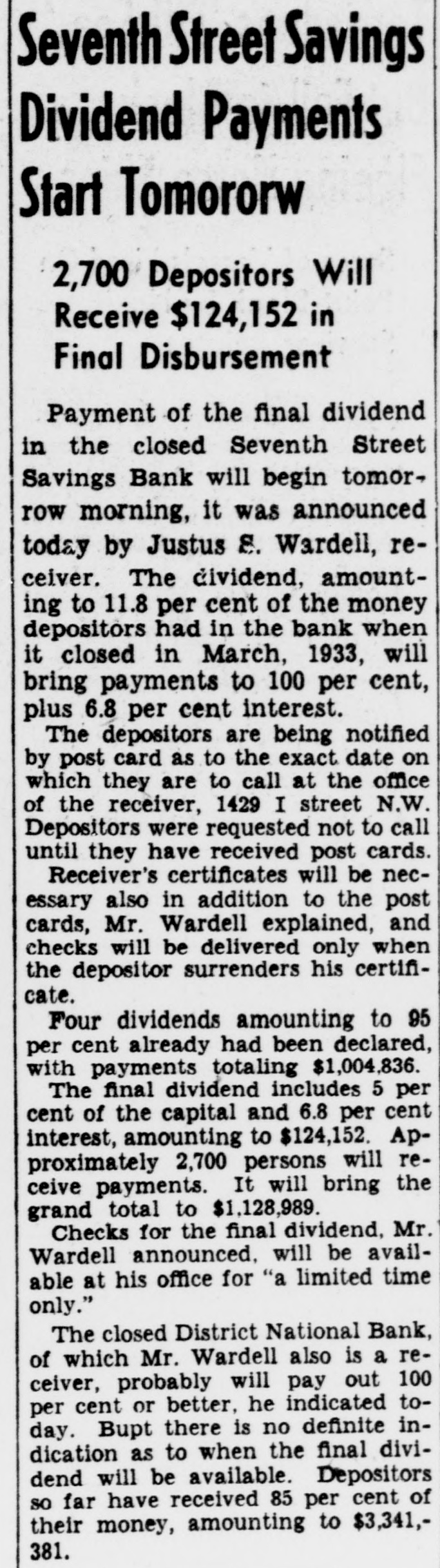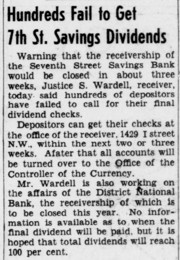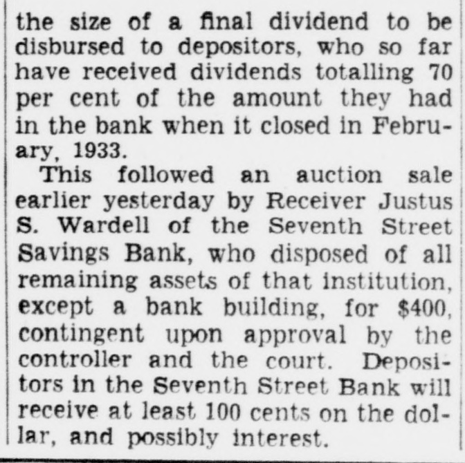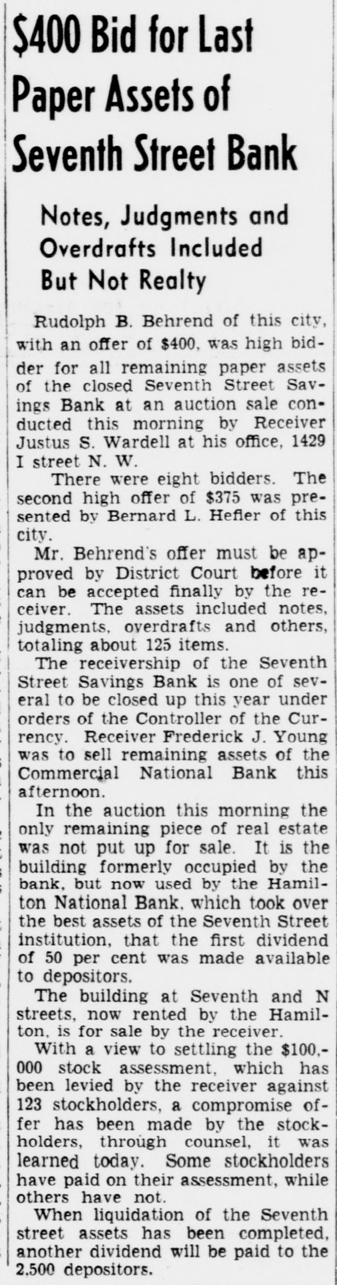 LEGAL NOTICES. BRICE CLAGETT CHARLES F WAINWRIGHT. Southern Bldg. N THE DISTRICT COURT OF THE United States for the District of Colum- S -IN THE MATTER OF JUSTUS VARDEIL RECEIVER SEVENTH STREET AVINGS BANK WASHINGTON D NISI C MISCELLANEOUS NO. 43 -ORDER Justus S Wardell as Receiver of the eventh Street Savings Bank having reorted to the Court that be has received a offer from M Bevans to purchase arcel n of improved real estate located venth in District of Columbia at 1300 S soo in he Northwest and being Lot street 423 of the land records of the by Dis- a quare of Columbia and being improved fixwo-story rict brick building and certain and equipment as follows 1 Frigidures Drinking Fountain No K-19 Model ire 480 1 Vault door and vestibule 1 Night depository vault 1 Section containing individual steel compartments with combiation locks 1 Section containing 4 steel 1 compartment with combination locks Section containing 120 safe deposit boxes: Section containing 75 safe deposit boxes: Section containing 130 safe deposit boxes: obby equipment consisting of Teller's ounters and cages: for the total price of 35,000.00 cash subject to a real estate broker's commission of $1.150.00 taxes, be ents. insurance and similar charges to of duusted as of the date of transfer title. and said Jus us S Wardell as such this having further reported to Receiver that he has been authorized to Court accept such offer by the Deputy Comptroller the Currency of the United States subect f to approval by this Court as is shown v A true copy of a letter containing such authority dated November S 1940 signed the Deputy Comptroller of the Cury ency and annexed to the petition herein. is by the Court this 18th day of NoIt rember 1940 ORDFRED That the said of M Bevans be accepted and that the ffer said sale of said real estate fixtures nd equ pment shall be ratified and conArmed unless cause be shown to the conor a higher offer be made on 1940 or before rary the 30th day of November provided however. that 8 copy of this Order Nisi be published in the Washington Evening Star as a legal notice at least three times. the first of said publications be at least ten days prior to the 30th o of November 1940 and once in the Washington day LAW Reporter and provided further that in the event that any higher is to be made the person making offer such increased offer shall be required to submit an offer exceeding the offer set forth in the petition herein by at least ave per cent and that the person making such increased offer be required to submit he same to the office of the Receiver at 614 K Street Northwest on or before welve n'clock noon on the 30th day of November 1940 BOLITHA J LAWS Seal A true copy Test Justice CHARLES F STFWART Clerk By NDREW A HORNER. Asst. Clerk