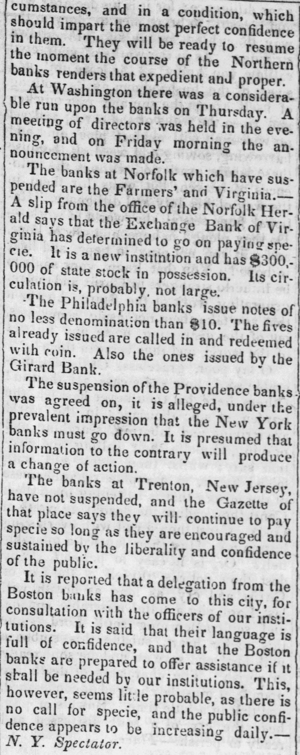 cumstances, and in a condition, which should impart the most perfect confidence in them. They will be ready to resume the moment the course of the Northern banks renders that expedient and proper. At Washington there was a considerable run upon the banks on Thursday. A meeting of directors was held in the evening, and on Friday morning the announcement was made. The banks at Norfolk which have suspended are the Farmers' and Virginia.A slip from the office of the Norfolk Herald says that the Exchange Bank of Virginia has determined to go on paying snecie. It is a new institution and has $300,000 of state stock in possession. Its circulation is, probably. not large. The Philadelphia banks issue notes of no less denomination than $10. The fives already issued are called in and redeemed with coin. Also the ones issued by the Girard Bank. The suspension of the Providence banks was agreed on, it is alleged, under the prevalent impression that the New York banks must go down. It is presumed that information to the contrary will produce a change of action. The banks at Trenton, New Jersey, have not suspended, and the Gazette of that place says they will continue to pay specie so long as they are encouraged and sustained by the liberality and confidence of the public. It is reported that a delegation from the Boston banks has come to this city, for consultation with the officers of our institutions. It is said that their language is full of confidence, and that the Boston banks are prepared to offer assistance if it stall be needed by our institutions. This, however, seems little probable, as there is no call for specie, and the public confidence appears to be increasing daily.N. Y. Spectator.