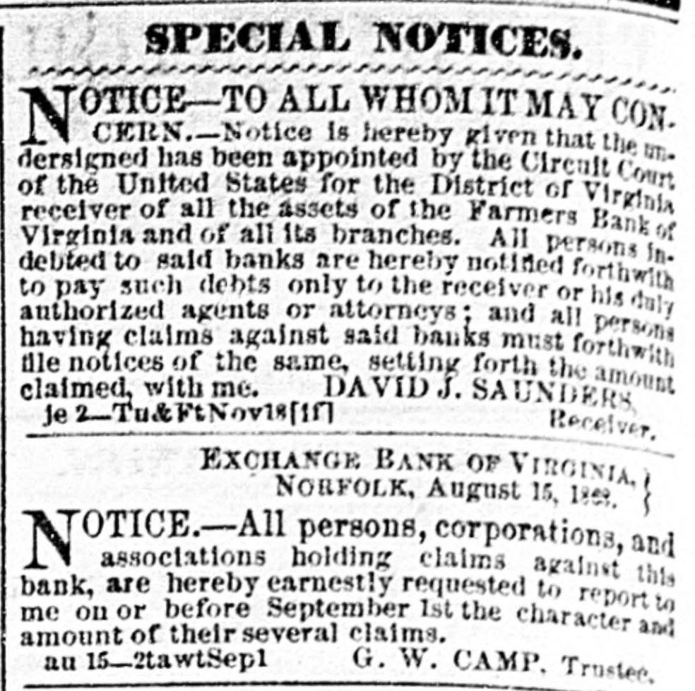 SPECIAL NOTICES. OTICE-TO ALL WHOMITMAY CON. N CERN.-Notice is hereby given that the III. dersigned has been appointed by the Circuit Court of the United States for the District of Virginia receiver of all the assets of the Farmers Bank of Virginia and of all its branches. All persons in. debted to said banks are hereby notified forthwith to pay such debts only to the receiver or his duty authorized agents or attorneys; and all persons having claims against said banks file notices of the same, setting claimed, with me. DAVID J. SAUDERS Je 2-Tu&FtNovis[1]] Receiver. EXCHANGE BANK OF VIRGINIA, NORFOLK, August 15, 1863. N OTICE.-All persons, corporations, and associations holding claims against this bank, are hereby earnestly requested to report to me on or before September 1st the character and amount of their several claims. au 15_2tawtSep1 G. W. CAMP. Trustee.