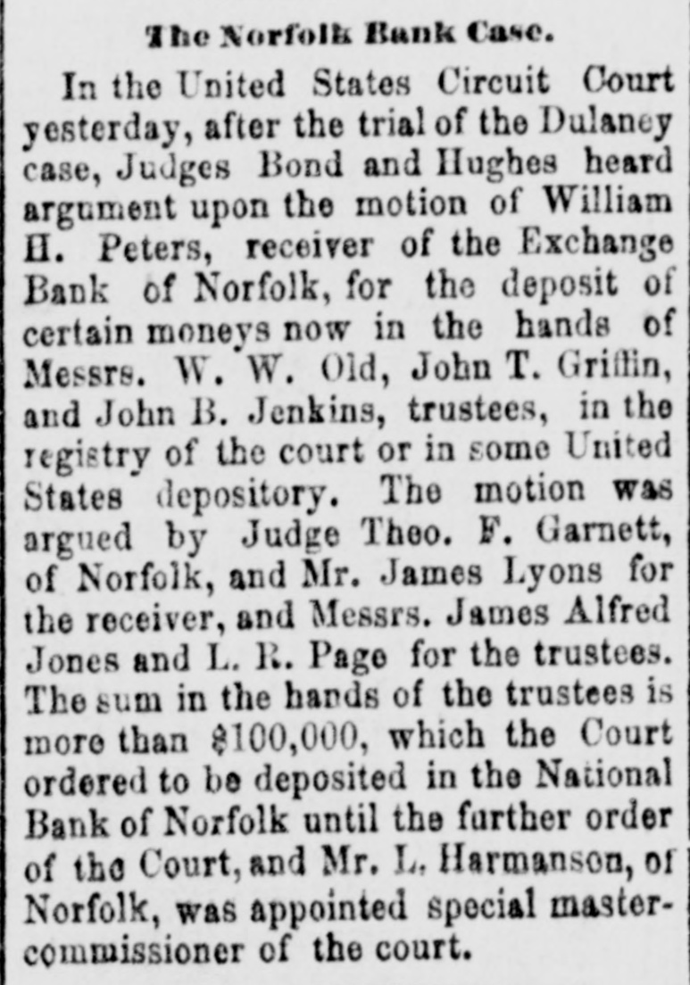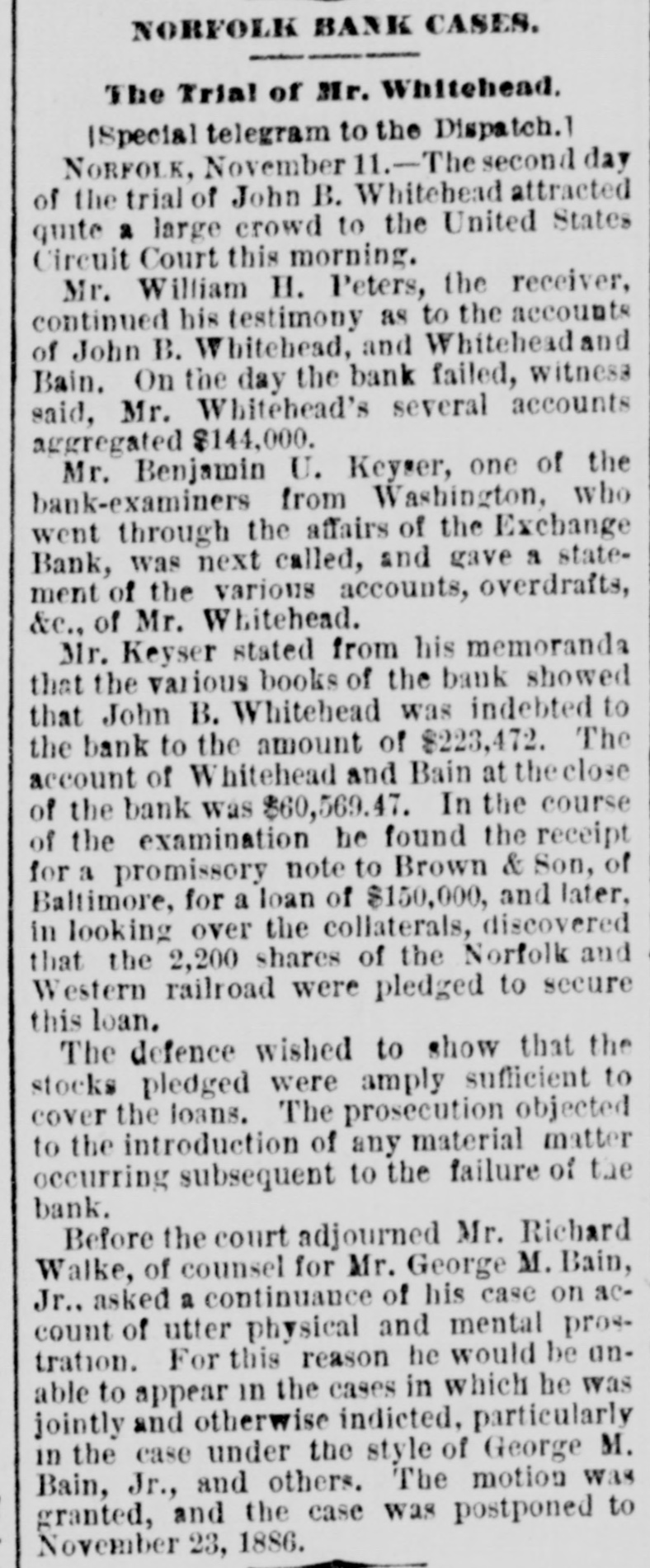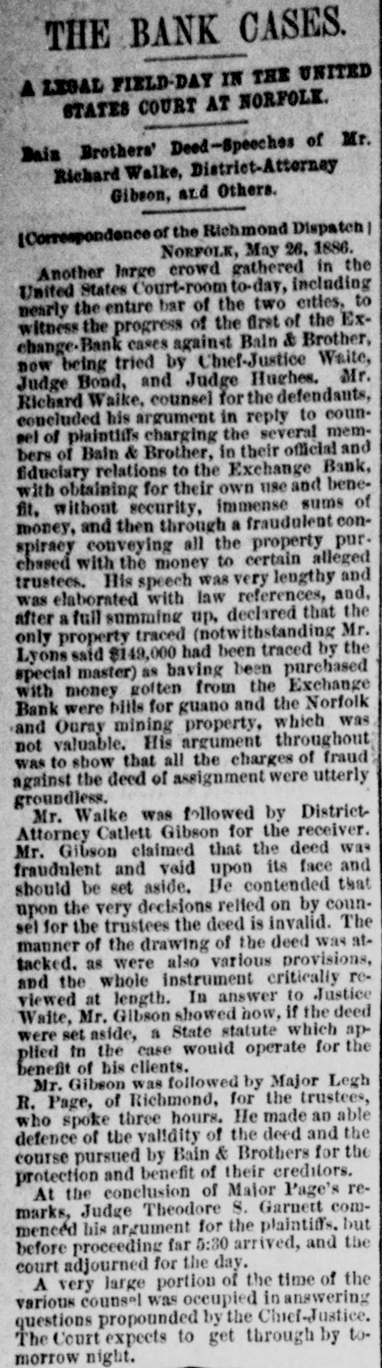 THE BANK CASES. LEGAL FIELD-DAY IN THE UNITED STATES COURT AT NORFOLK. Bain Brothers' Deed-Speeches of Mr. Richard Walke, District-Atterney Gibson, and Others. [Correspondence of the Richmond Dispatch NORFOLK, May 26, 1886. Another large crowd gathered in the United States Court-room to-day, including nearly the entire bar of the two cities, to witness the progress of the first of the Exchange-Bank cases against Bain & Brother, now being tried by Chief-Justice Waite, Judge Bond, and Judge Hughes. Mr. Richard Waike, counsel for the defendants, concluded his argument in reply to counsel of plaintifs charging the several members of Bain & Brother, in their official and fiduciary relations to the Exchange Bank, with obtaining for their own use and benefit. without security, immense sums of money, and then through a fraudulent conspiracy conveying all the property purchased with the money to certain alleged trustees. His speech was very lengthy and was elaborated with law references, and, after a full summine up, declared that the only property traced (notwithstanding Mr. Lyons said $149,000 had been traced by the special master) as baving been purchased with money gotten from the Exchange Bank were bills for guano and the Norfolk and Ouray mining property, which was not valuable. His argument throughout was to show that all the charges of fraud against the deed of assignment were utterly groundless. Mr. Walke was followed by DistrictAttorney Catlett Gibson for the receiver. Mr. Gibson claimed that the deed was fraudulent and vaid upon its face and should be set aside. Be contended that upon the very decisions relied on by counsel for the trustees the deed is invalid. The manner of the drawing of the deed was attacked. as were also various provisions, and the whole instrument critically reviewed at length. In answer to Justice Waite, Mr. Gibson showed how, if the deed were set aside, a State statute which applied in the case would operate for the benefit of his clients. Mr. Gibson was followed by Major Legh R. Page, of Richmond, for the trustees, who spoke three hours. He made an able defence of the validity of the deed and the course pursued by Bain & Brothers for the protection and benefit of their creditors. At the conclusion of Major Page's remarks, Judge Theodore S. Garnett commenced his argument for the plaintiffs. but before proceeding far 5:30 arrived, and the court adjourned for the day. A very large portion of the time of the various counsel was occupied in answering questions propounded by the Chief-Justice. The Court expects to get through by tomorrow night.