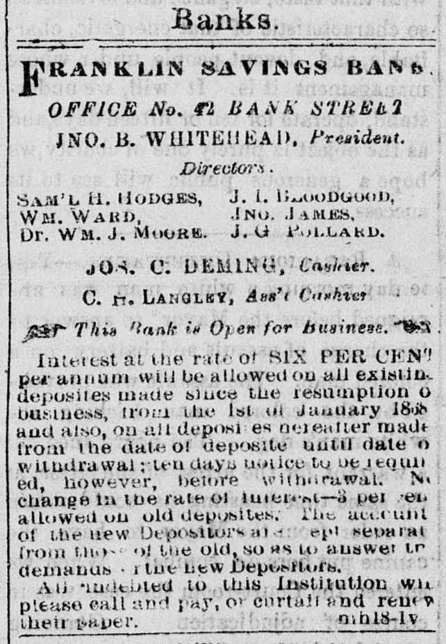 Banks. # FRANKLIN SAVINGS BANG OFFICE No. 42 BANK STRELI JNO. B. WHITEHEAD, President. Directors. SAM'L H. HODGES, J. 1. BLOODGOOD, WM. WARD, JNO. JAMES, Dr. WM. J. MOORE. J.G POLLARD. JOS. C. DEMING, Cashier. C. M. LANGLEY, Ass' Cashier This Bank is Open for business. Interest at the rate of SIX PER CENT per annum will be allowed on all existin. deposites made since the resumption o business, from the 1st of January 1858 and also, on all deposi es nereafter made from the date of deposite until date o withdrawal; ten days notice to be requi-ed, however, before withdrawal. No change in the rate of interest-8 per en allowed on old deposites. The account of the new Depositors aldept separat from the of the old, so as to answer tr demands the new Deposногь. An indebted to this Institution wh please call and pay, or cortait and rener their paper. babyh18-1v
