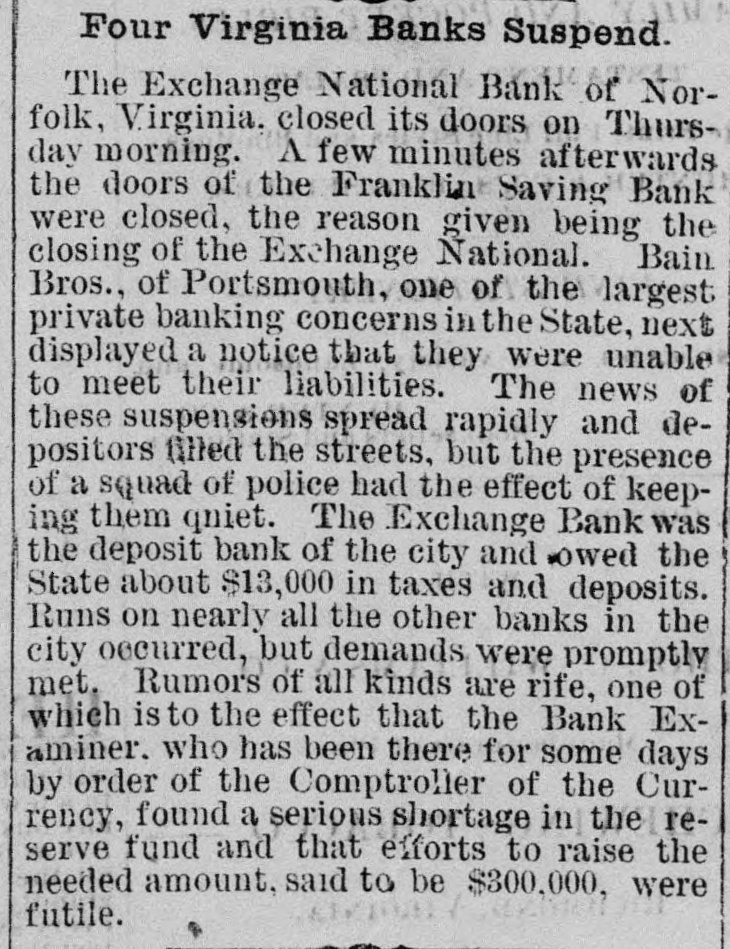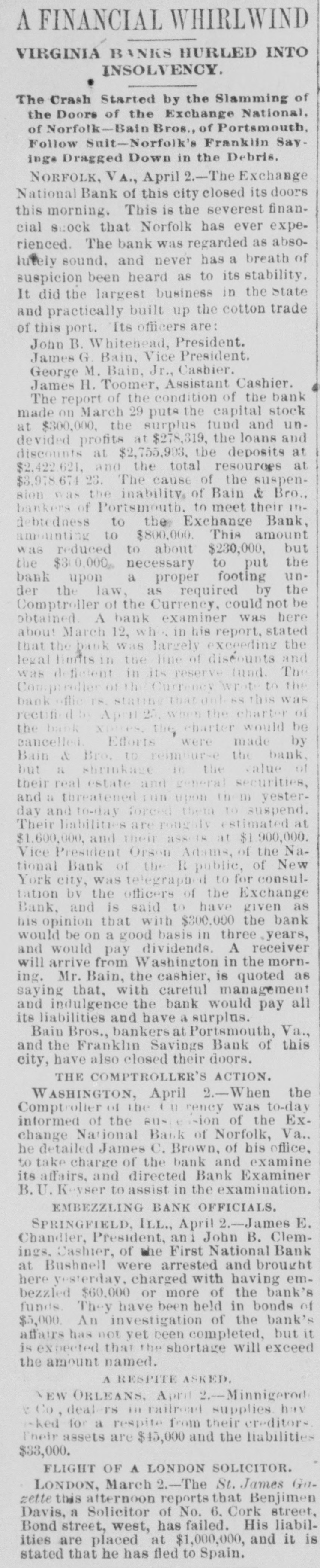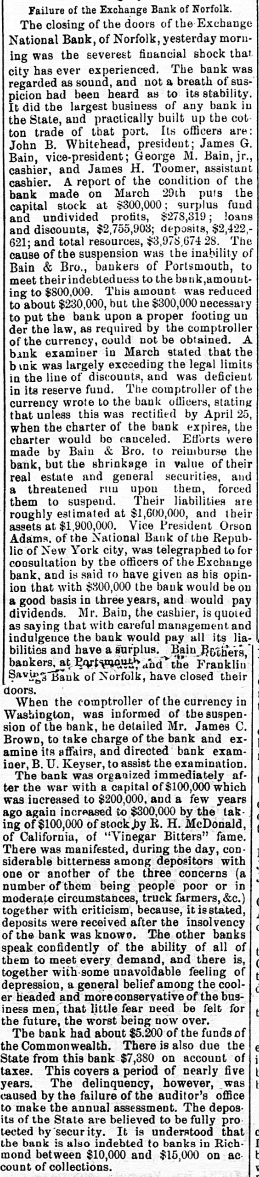 Failure of the Exchange Bank of Norfolk. The closing of the doors of the Exchange National Bank, of Norfolk, yesterday morning was the severest financial shock that city has ever experienced. The bank was regarded as sound, and not a breath of suspicion had been heard as to its stability. It did the largest business of any bank in the State, and practically built up the cotton trade of that port. Its officers are: John B. Whitehead, president; James G. Bain, vice-president; George M. Bain, jr., cashier, and James H. Toomer, assistant cashier. A report of the condition of the bank made on March 29th puts the capital stock at $300,000; surplus fund and undivided profits, $278,319; loans and discounts, $2,755,903; deposits, $2,422,621; and total resources, $3,978,674.28. The cause of the suspension was the inability of Bain & Bro., bankers of Portsmouth, to meet their indebteduess to the bank,amounting to $800,000. This amount was reduced to about $230,000, but the $300,000 necessary to put the bank upon a proper footing un der the law, as required by the comptroller of the currency, could not be obtained. A bank examiner in March stated that the b ink was largely exceeding the legal limits in the line of discounts, and was deficient in its reserve fund. The comptroller of the currency wrote to the bank officers, stating that unless this was rectified by April 25, when the charter of the bank expires, the charter would be canceled. Efforts were made by Bain & Bro. to reimburse the bank, but the shrinkage in value of their real estate and general securities, and a threatened run upon them, forced them to suspend. Their liabilities are roughly estimated at $1,600,000, and their assets at $1,900,000. Vice President Orson Adams. of the National Bank of the Republic of New York city, was telegraphed to for consultation by the officers of the Exchange bank, and is said to have given as his opinion that with $300,000 the bank would be on a good basis in three years, and would pay dividends. Mr. Bain, the cashier, is quoted as saying that with careful management and indulgence the bank would pay all its liabilities and have a surplus. Bain Bothers, bankers, at Partsmouth and the Franklin Saving Bank of Norfolk, have closed their doors. When the comptroller of the currency in Washington, was informed of the suspension of the bank, he detailed Mr. James C. Brown, to take charge of the bank and examine its affairs, and directed bank examiner, B. U. Keyser, to assist the examination. The bank was organized immediately after the war with a capital of $100,000 which was increased to $200,000, and a few years ago again increased to $300,000 by the tak. ing of $100,000 of stock by R. H. McDonald, of California, of "Vinegar Bitters" fame. There was manifested, during the day, considerable bitterness among depositors with one or another of the three concerns (a number of them being people poor or in moderate circumstances, truck farmers, &c.) together with criticism, because, it isstated, deposits were received after the insolvency of the bank was knowo. The other banks speak confidently of the ability of all of them to meet every demand, and there is, together with-some unavoidable feeling of depression, a general belief among the cooler headed and more conservative of the business men, that little fear need be felt for t the future, the worst being now over. The bank had about $5.200 of the funds of the Commonwealth. There is also due the e State from this bank $7,380 on account of i taxes. This covers a period of nearly five t b years. The delinquency, however, was caused by the failure of the auditor's office to make the annual assessment. The depos. its of the State are believed to be fully proo tected by secur ity. It is understood that I the bank is also indebted to banks in Richb mond between $10,000 and $15,000 on ac count of collections.