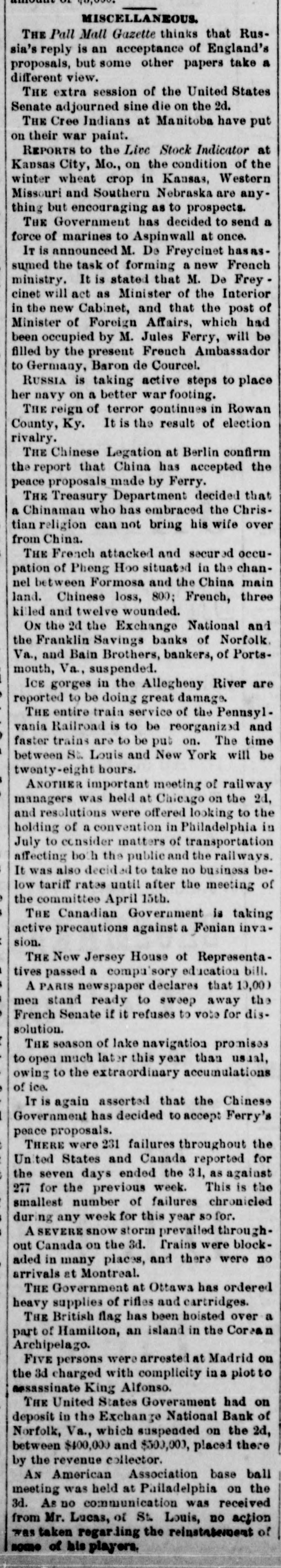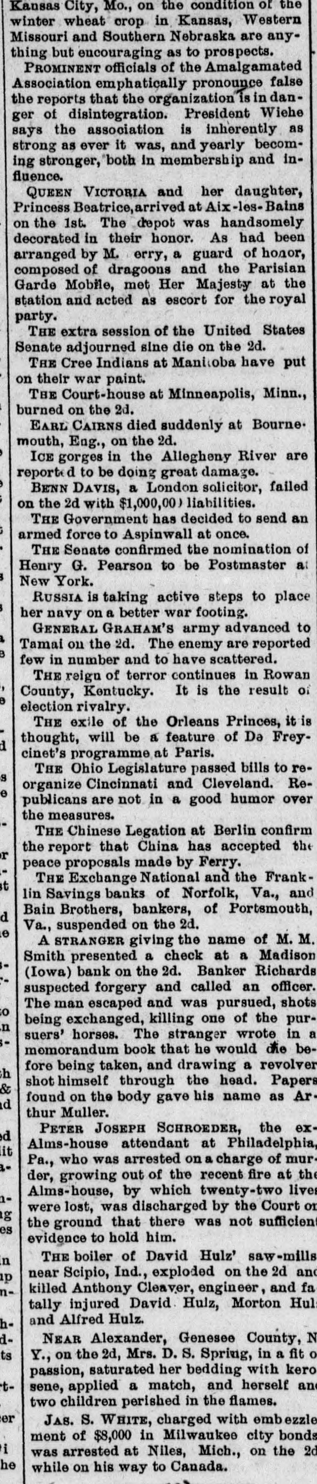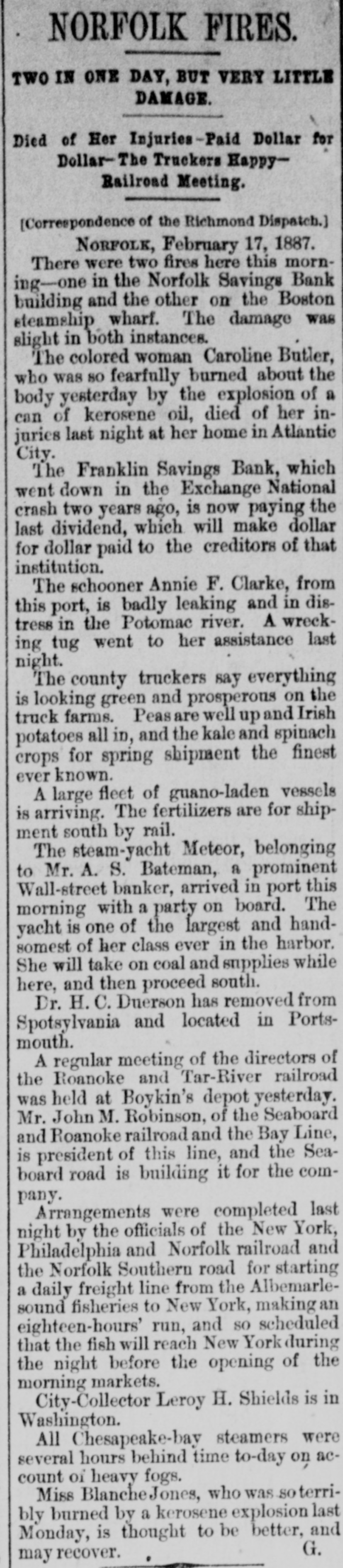 Failure of the Exchange Bank of Norfolk. The closing of the doors of the Exchange National Bank, of Norfolk, yesterday morning was the severest financial shock that city has ever experienced. The bank was regarded as sound, and not a breath of suspicion had been heard as to its stability. It did the largest business of any bank in the State, and practically built up the cotton trade of that port. Its officers are: John B. Whitehead, president; James G. Bain, vice-president; George M. Bain, jr., cashier, and James H. Toomer, assistant cashier. A report of the condition of the bank made on March 29th puts the capital stock at $300,000; surplus fund and undivided profits, $278,319; loans and discounts, $2,755,903; deposits, $2,422,621; and total resources, $3,978,674.28. The cause of the suspension was the inability of Bain & Bro., bankers of Portsmouth, to meet their indebteduess to the bank,amounting to $800,000. This amount was reduced to about $230,000, but the $300,000 necessary to put the bank upon a proper footing un der the law, as required by the comptroller of the currency, could not be obtained. A bank examiner in March stated that the b ink was largely exceeding the legal limits in the line of discounts, and was deficient in its reserve fund. The comptroller of the currency wrote to the bank officers, stating that unless this was rectified by April 25, when the charter of the bank expires, the charter would be canceled. Efforts were made by Bain & Bro. to reimburse the bank, but the shrinkage in value of their real estate and general securities, and a threatened run upon them, forced them to suspend. Their liabilities are roughly estimated at $1,600,000, and their assets at $1,900,000. Vice President Orson Adams. of the National Bank of the Republic of New York city, was telegraphed to for consultation by the officers of the Exchange bank, and is said to have given as his opinion that with $300,000 the bank would be on a good basis in three years, and would pay dividends. Mr. Bain, the cashier, is quoted as saying that with careful management and indulgence the bank would pay all its liabilities and have a surplus. Bain Bothers, bankers, at Partsmouth and the Franklin Saving Bank of Norfolk, have closed their doors. When the comptroller of the currency in Washington, was informed of the suspension of the bank, he detailed Mr. James C. Brown, to take charge of the bank and examine its affairs, and directed bank examiner, B. U. Keyser, to assist the examination. The bank was organized immediately after the war with a capital of $100,000 which was increased to $200,000, and a few years ago again increased to $300,000 by the tak. ing of $100,000 of stock by R. H. McDonald, of California, of "Vinegar Bitters" fame. There was manifested, during the day, considerable bitterness among depositors with one or another of the three concerns (a number of them being people poor or in moderate circumstances, truck farmers, &c.) together with criticism, because, it isstated, deposits were received after the insolvency of the bank was knowo. The other banks speak confidently of the ability of all of them to meet every demand, and there is, together with-some unavoidable feeling of depression, a general belief among the cooler headed and more conservative of the business men, that little fear need be felt for t the future, the worst being now over. The bank had about $5.200 of the funds of the Commonwealth. There is also due the e State from this bank $7,380 on account of i taxes. This covers a period of nearly five t b years. The delinquency, however, was caused by the failure of the auditor's office to make the annual assessment. The depos. its of the State are believed to be fully proo tected by secur ity. It is understood that I the bank is also indebted to banks in Richb mond between $10,000 and $15,000 on ac count of collections.