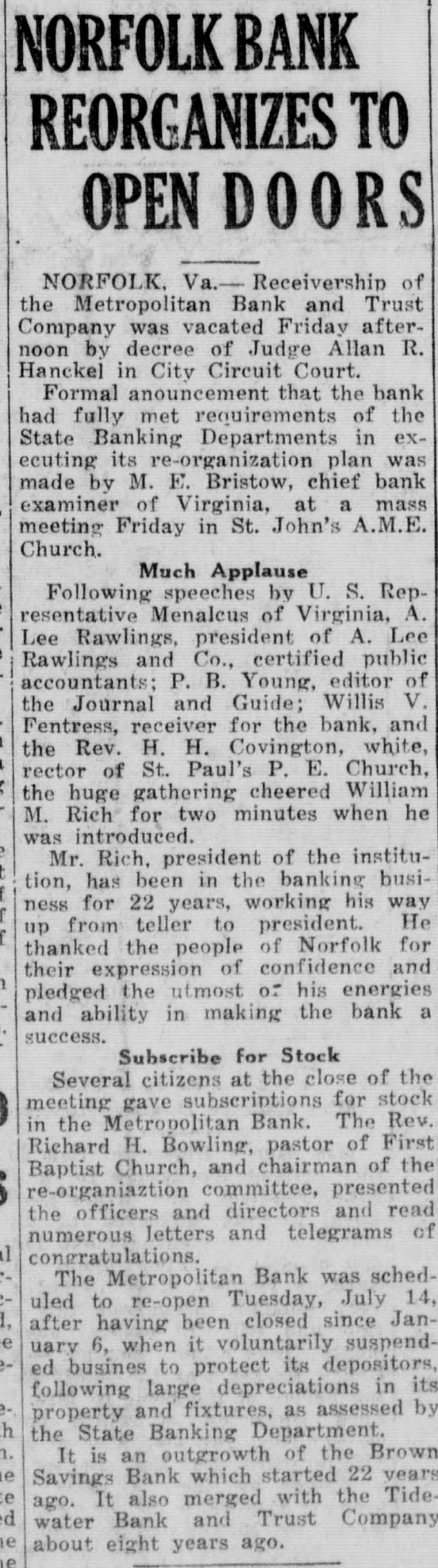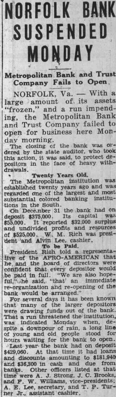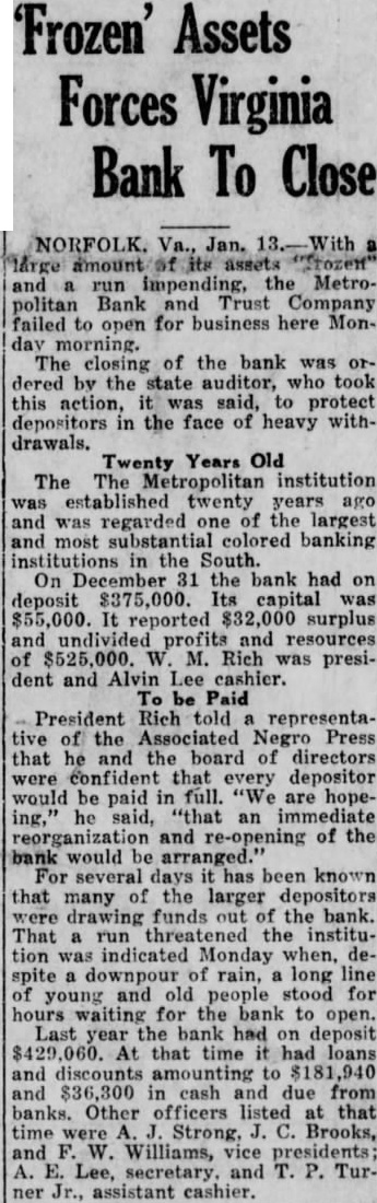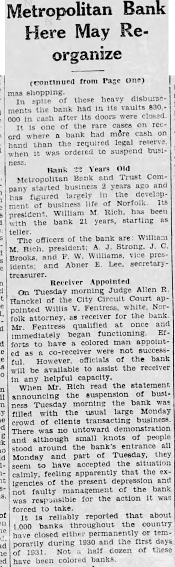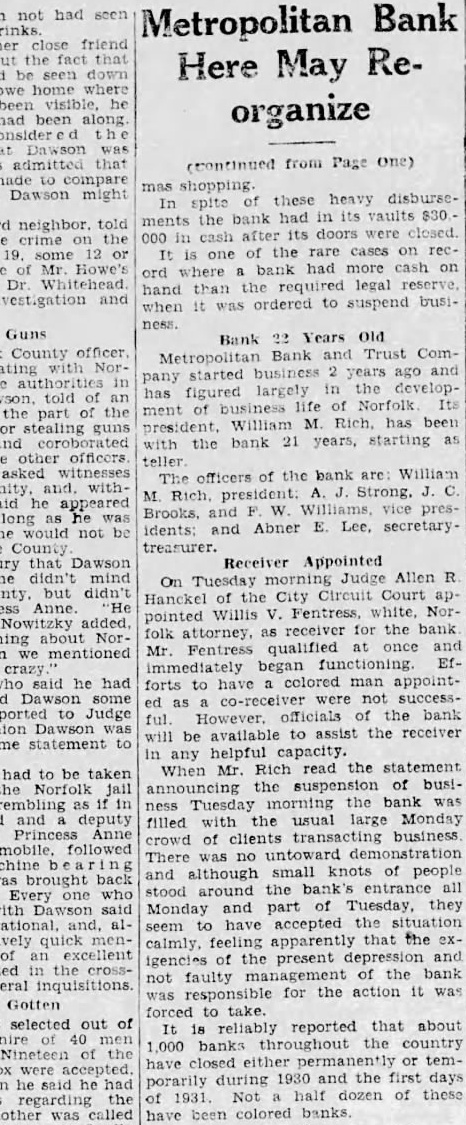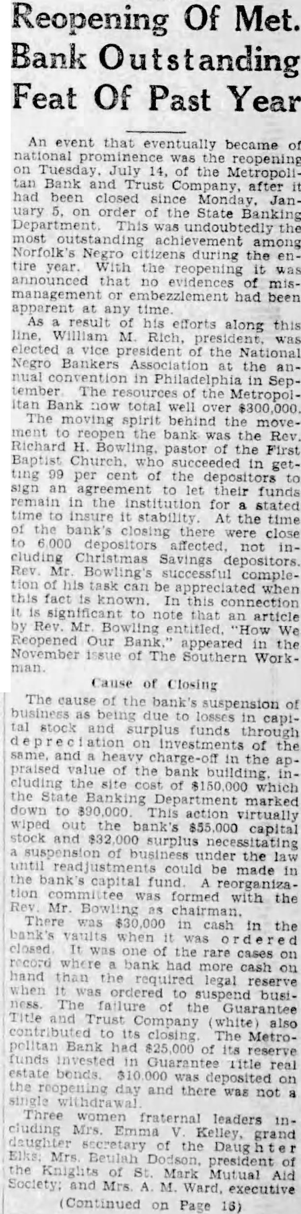 William Rich, who was president Metropolitan the bank went into receivership, severely criticised the out-oftown newspaper article, as having closed his account bank the exception of Christmas account and having notes in the the bank. The Rev. Richard H. Bowling, rector, Strong, president, also came in for much criticism. When asked by the Journal Guide his Mr. Rich produced records to show original purchase of stock shares total of $12,750. later dividend of 34 shares brought total number of shares up 136, value $125 per share. June 18th, 1926, records of the bank show, Mr. Rich voluntarily 108 shares with value along with shares surrendered by other officand stockholders, to offset lossers the bank had sustained from securities and bad loans preciated The records that January 5th, 1931 when on the bank first into Mr. Rich owed the $2,555, note $95, his $40 insurendorsed by of $125 secured ance deed note by first deed trust for second $800, and his stock holdtrust Since the receivership ings. reduced having paid When June the bank its second and final ceivership, Mr. Rich had balance his which seized the receiver and applied on his notes. The amount he now owes, the former president the Journal and Guide, the balance he owes his purchase of stock the bank, and does money advanced to him for any other purposes.