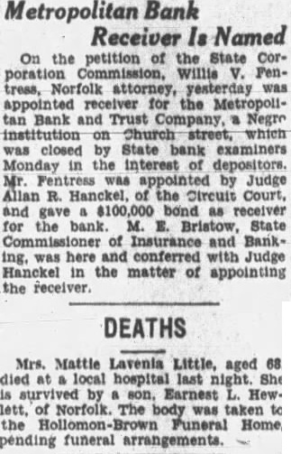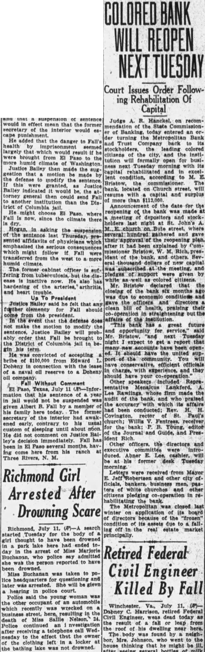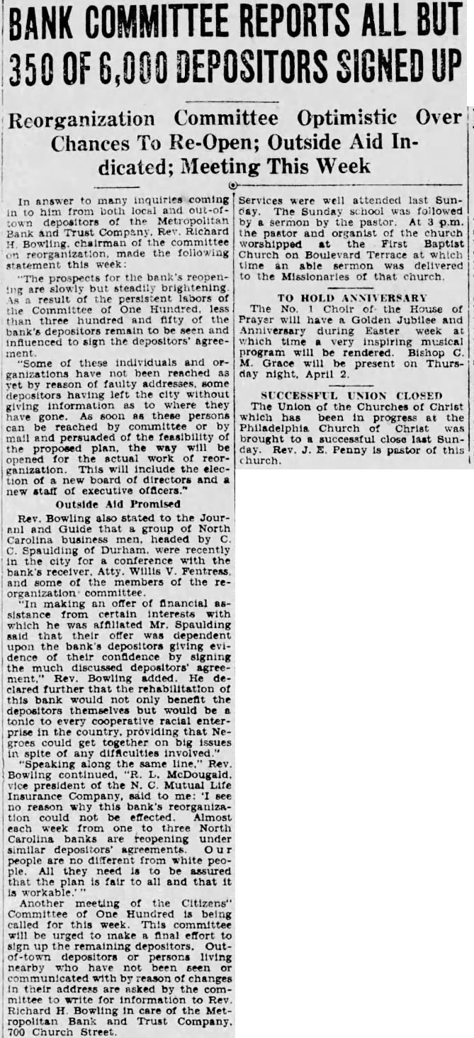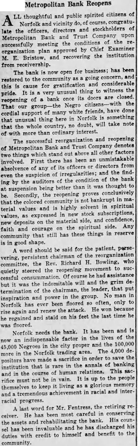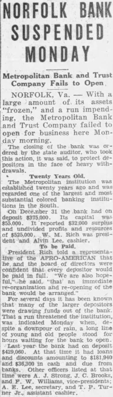 William Rich, who was president Metropolitan the bank went into receivership, severely criticised the out-oftown newspaper article, as having closed his account bank the exception of Christmas account and having notes in the the bank. The Rev. Richard H. Bowling, rector, Strong, president, also came in for much criticism. When asked by the Journal Guide his Mr. Rich produced records to show original purchase of stock shares total of $12,750. later dividend of 34 shares brought total number of shares up 136, value $125 per share. June 18th, 1926, records of the bank show, Mr. Rich voluntarily 108 shares with value along with shares surrendered by other officand stockholders, to offset lossers the bank had sustained from securities and bad loans preciated The records that January 5th, 1931 when on the bank first into Mr. Rich owed the $2,555, note $95, his $40 insurendorsed by of $125 secured ance deed note by first deed trust for second $800, and his stock holdtrust Since the receivership ings. reduced having paid When June the bank its second and final ceivership, Mr. Rich had balance his which seized the receiver and applied on his notes. The amount he now owes, the former president the Journal and Guide, the balance he owes his purchase of stock the bank, and does money advanced to him for any other purposes.
