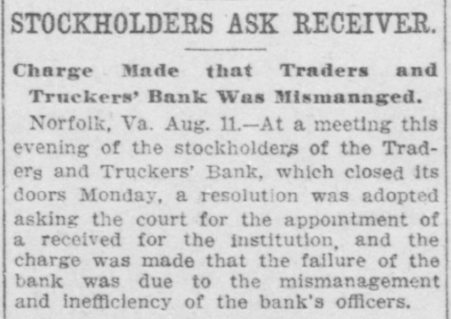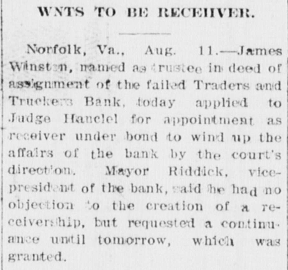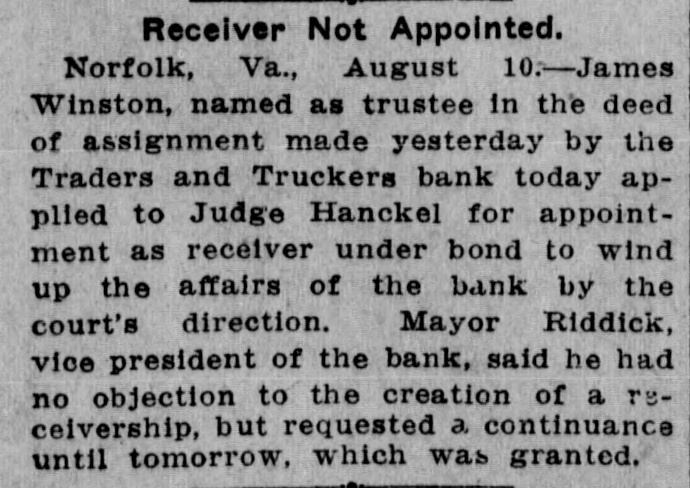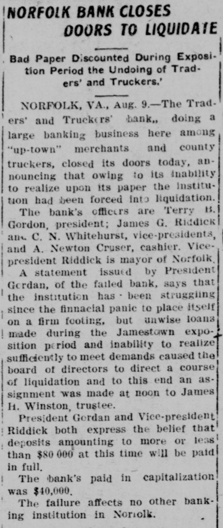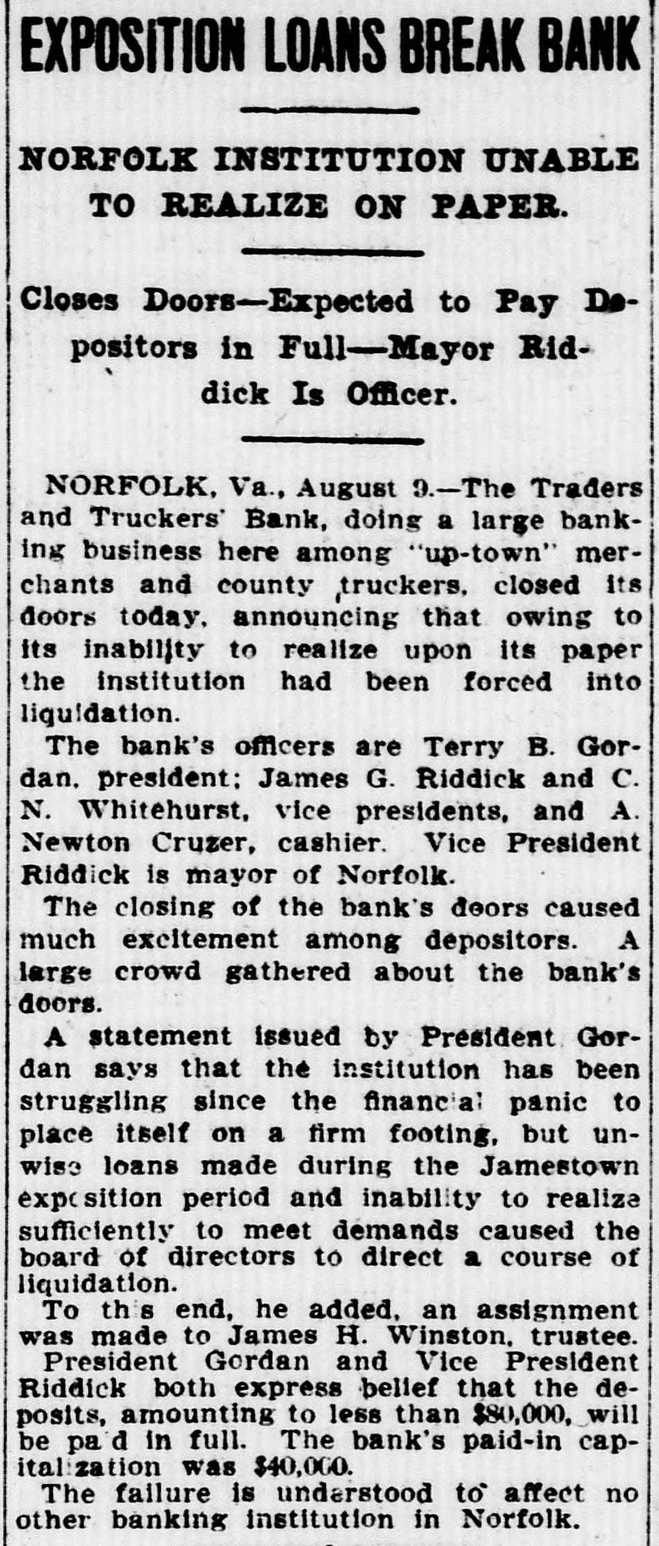 EXPOSITION LOANS BREAK BANK NORFOLK INSTITUTION UNABLE To REALIZE ON PAPER. Closes Doors-Expected to Pay Depositors in Full-Mayor Riddick Is Officer. NORFOLK, Va., August 9.-The Traders and Truckers' Bank, doing a large banking business here among "up-town" merchants and county truckers, closed its doors today. announcing that owing to its inability to realize upon its paper the institution had been forced into liquidation. The bank's officers are Terry B. Gordan. president: James G. Riddick and C. N. Whitehurst, vice presidents, and A. Newton Cruzer, cashier. Vice President Riddick is mayor of Norfolk. The closing of the bank's deors caused much excitement among depositors. A large crowd gathered about the bank's doors. A statement issued by President Gordan says that the institution has been struggling since the financial panic to place itself on a firm footing, but unwise loans made during the Jamestown exposition period and inability to realize sufficiently to meet demands caused the board of directors to direct a course of liquidation. To this end, he added, an assignment was made to James H. Winston, trustee. President Gordan and Vice President Riddick both express belief that the deposits, amounting to less than $80,000, will be paid in full. The bank's paid-in capitalization was $40,000. The failure is understood to affect no other banking institution in Norfolk.