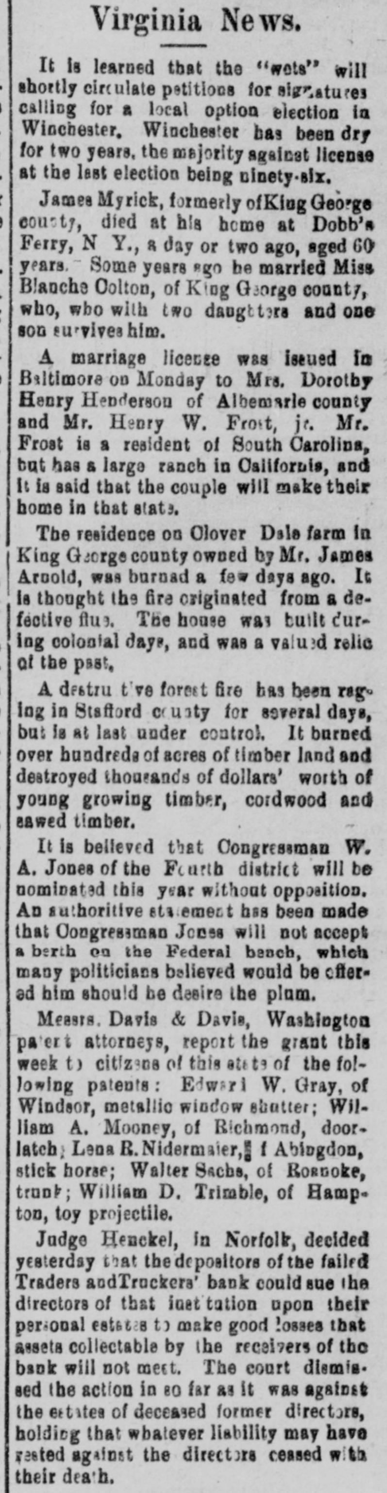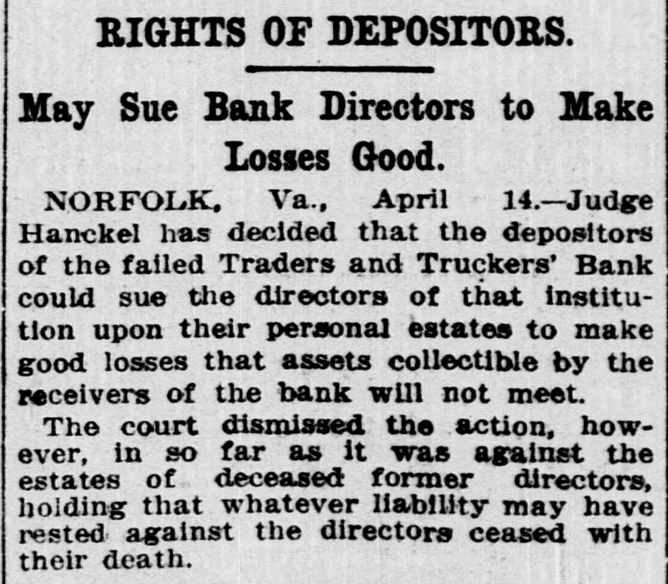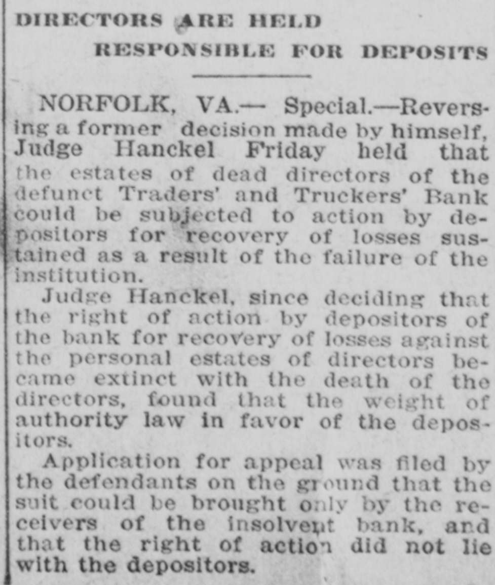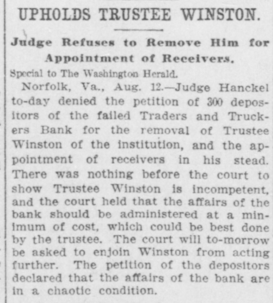 EXPOSITION LOANS BREAK BANK NORFOLK INSTITUTION UNABLE To REALIZE ON PAPER. Closes Doors-Expected to Pay Depositors in Full-Mayor Riddick Is Officer. NORFOLK, Va., August 9.-The Traders and Truckers' Bank, doing a large banking business here among "up-town" merchants and county truckers, closed its doors today. announcing that owing to its inability to realize upon its paper the institution had been forced into liquidation. The bank's officers are Terry B. Gordan. president: James G. Riddick and C. N. Whitehurst, vice presidents, and A. Newton Cruzer, cashier. Vice President Riddick is mayor of Norfolk. The closing of the bank's deors caused much excitement among depositors. A large crowd gathered about the bank's doors. A statement issued by President Gordan says that the institution has been struggling since the financial panic to place itself on a firm footing, but unwise loans made during the Jamestown exposition period and inability to realize sufficiently to meet demands caused the board of directors to direct a course of liquidation. To this end, he added, an assignment was made to James H. Winston, trustee. President Gordan and Vice President Riddick both express belief that the deposits, amounting to less than $80,000, will be paid in full. The bank's paid-in capitalization was $40,000. The failure is understood to affect no other banking institution in Norfolk.