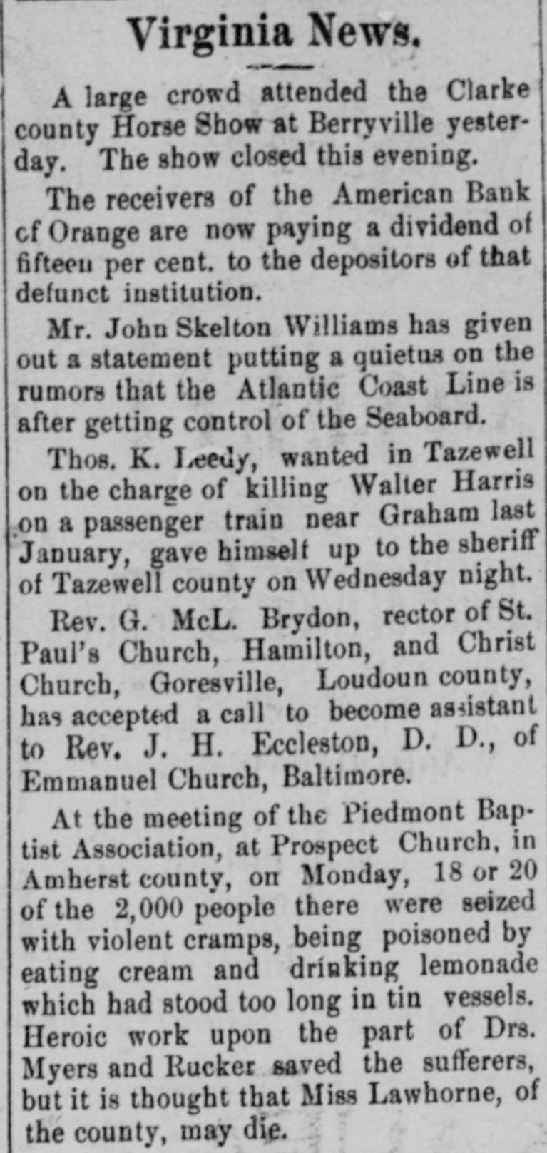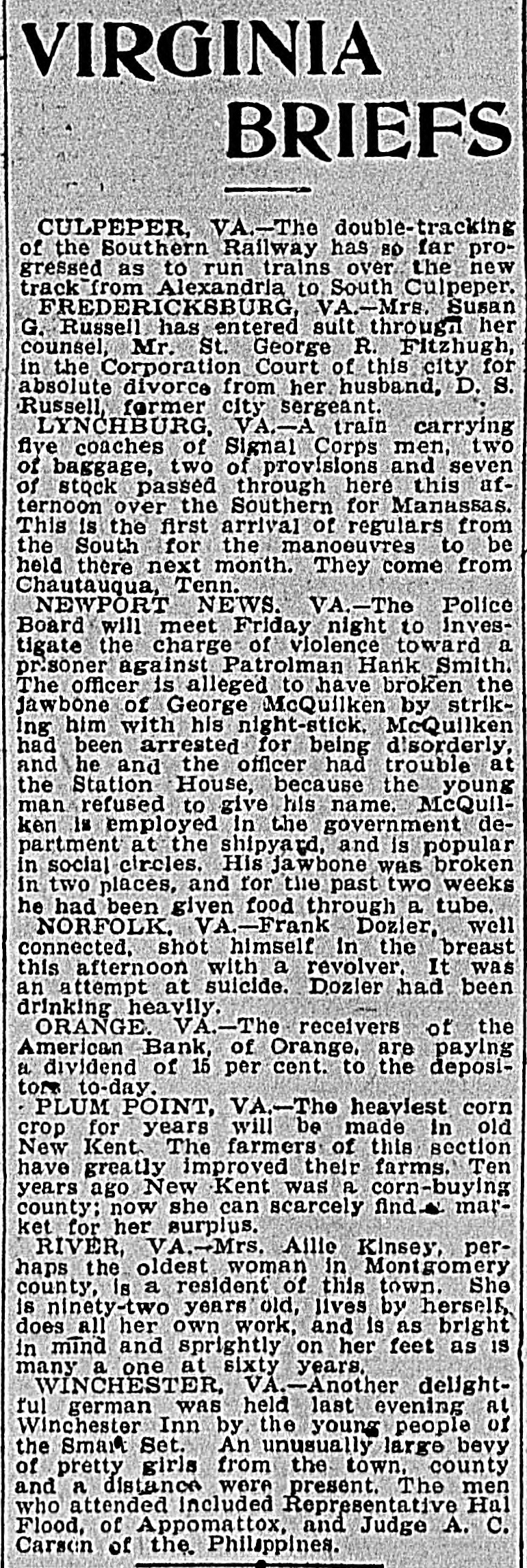 VIRGINIA BRIEFS CULPEPER, VA.-The double-tracking of the Southern Railway has 80 far progressed as to run trains over the new track from Alexandria to South Culpeper. FREDERICKSBURG, VA.-Mrs. Susan G. Russell has entered suit through her counsel, Mr. St. George R. Fitzhugh, in the Corporation Court of this city for absolute divorce from her husband, D. S. Russell, former city sergeant. LYNCHBURG, VA.-A train carrying five coaches of Signal Corps men, two of baggage, two of provisions and seven of stock passed through here this afternoon over the Southern for Manassas. This is the first arrival of regulars from the South for the manoeuvres to be held there next month. They come from Chautauqua, Tenn. NEWPORT NEWS. VA.-The Police Board will meet Friday night to investigate the charge of violence toward a pr.soner against Patrolman Hank Smith. The officer is alleged to have broken the jawbone of George McQuilken by striking him with his night-stick. McQuilken had been arrested for being disorderly, and he and the officer had trouble at the Station House, because the young man refused to give his name. McQuilken is employed in the government department at the shipyard, and is popular in social circles. His jawbone was broken in two places, and for the past two weeks he had been given food through a tube. NORFOLK, VA.-Frank Dozier, well connected, shot himself in the breast this afternoon with a revolver. It was an attempt at suicide. Dozler had been drinking heavily. ORANGE. VA.-The receivers of the American Bank, of Orange, are paying a dividend of 15 per cent. to the depositore to-day. PLUM POINT, VA.-The heaviest corn crop for years will be made in old New Kent. The farmers of this section have greatly improved their farms. Ten years ago New Kent was a corn-buying county; now she can scarcely find-s. market for her surplus. RIVER, VA.-Mrs. Aille Kinsey, perhaps the oldest woman in Montgomery county, is a resident of this town. She is ninety-two years old, lives by herself, does all her own work, and is as bright in mind and sprightly on her feet as is many a one at sixty years. WINCHESTER, VA.-Another delightful german was held last evening at Winchester Inn by the young people of the Smart Set. An unusually large bevy of pretty girls from the town, county and a distance were present. The men who attended included Representative Hal Flood, of Appomattox, and Judge A. C. Carson of the Philsppines.