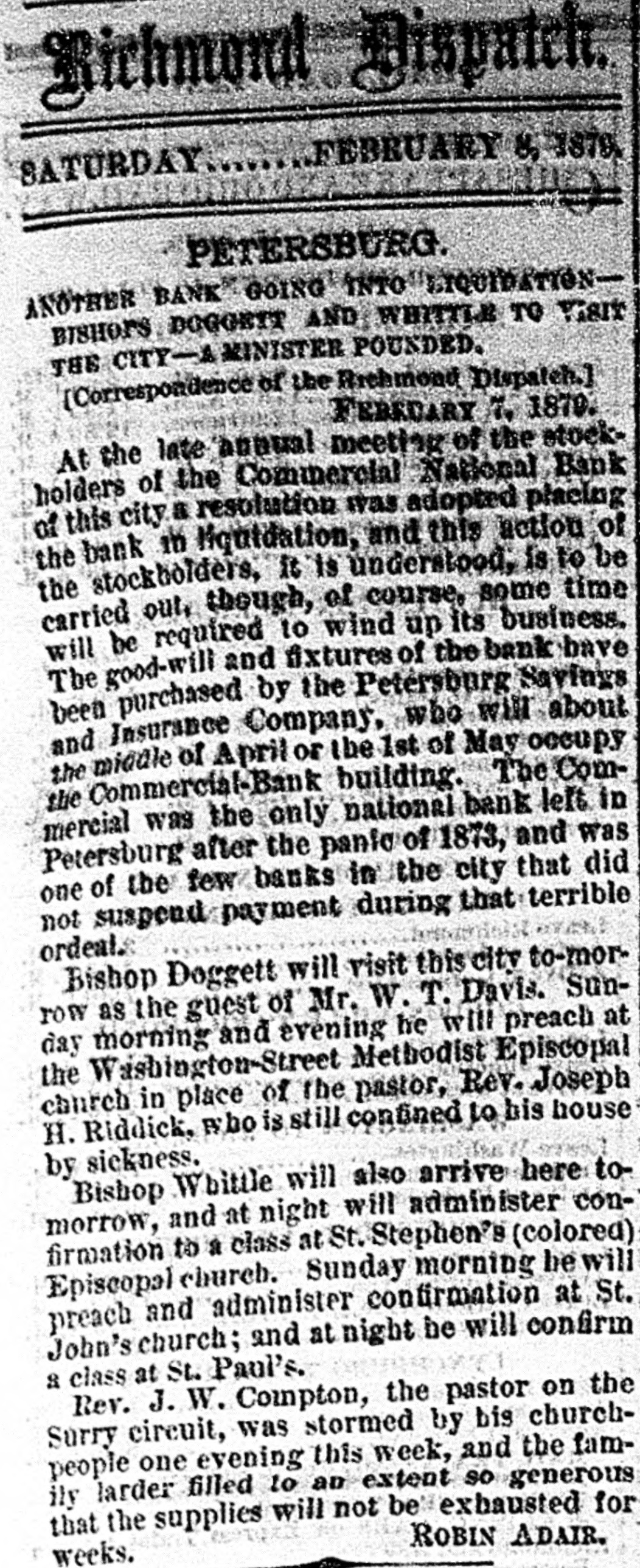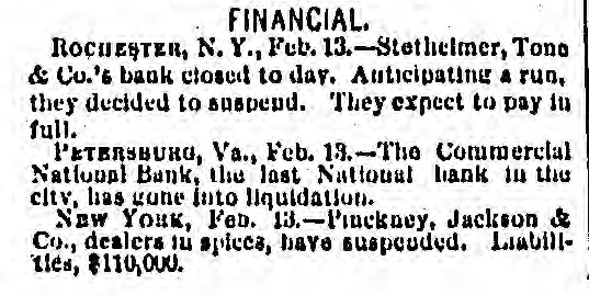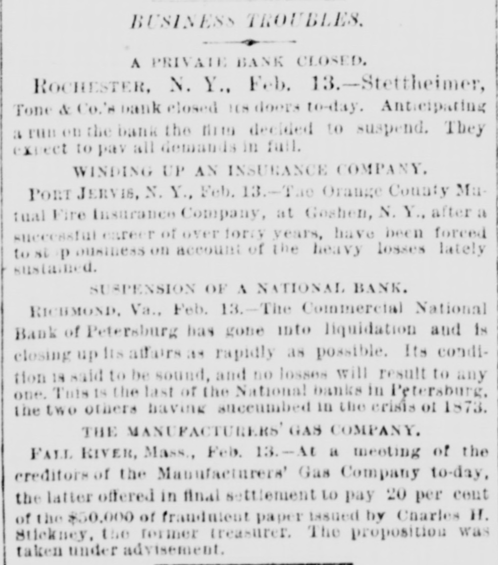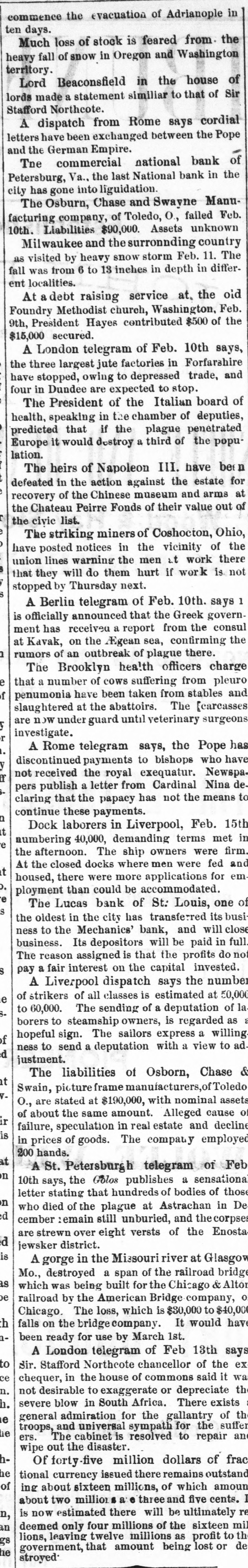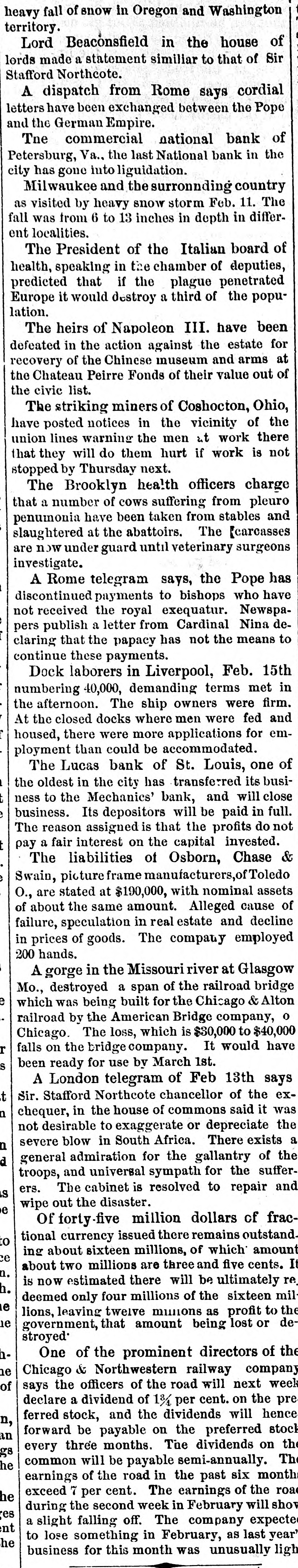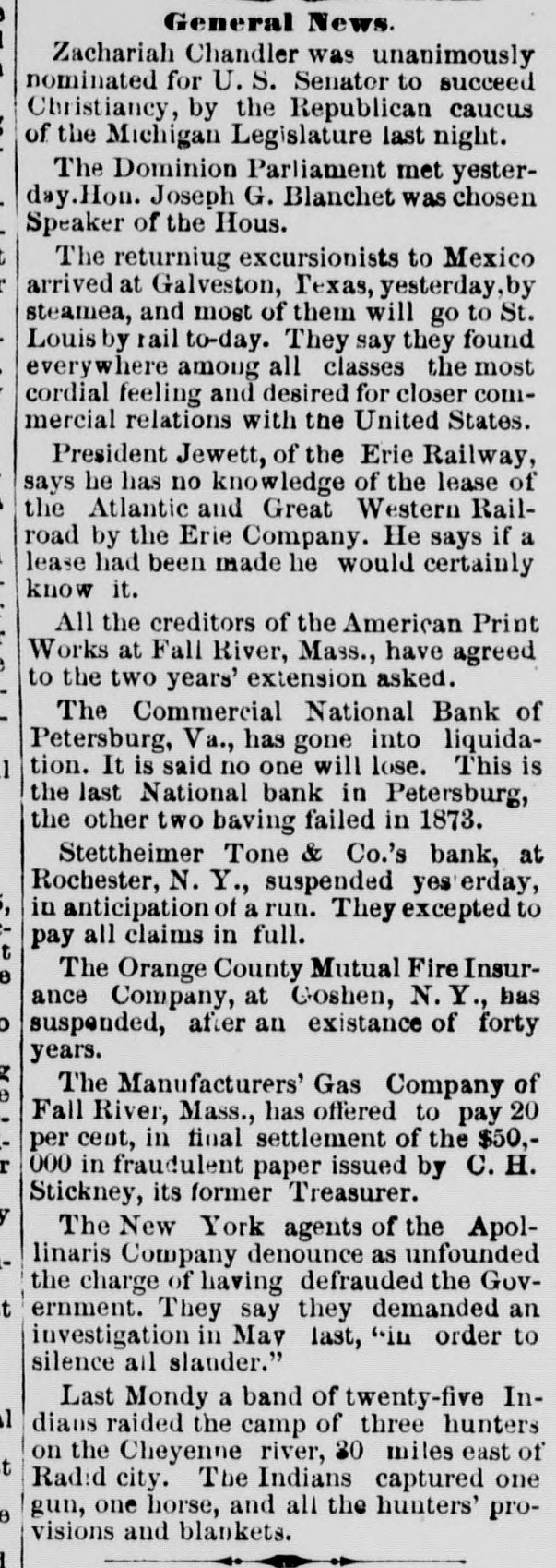 Electric Currents. The Charleston, S. C., races closed yesterday. Mrs. Martha Stair, aged eighty, died at Newark, O. The Canadian House convened at Ottawa yesterday. General Peel, the famous English turfman, is dead. Chas. R. Copeland, aged eighty-five, died at Dresden, O. George Norman, a boy, was killed by cars at Oaktown, Md. The Dairymen's Convention at Chicago closed last night. E. M. Hayes & Co., boots and shoes, failed at Anderson, Ind. Mrs. Zerilda Buchanan, a pioneer, died at Columbus, Ind. John Holmes, of Franklin, Ind., was killed by the cars. The cotton spinners at Remirmont, France, are striking. Mrs. Susan Richardson committed suicide at St. Joseph, Mo. Gottleib Brandt, aged sixty, was killed by cars at Hamden, Ohio. The Cherry Valley Iron Company have failed at Latonia, Ohio. Newton Smith, barn burner, gets two years at Franklin, Ind. Young Gonzales was murdered by a horse thief near Stockton, Texas. The houses over the Kohinoor mines at Pottsville, Pa., are sinking. Five Judges of Election were convicted and sentenced at Baltimore. Herr Forckenbeck has been elected President of the German Reichstag. Spencer Penn, another of the McKimmie gang, was arrested at Hillsboro, Ohio. Several passengers were injured by a railroad collision near St. Vincent, Can. John Whitlow was crushed to death in a coal mine, at Campbell's Creek, W. Va. John Dunford, at Pleasant Lake, Ind., married a widow, took laudanum and died. Pinckney, Jackson & Co., spices, New York, have suspended. Liabilities, $110,000. Jacob P. Sampson, foreman of the Cleveland Industrial School Farm, was killed by cars. An oven in the chemical works at Jackson, Mich., exploded, killing Henry Kreiger. The liabilities of Louis S. Black & Co., traders, of Montreal, who failed, are $200,000. The Commercial National Bank, the last National Bank in Petersburg, Va., has gone into liquidation. Marie Azurine, trapeze performer, fell and broke her collar-bone at Detroit. She will probably die. Abe Rothschild's case will not come up again until next October. He is still in jail at Marshall, Texas. Rogers' Locomotive Works and Barlowe's Flax and Jute Mills burned at Paterson, N. J., last night Loss $150,000. Bud. Law shot and killed H. L. Maylock, at a party near Springfield, Mo. Law was arrested but afterwards escaped. A boiler exploded at Buffalo, N. Y., demolishing the De Long Forge and Iron Works Building. Nobody hurt. Dike French and George Bruesteter, two roughs, outraged Mrs. Spery, at Andover, Ohio. Citizens threatened to lynch them. Samuel Bennett and John Rudder were killed, and Danielsand "Crazy Joe" injured by an explosion in the Giant Mine, Ontonagon, Mich. Joseph Haser, Ex-Mayor of Galena, Ill., and proprietor of a large brewery in that city, was arrested on the charge of using second-hand beer stamps. Augustine Marty, aged seventeen. stabbed and killed Wm. Patterson, a colored burglar, who entered the store where Marty was sleeping, at Kansas City, Mo. Ex-Auditor William H. Heath, of St. Louis, found guilty of embezzling school funds to the amount of $142,000, confesses that he gambled the money away.